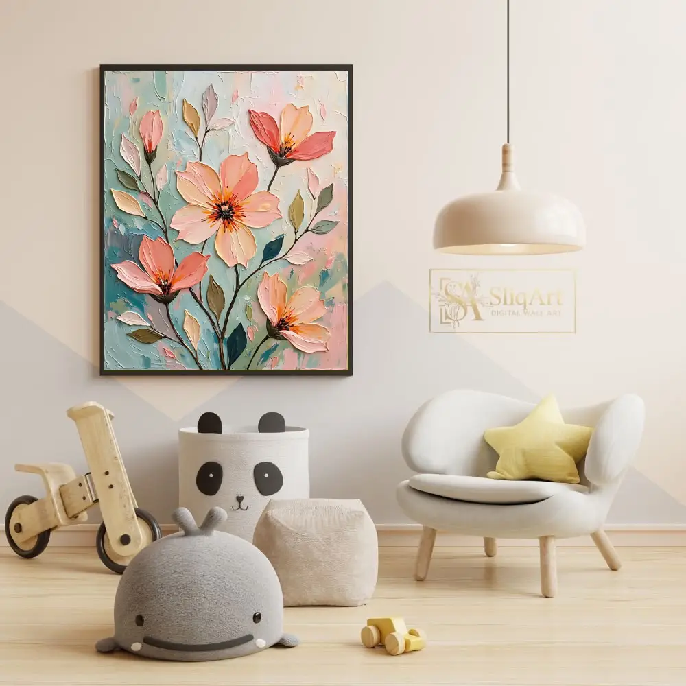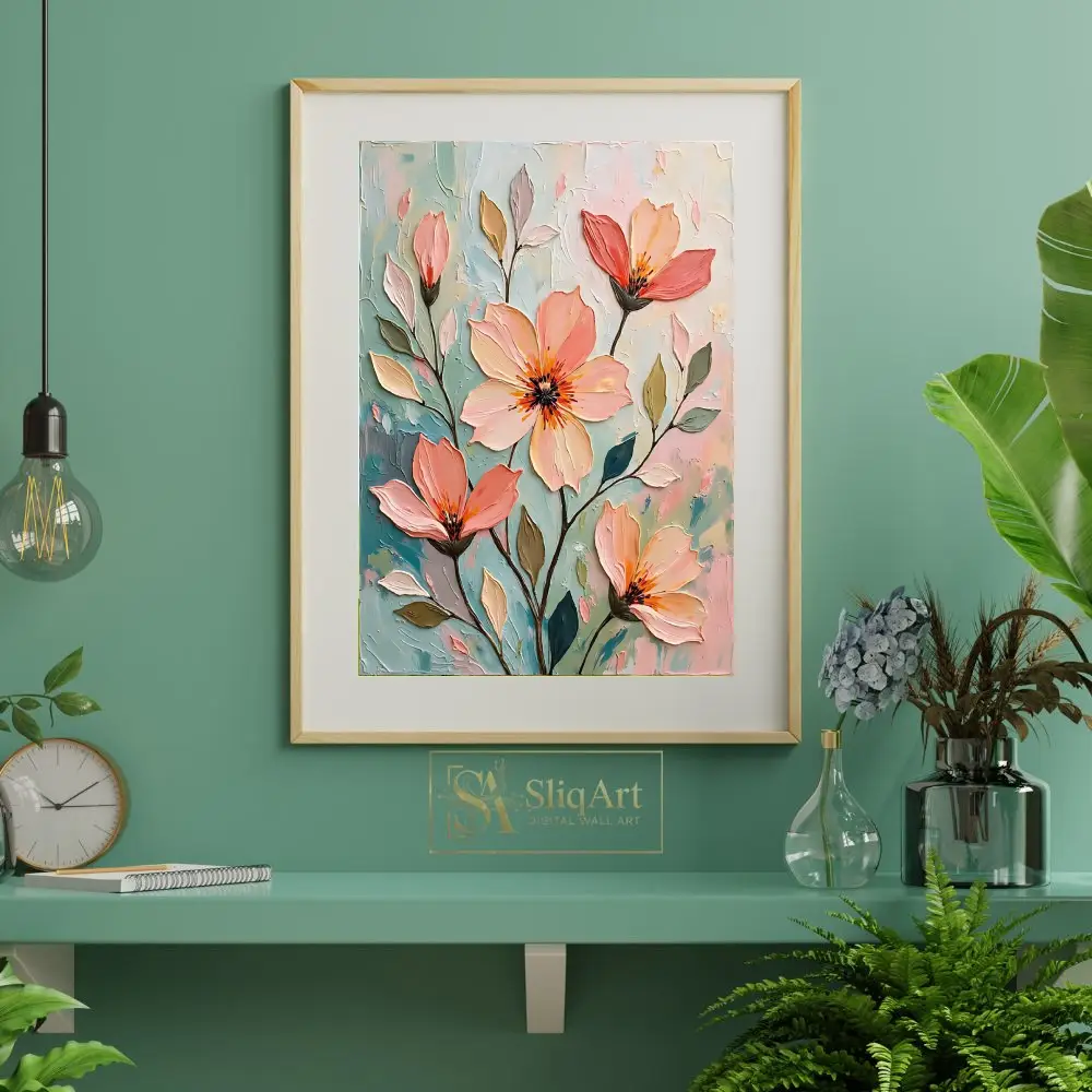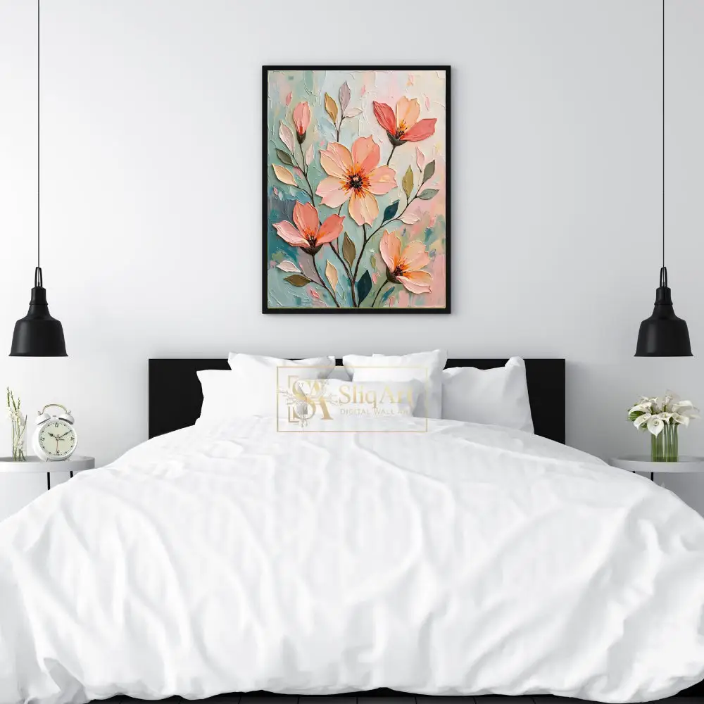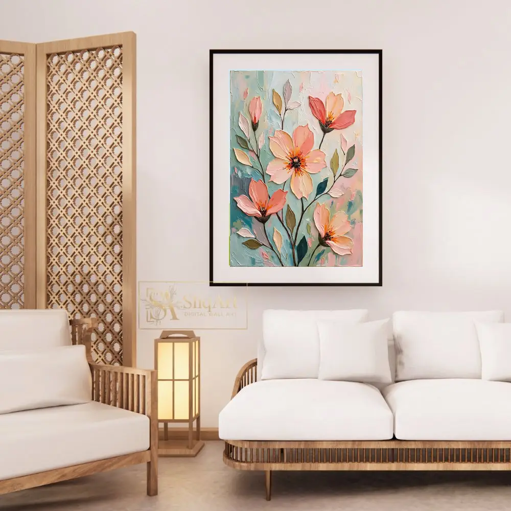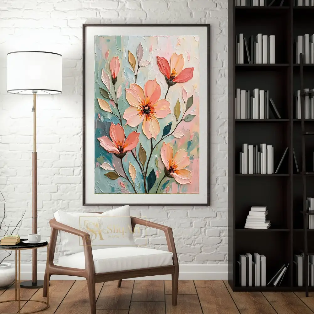 Elevate your interior design with this exquisite impasto floral painting. This piece features vibrant peach and salmon-colored blossoms brought to life through thick, expressive palette knife strokes that create a rich, tactile experience.