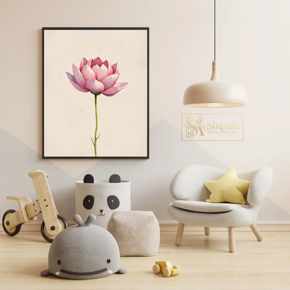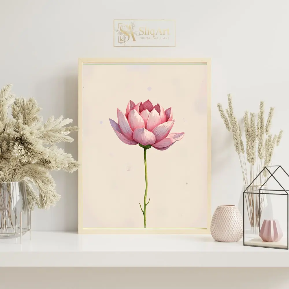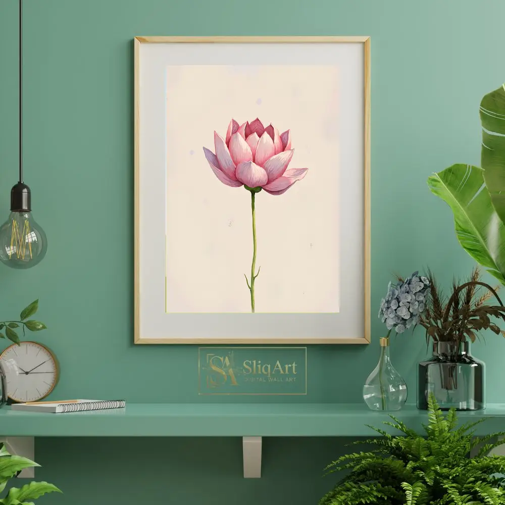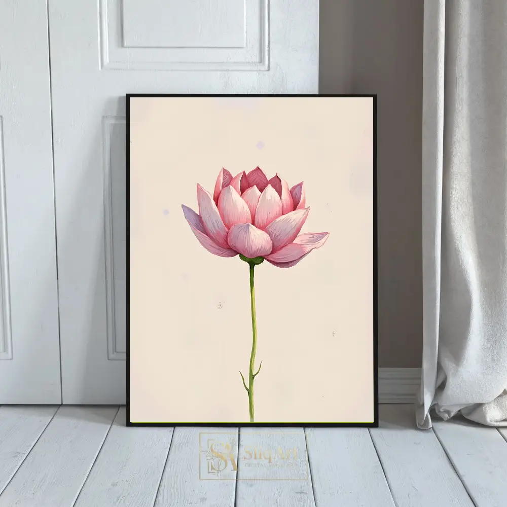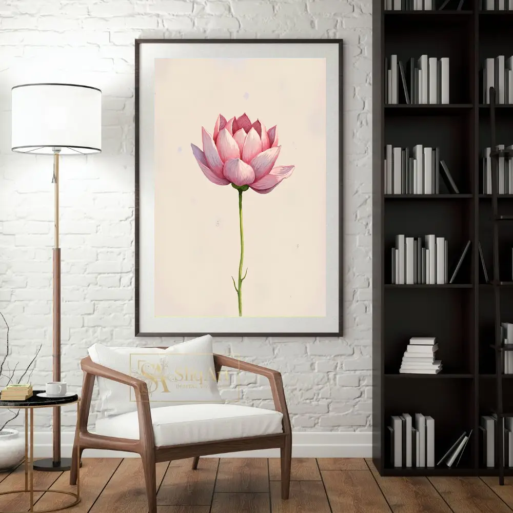 Transform your space into a peaceful retreat with this exquisite botanical illustration of a blooming pink lotus. Rendered with soft, painterly textures, the delicate petals transition from vibrant magenta to gentle blush, standing tall on a slender green stem.