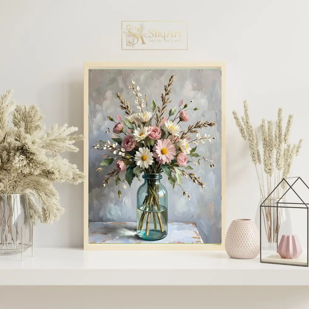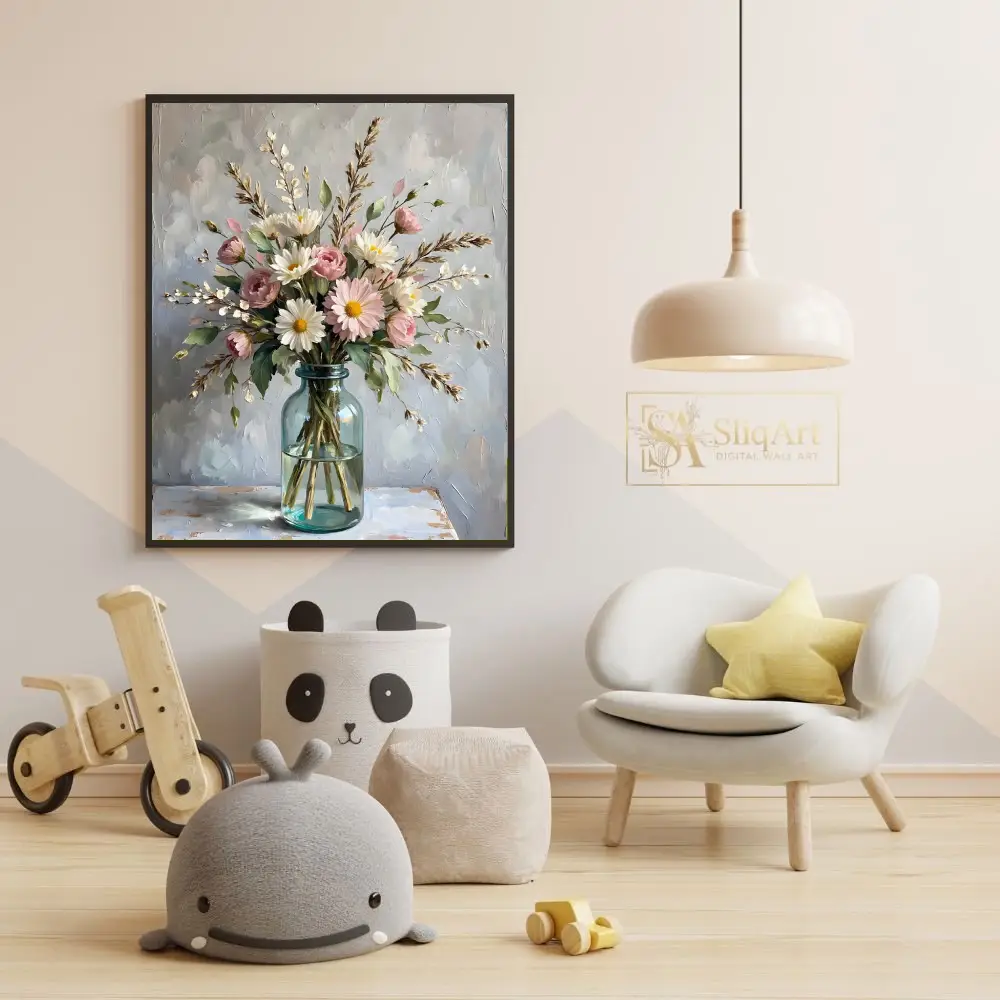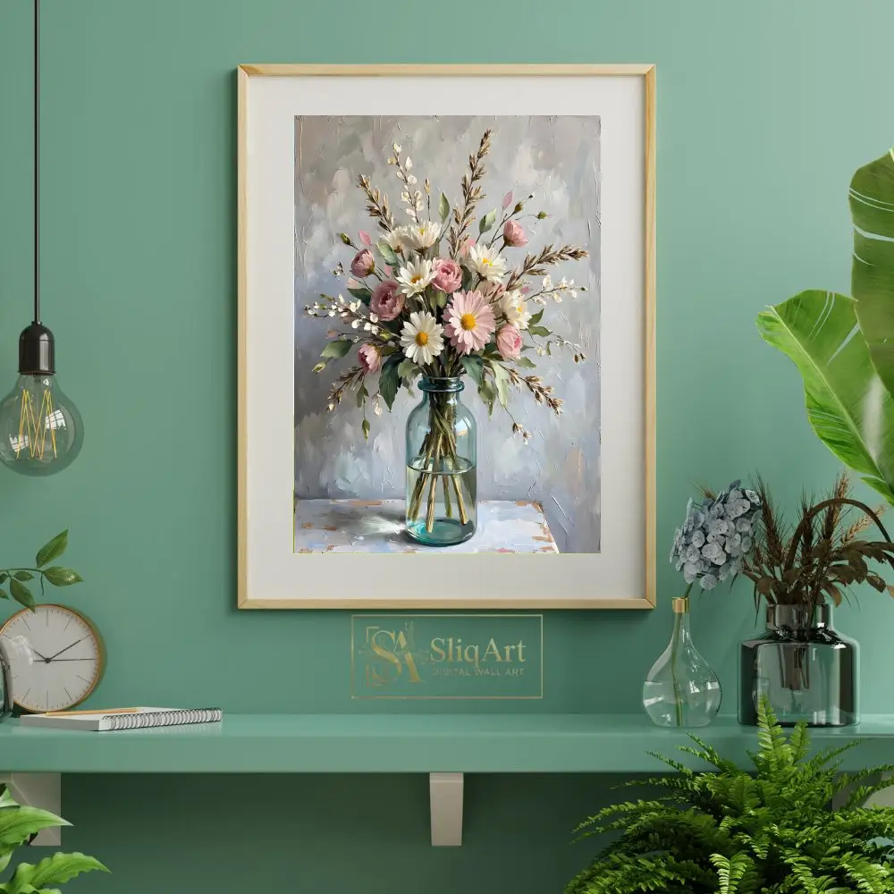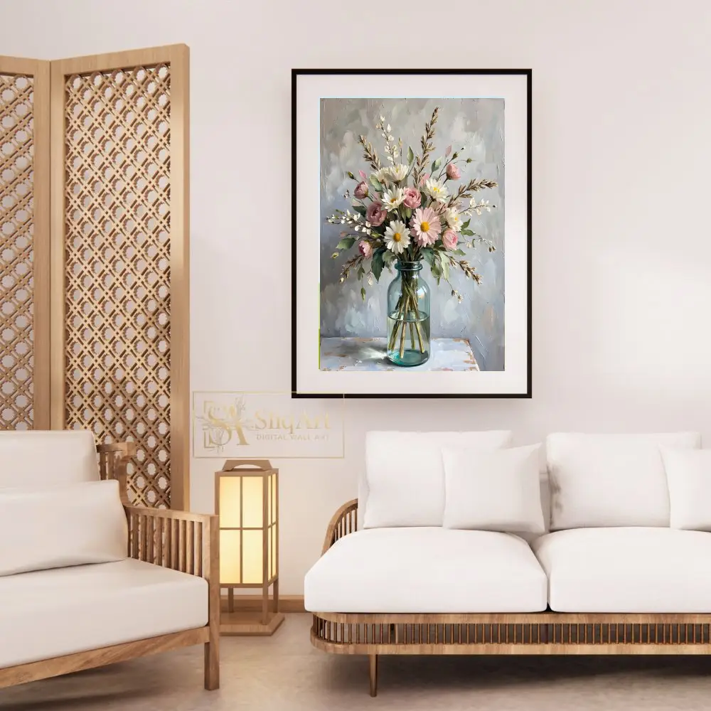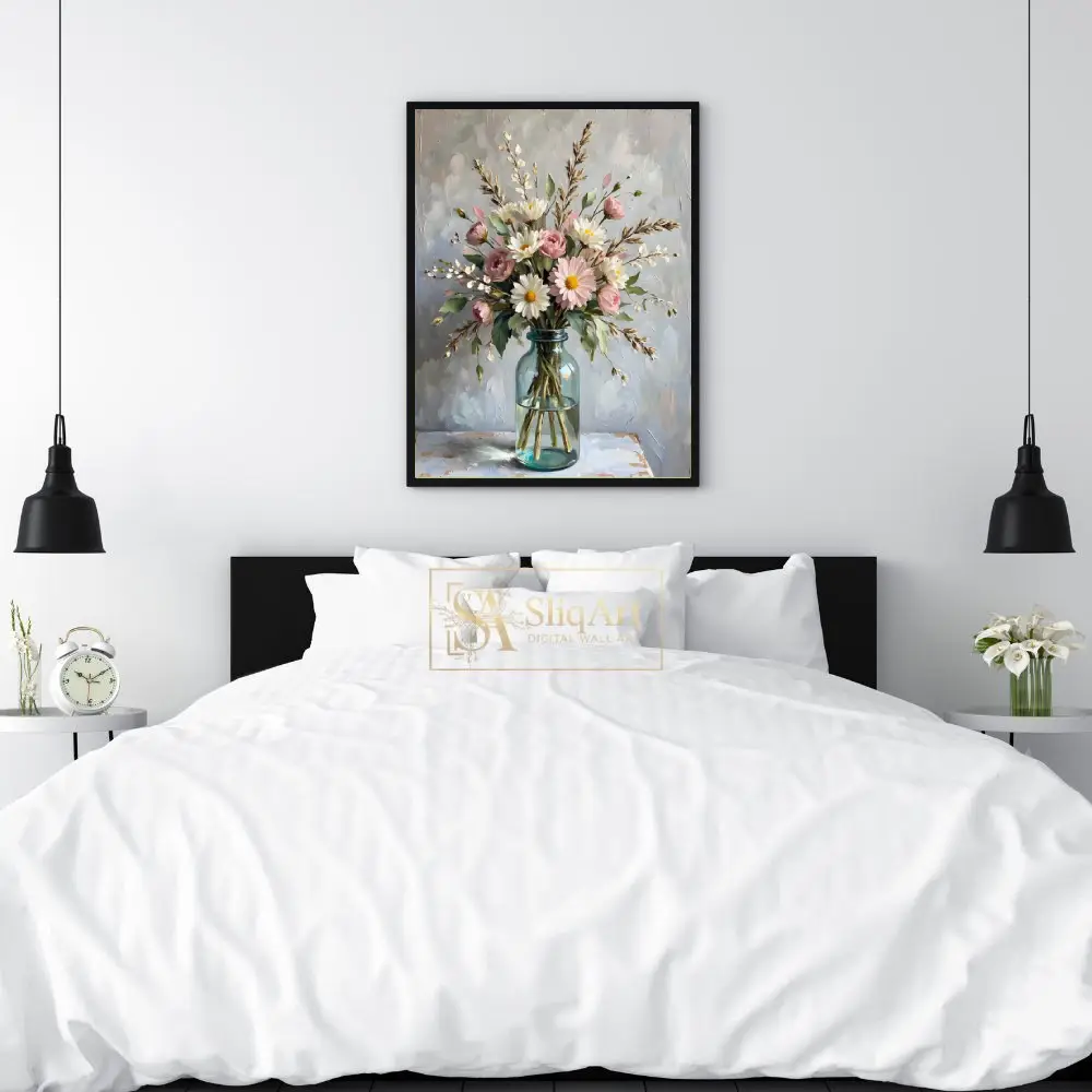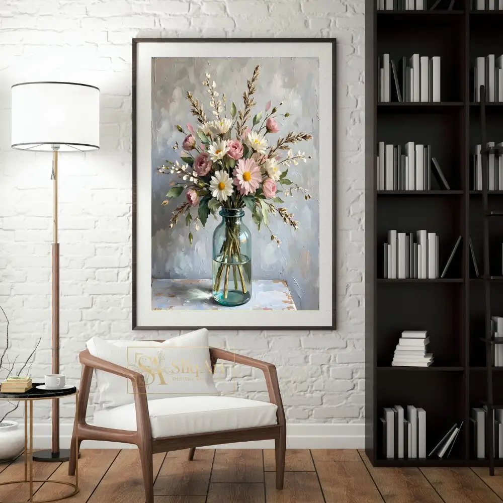 Experience the tranquility of a spring morning with this stunning impressionist-style painting. The artwork features a lush arrangement of soft pink roses and bright white daisies, accented by delicate sprigs and lush greenery.