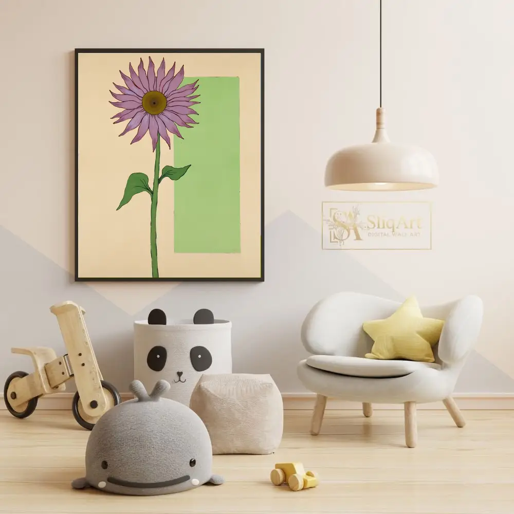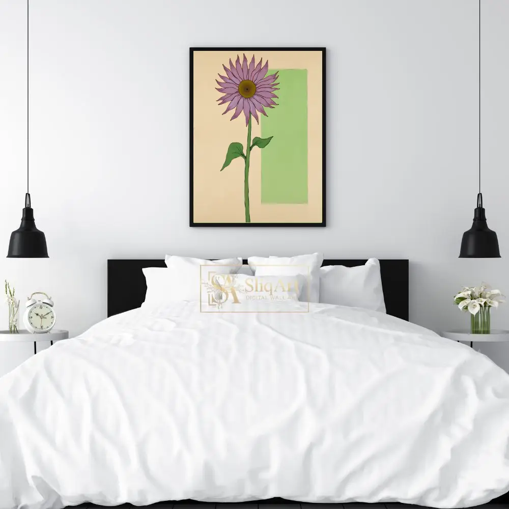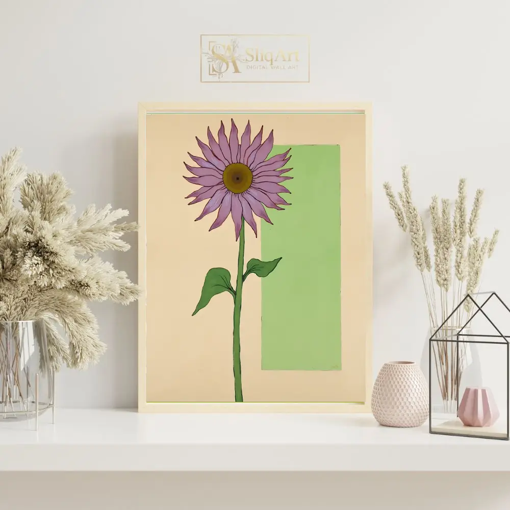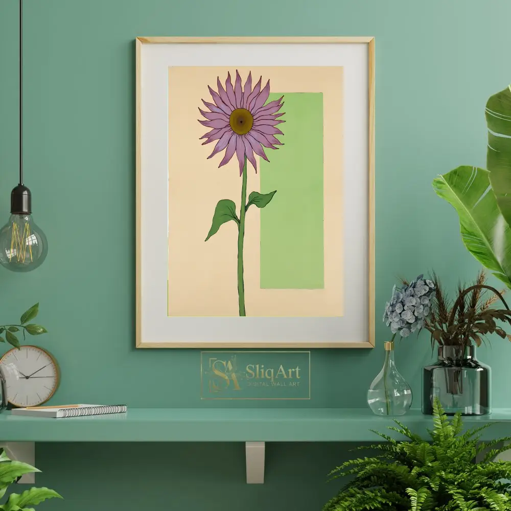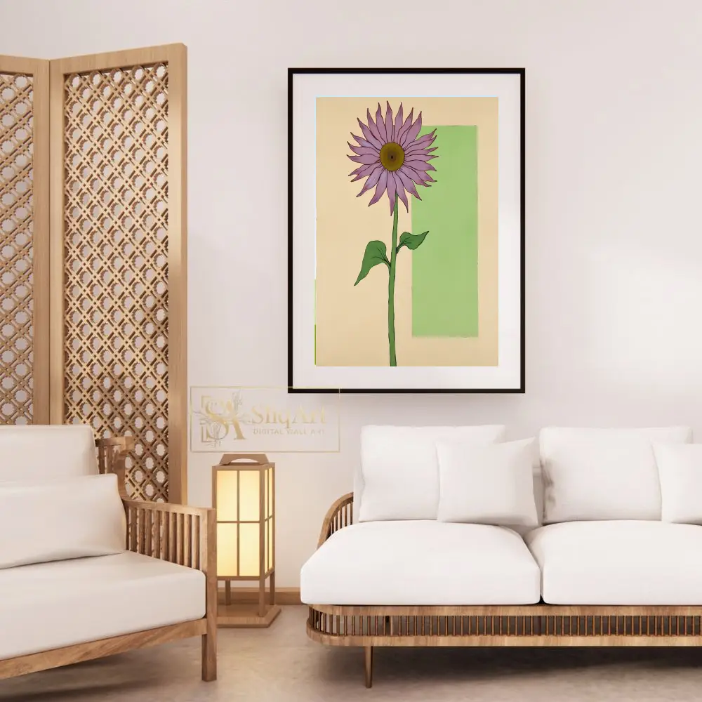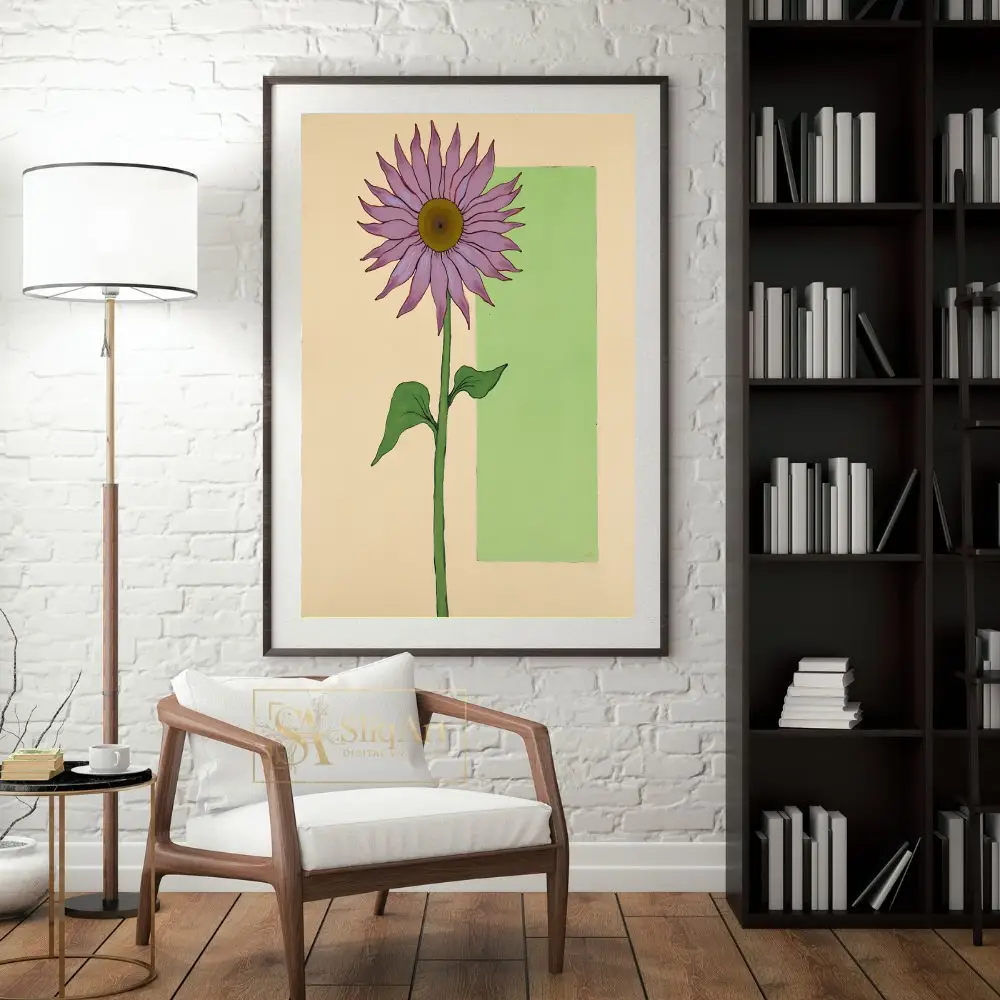 Infuse your interior with the serene beauty of this modern minimalist floral artwork. The piece centers on a stylized purple flower, its long stem and vibrant petals standing tall against a dual-toned background of soft cream and a sharp lime green rectangle.