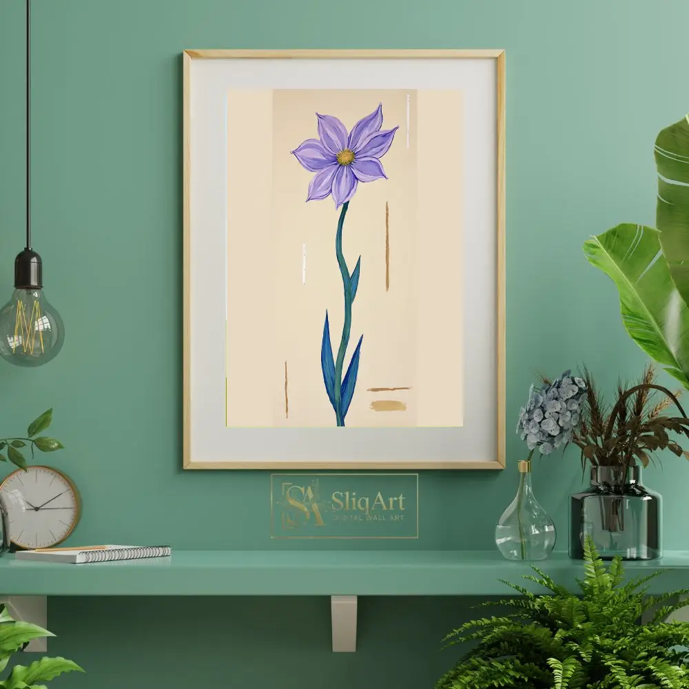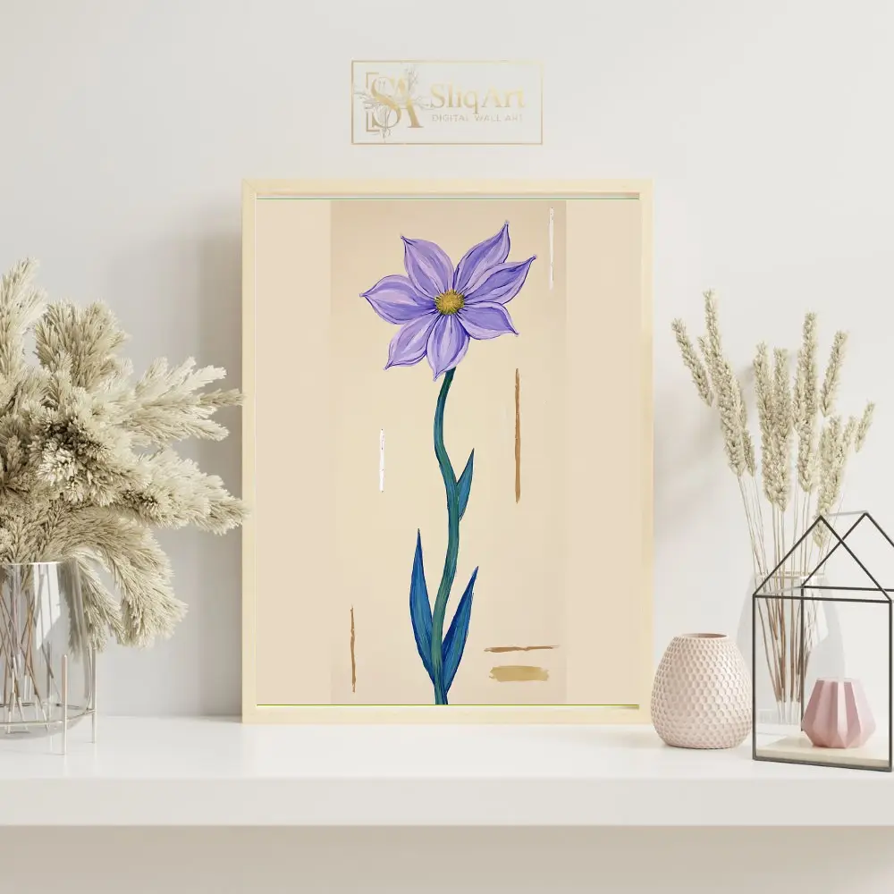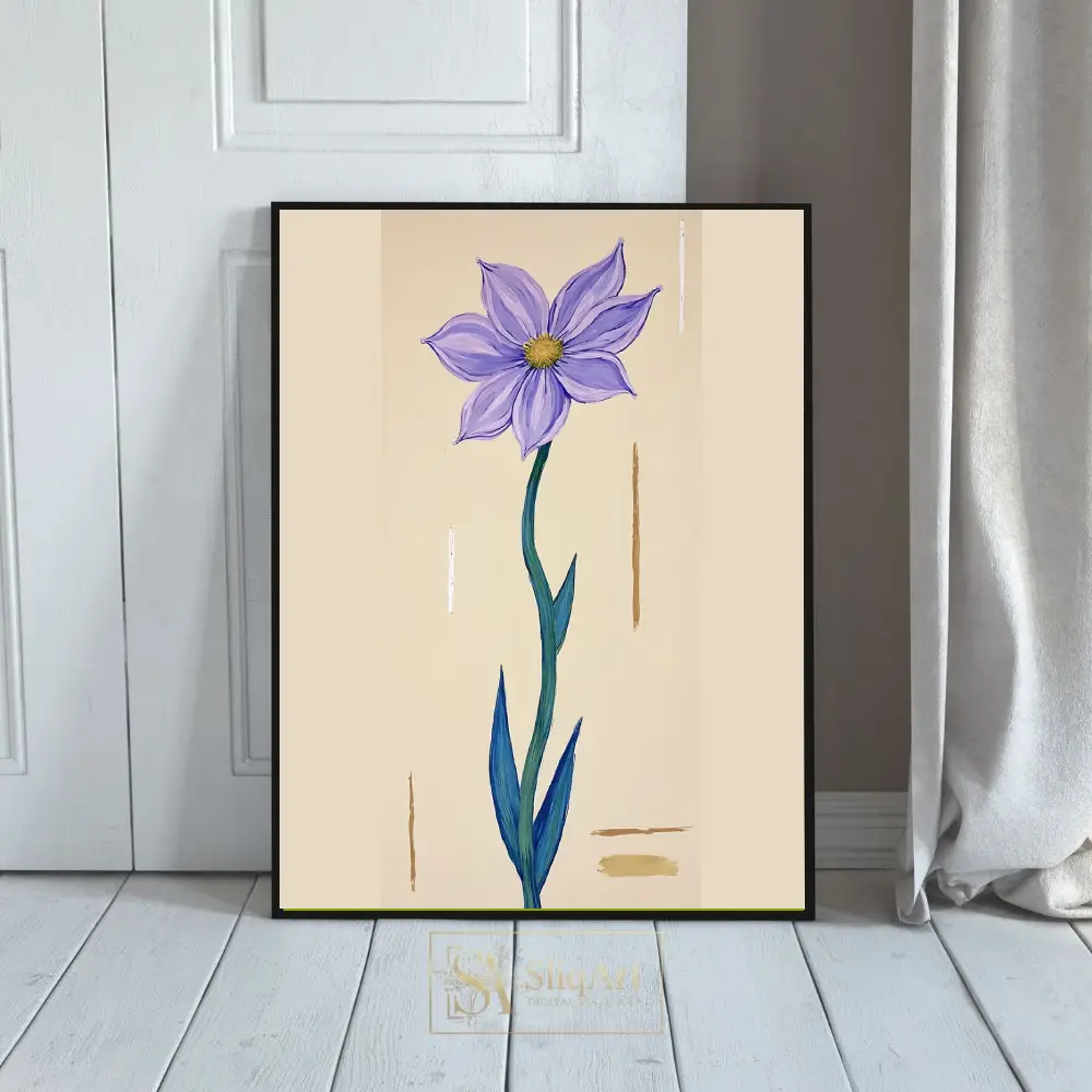 Elevate your interior decor with this stunning hand-painted botanical masterpiece. Featuring a single, vibrant purple flower perched atop a slender, gracefully curved stem, this piece combines natural beauty with modern minimalism.