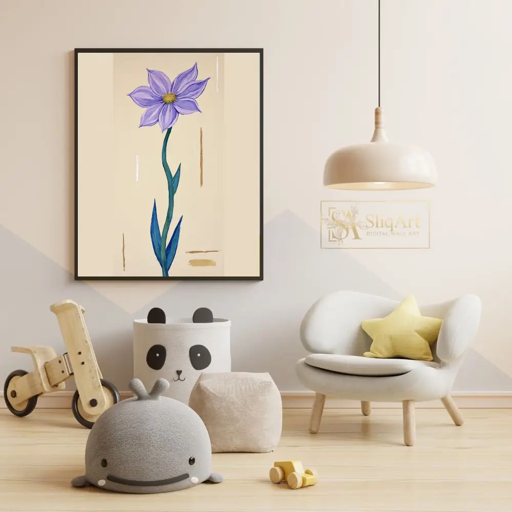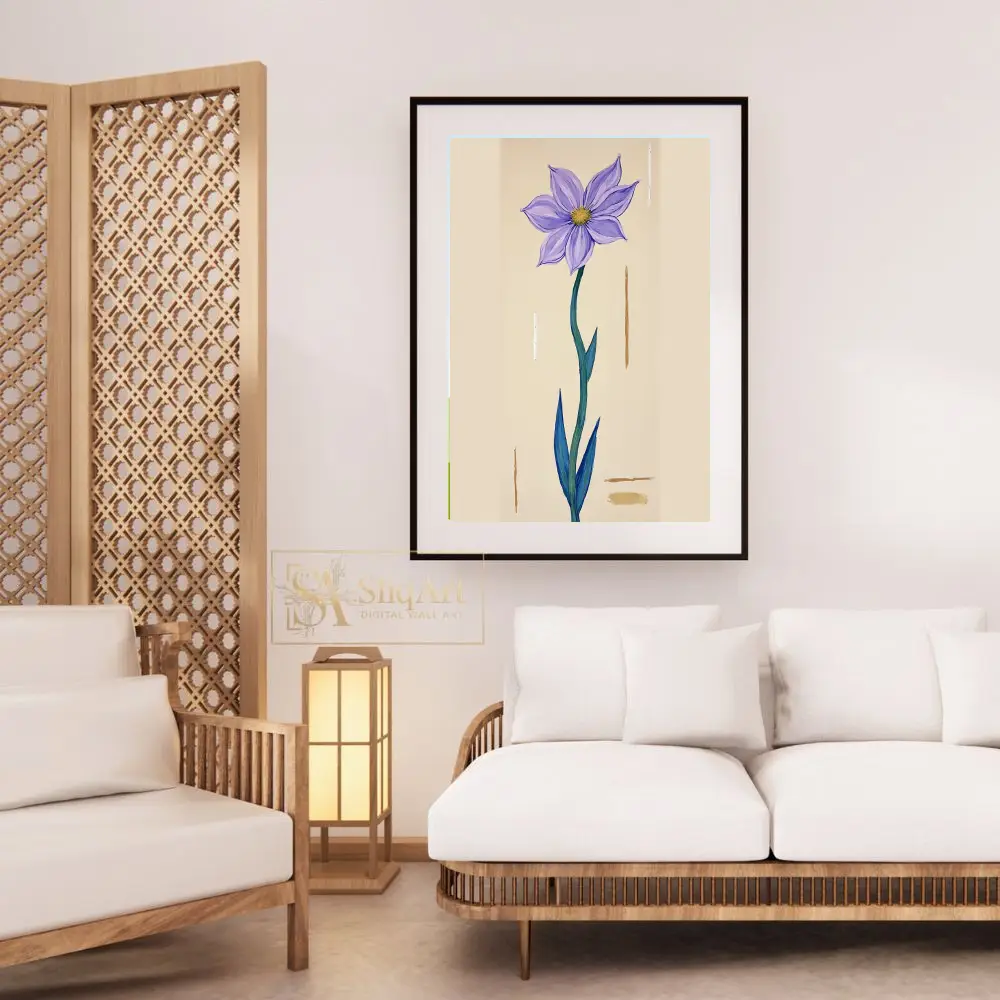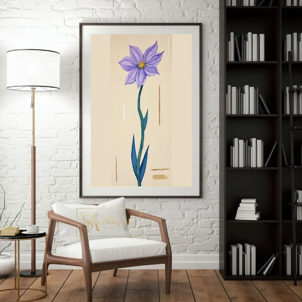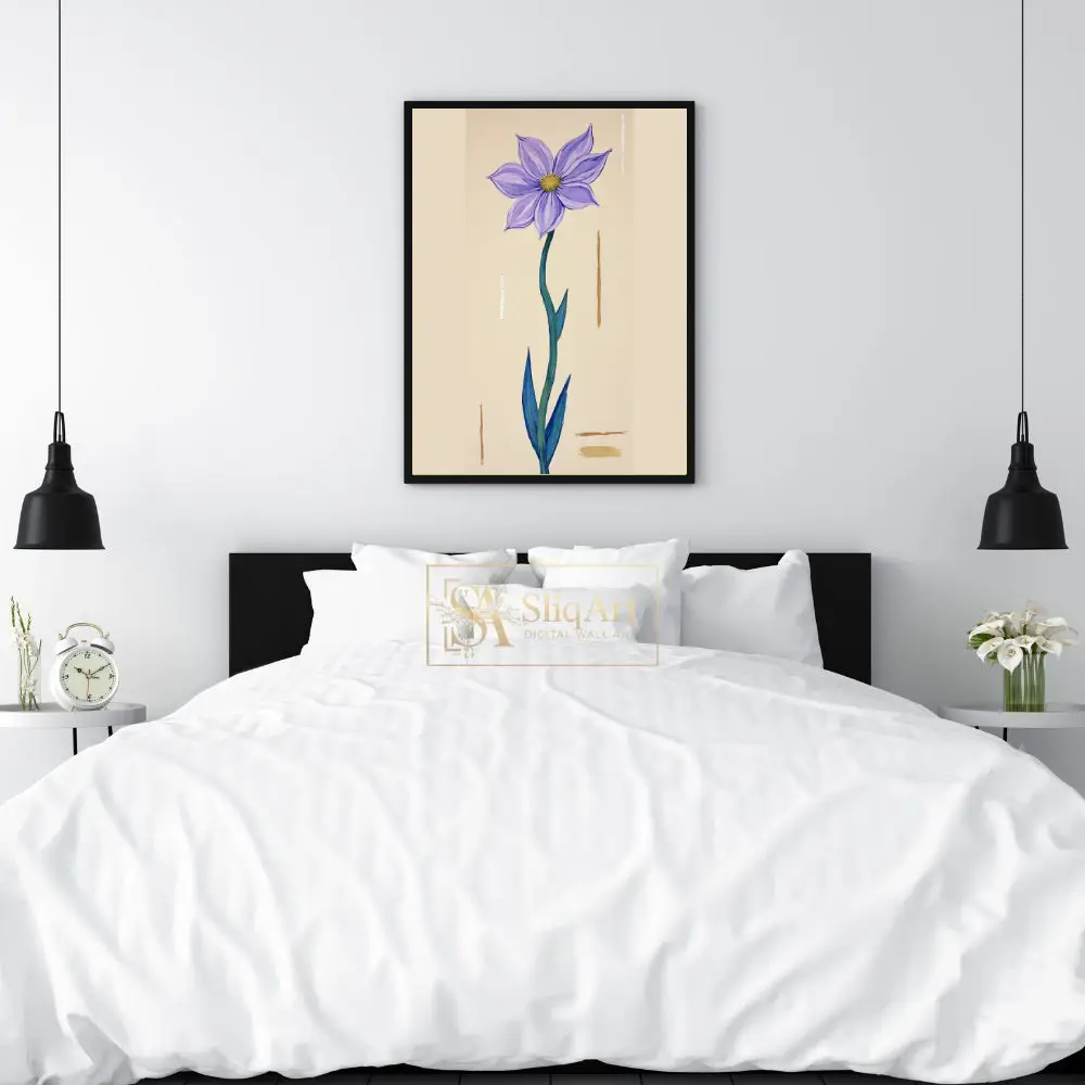 Elevate your interior decor with this stunning hand-painted botanical masterpiece. Featuring a single, vibrant purple flower perched atop a slender, gracefully curved stem, this piece combines natural beauty with modern minimalism.