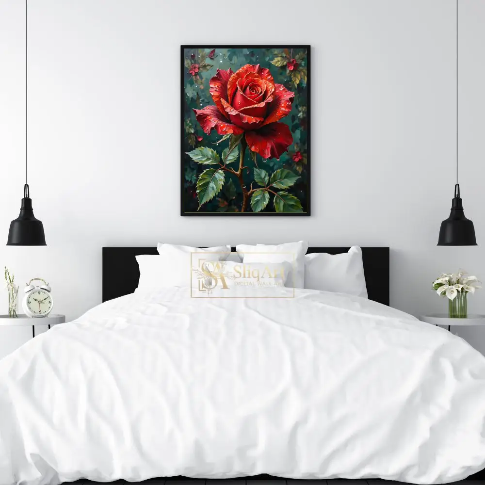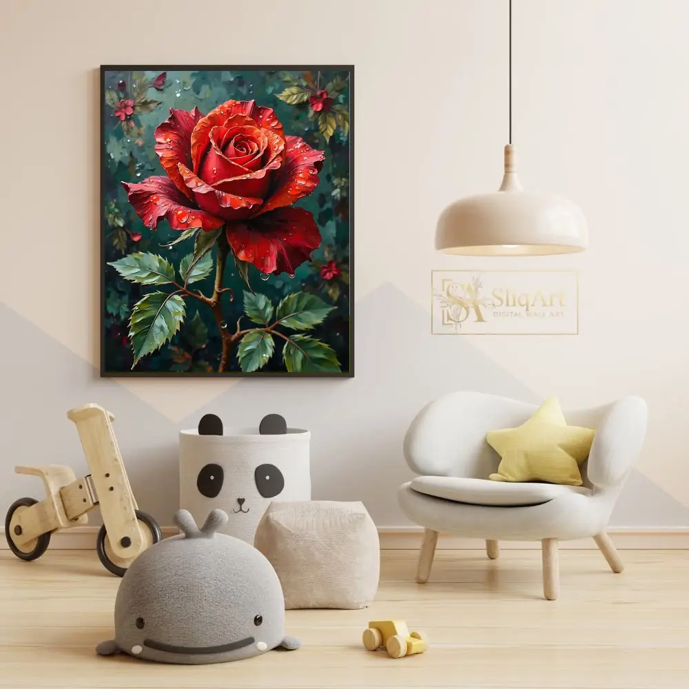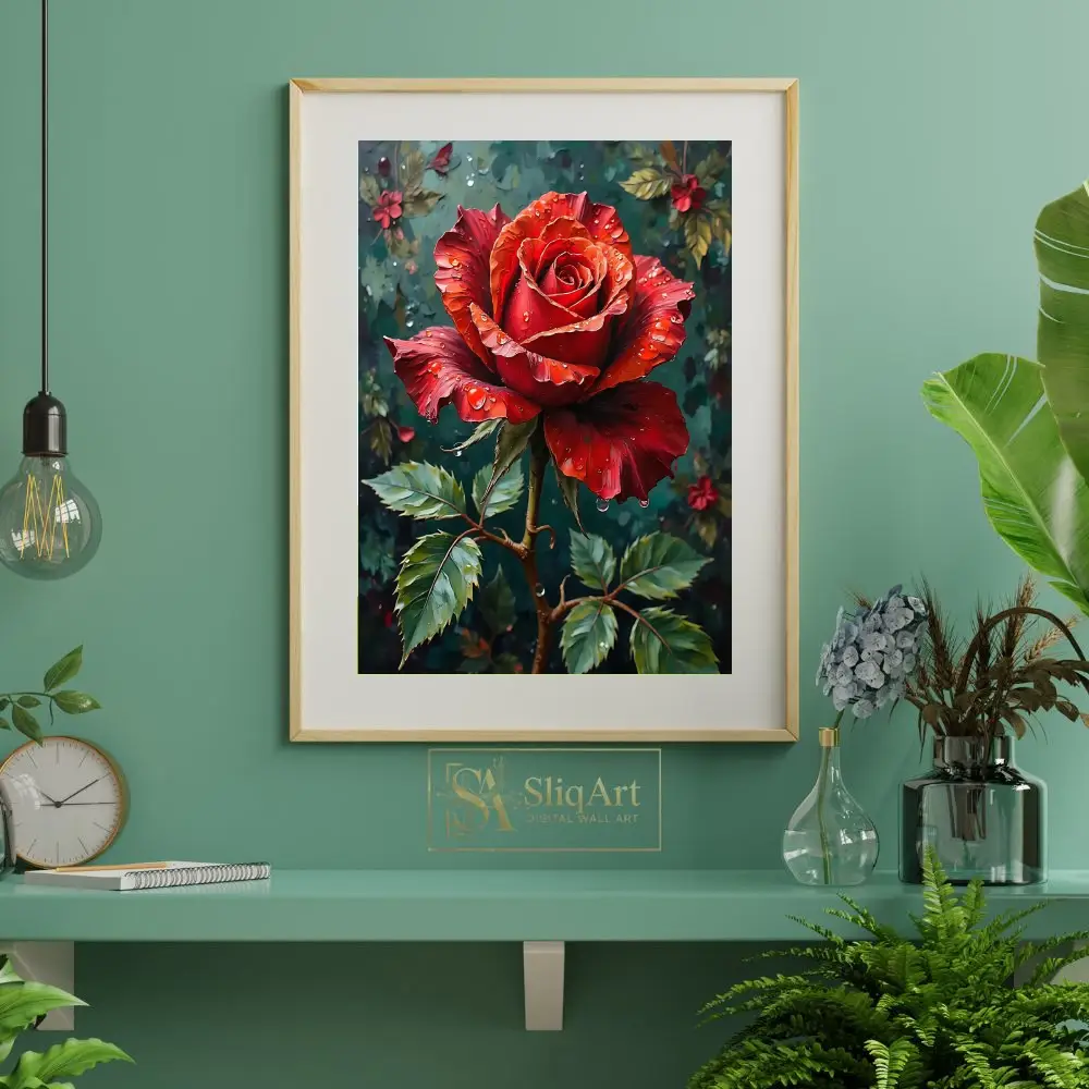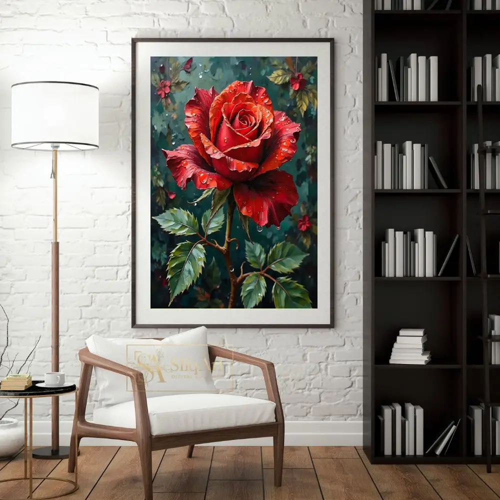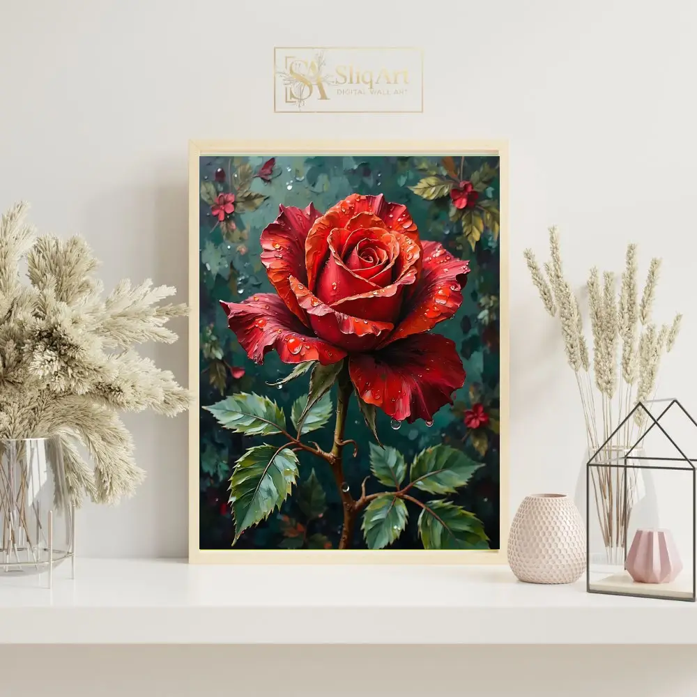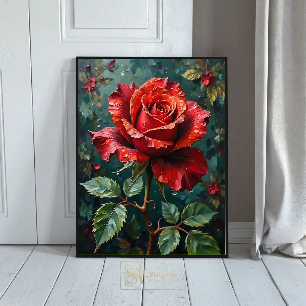 Capture the essence of romance and natural elegance with this striking digital painting of a deep red rose. Adorned with glistening water droplets that catch the light, the rose’s velvety crimson petals are rendered with rich texture and depth.