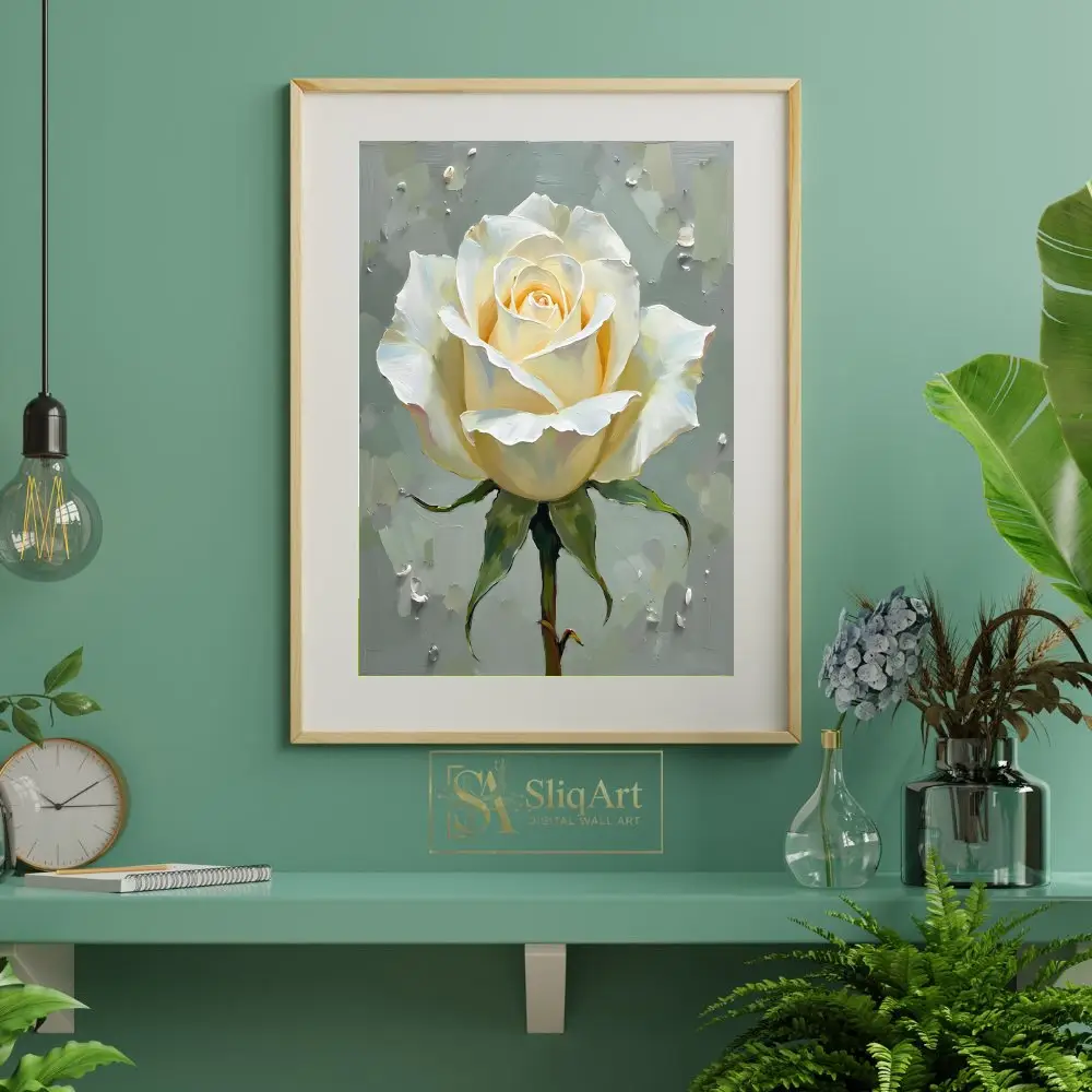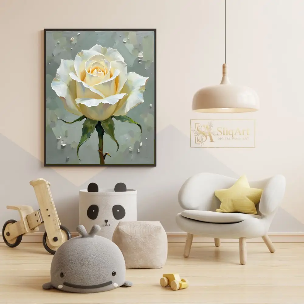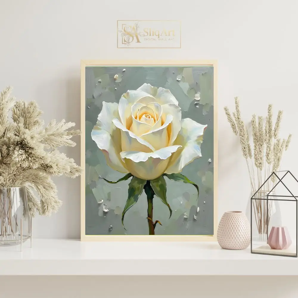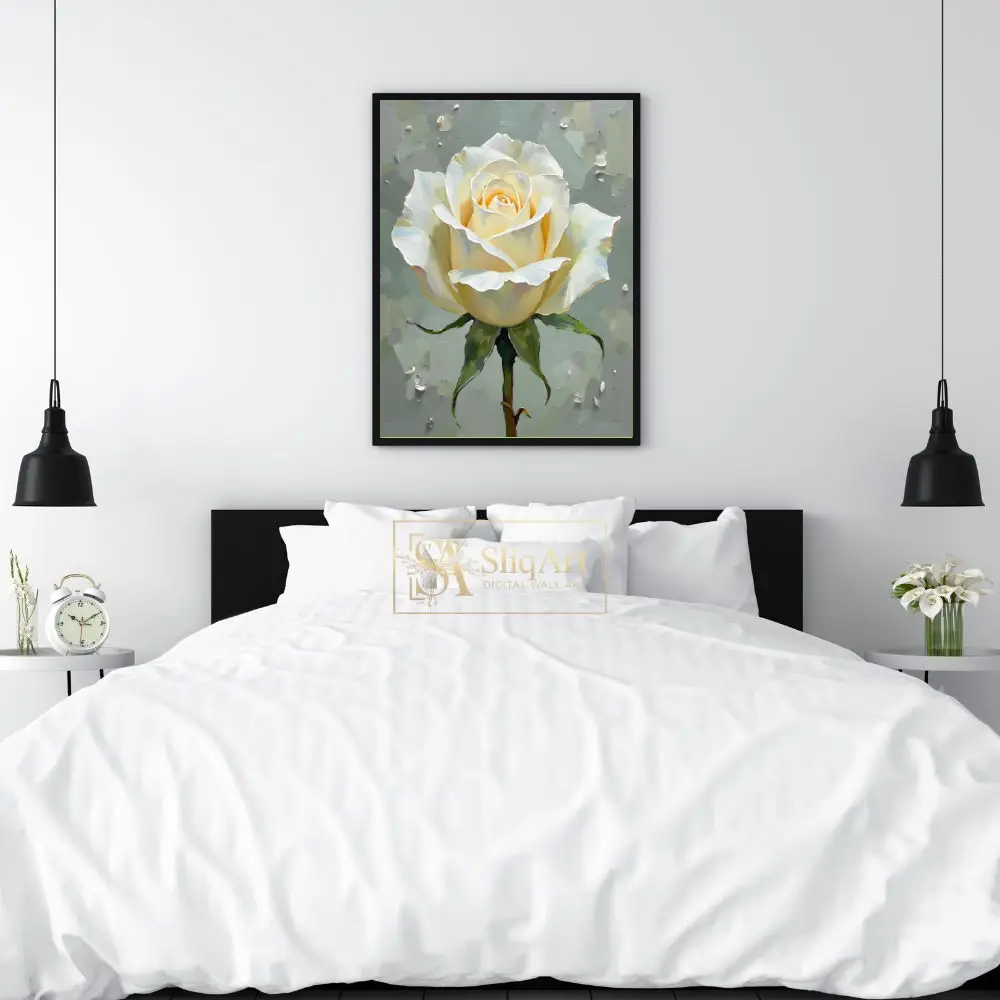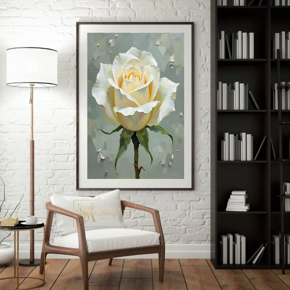 Experience the serene beauty of a single, radiant white rose captured in exquisite detail. This piece utilizes heavy, textured brushstrokes to create a sense of depth and life, making the delicate petals appear to lift off the canvas.