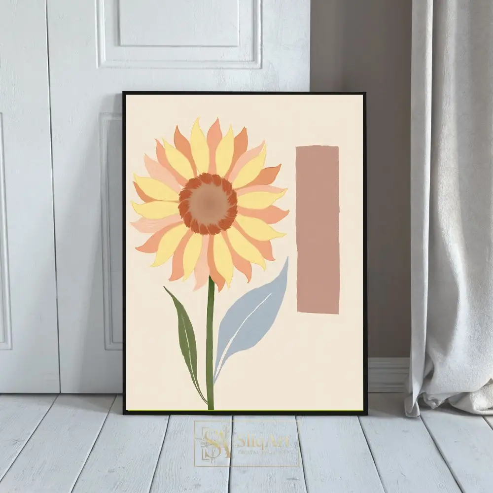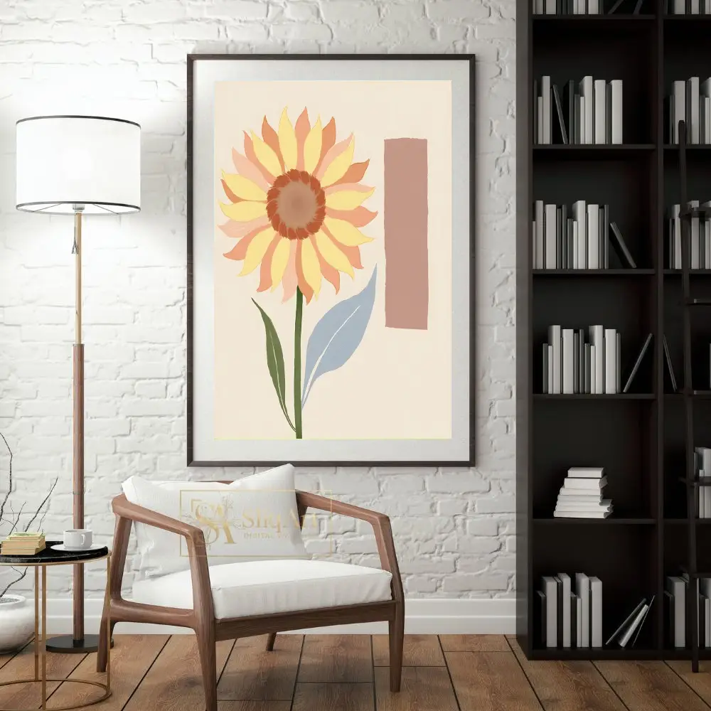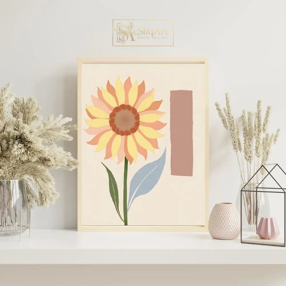 Infuse your space with the warmth of a summer afternoon with this Minimalist Boho Sunflower wall art. This piece features a beautifully stylized sunflower rendered in a sun-drenched palette of ochre, peach, and terracotta.