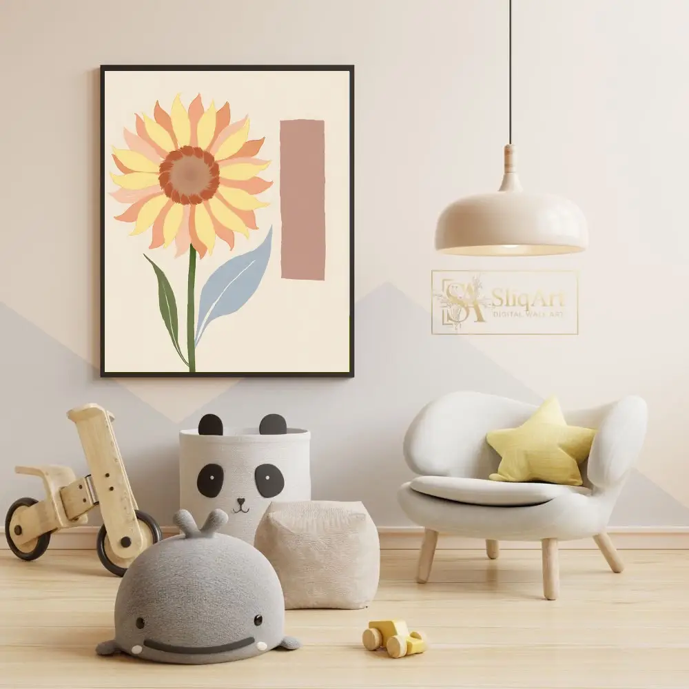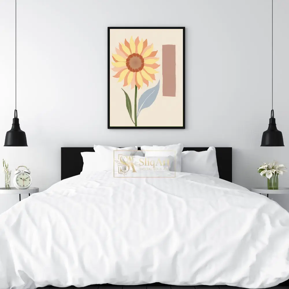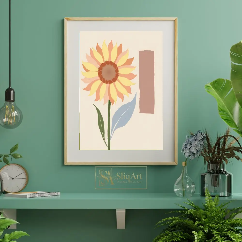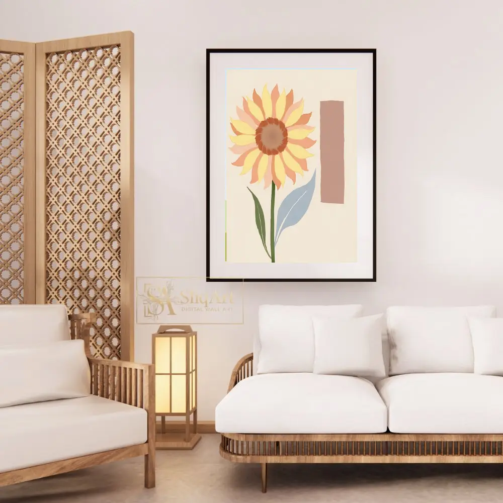 Infuse your space with the warmth of a summer afternoon with this Minimalist Boho Sunflower wall art. This piece features a beautifully stylized sunflower rendered in a sun-drenched palette of ochre, peach, and terracotta.
