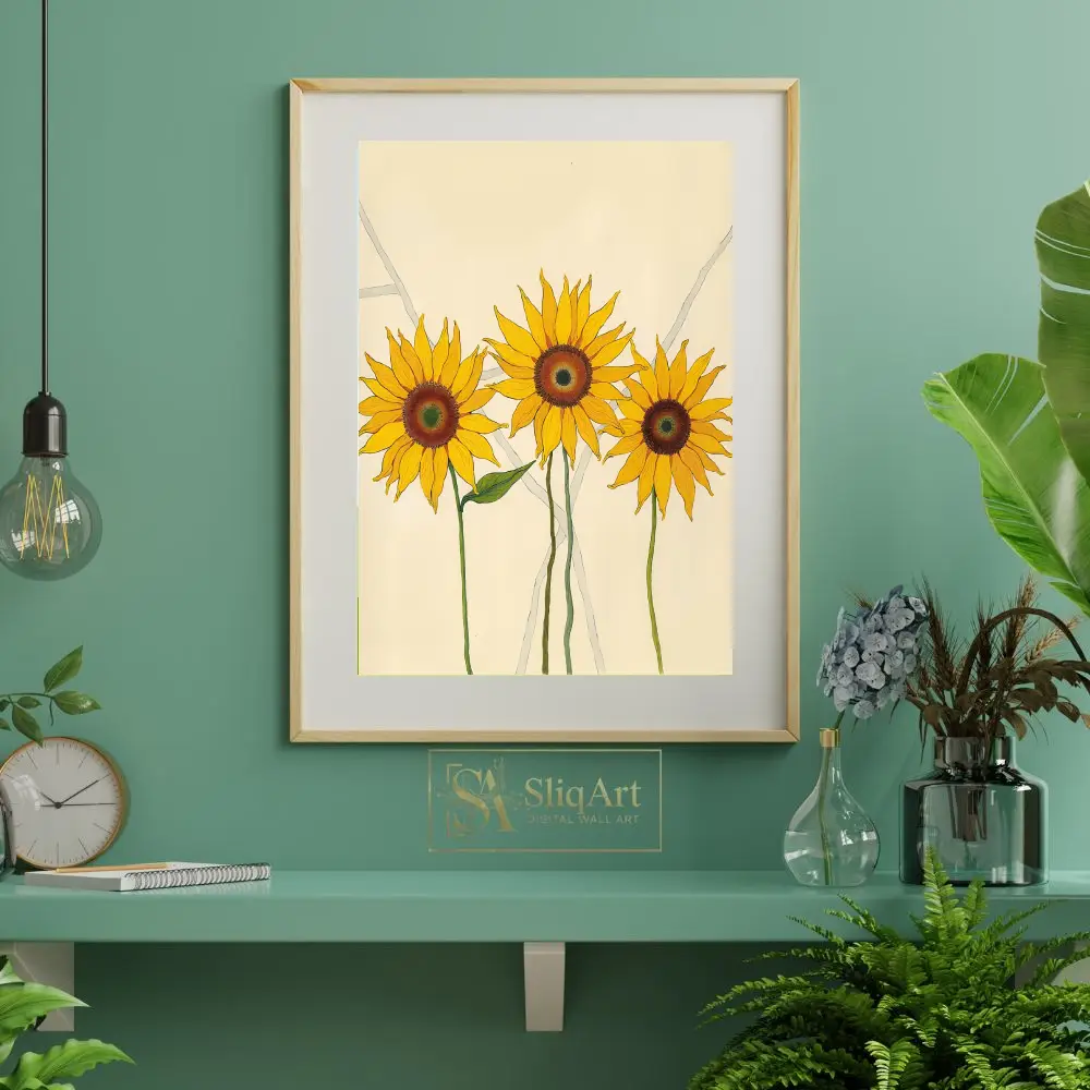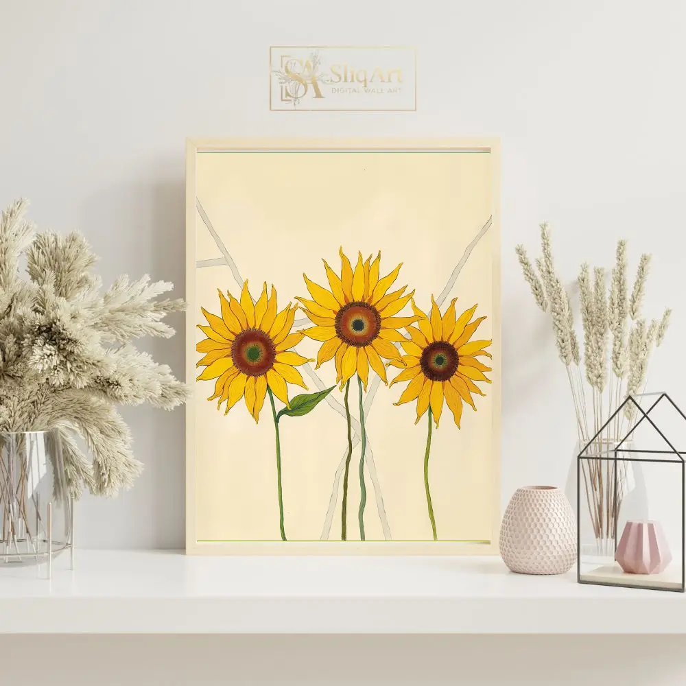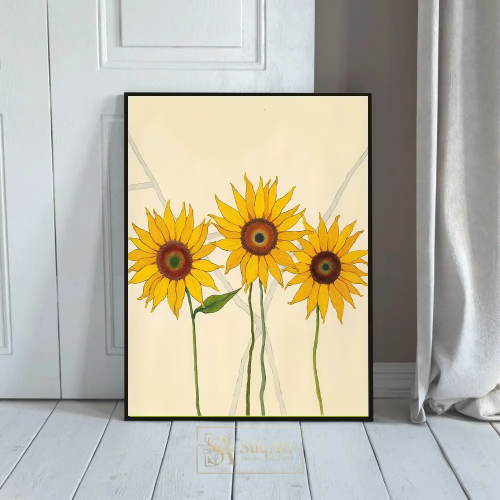 Featuring three vibrant sunflowers rendered in bold yellows and deep ambers, this piece uses clean lines and a minimalist aesthetic to celebrate nature’s simple beauty. The soft cream background and subtle grey geometric accents provide a modern, sophisticated contrast that allows the radiant blooms to take center stage, making it an ideal choice for contemporary and Scandi-inspired homes.