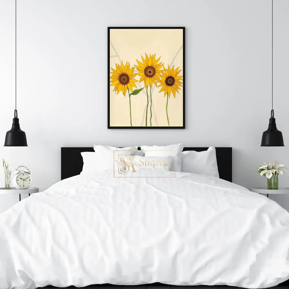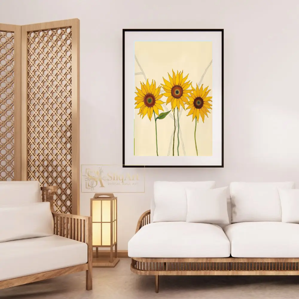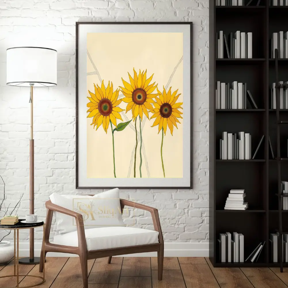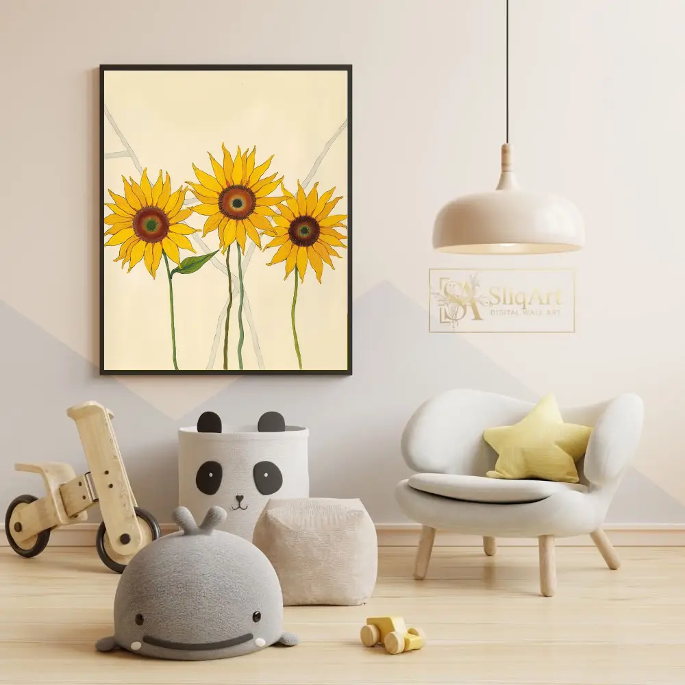 Featuring three vibrant sunflowers rendered in bold yellows and deep ambers, this piece uses clean lines and a minimalist aesthetic to celebrate nature’s simple beauty. The soft cream background and subtle grey geometric accents provide a modern, sophisticated contrast that allows the radiant blooms to take center stage, making it an ideal choice for contemporary and Scandi-inspired homes.