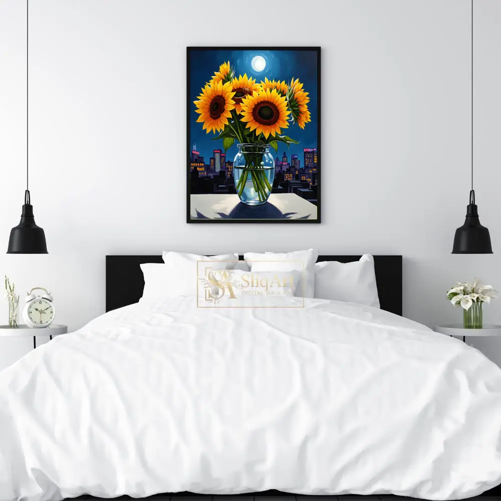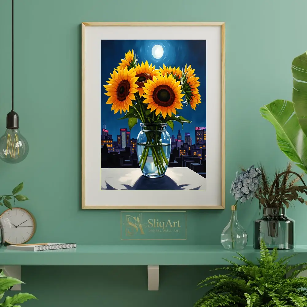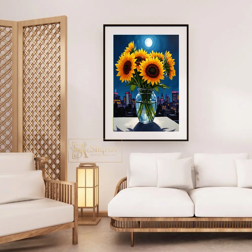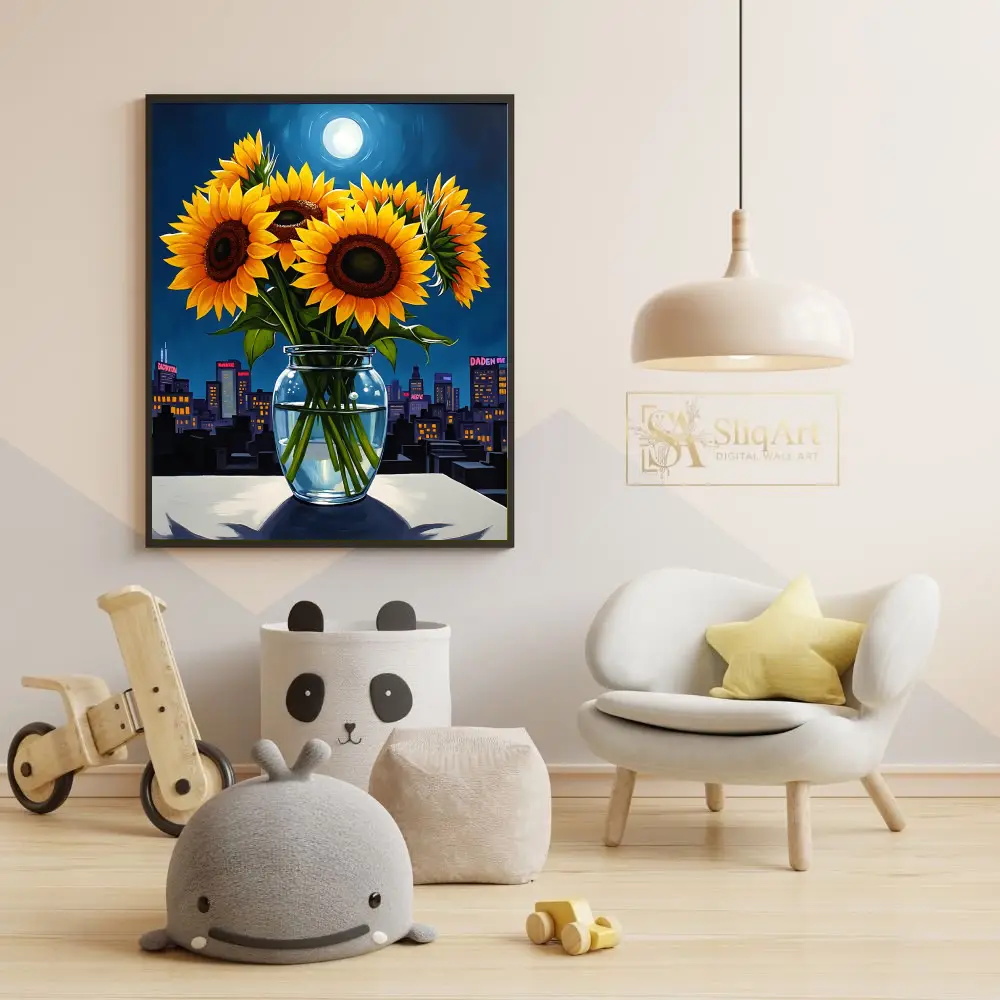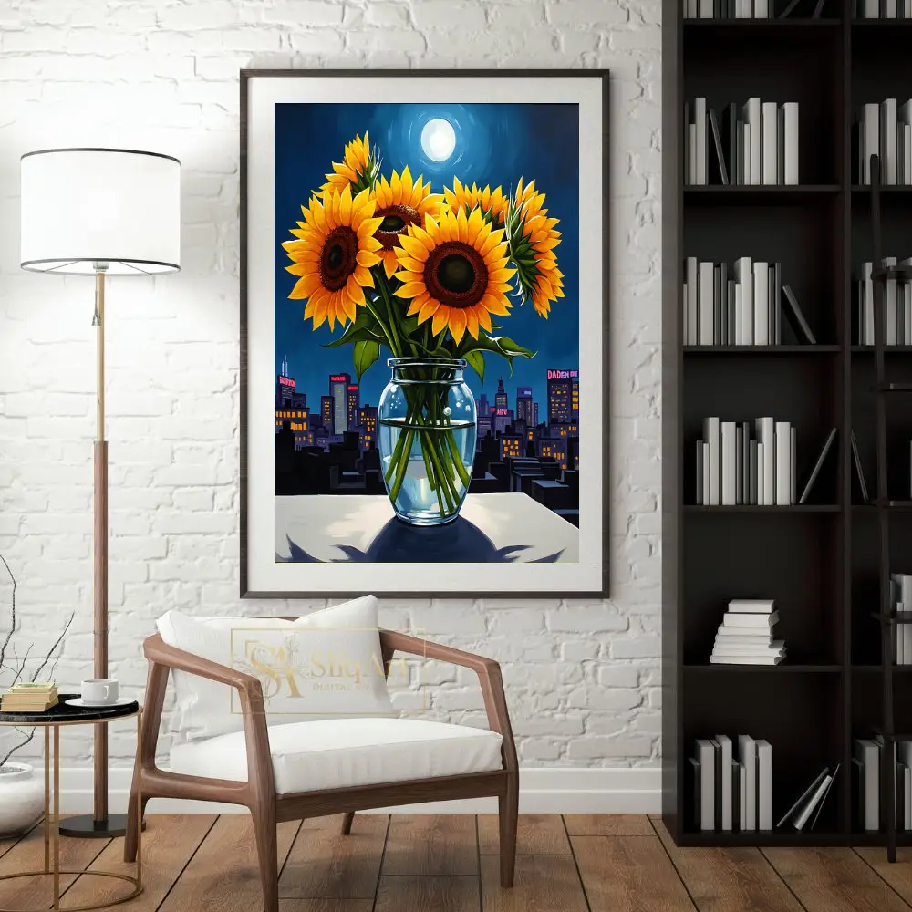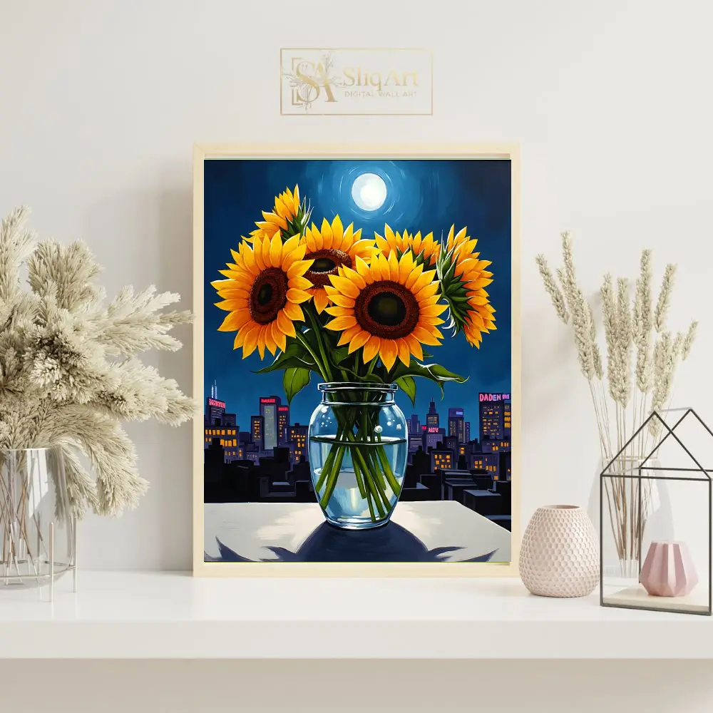 This stunning artwork captures a bouquet of radiant yellow sunflowers set against a serene moonlit city backdrop.