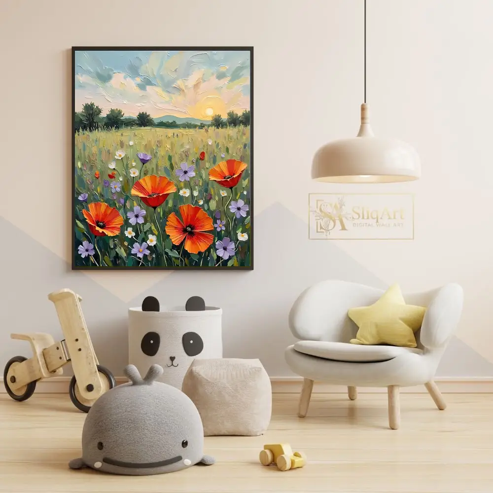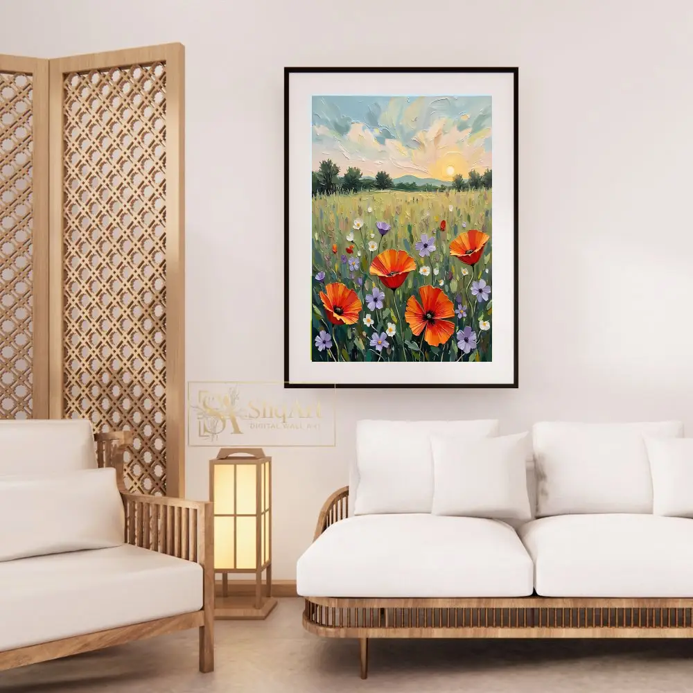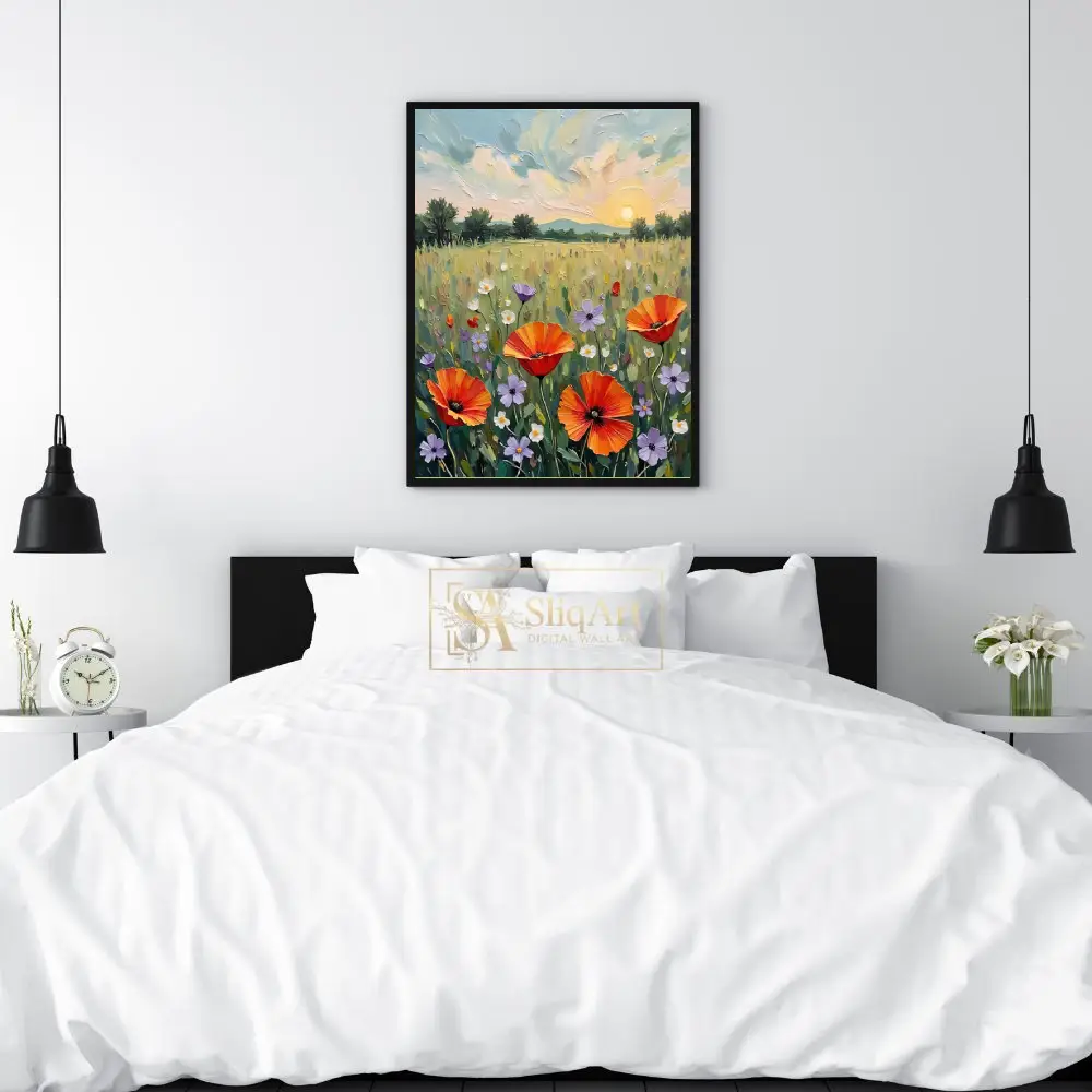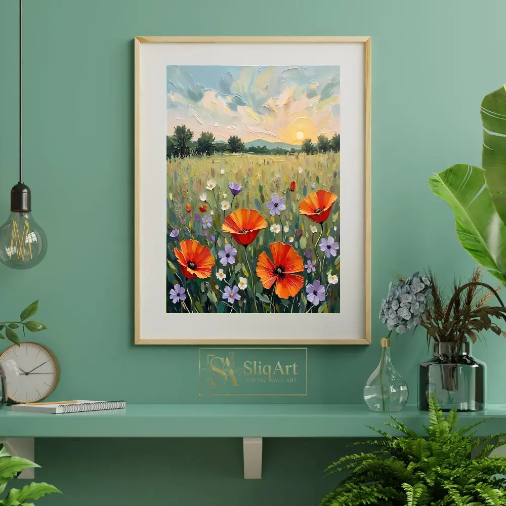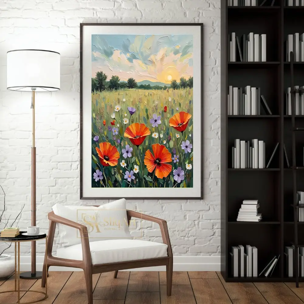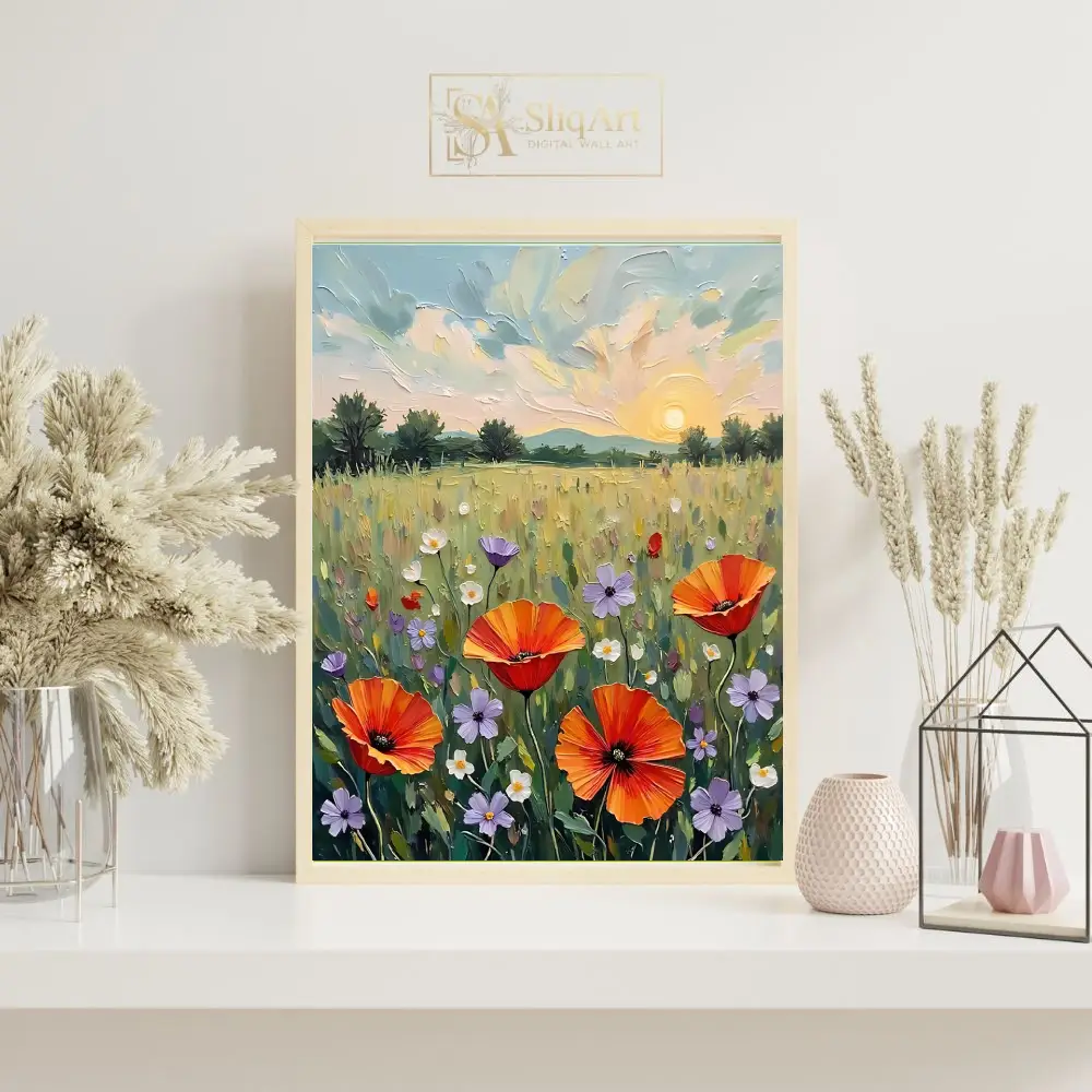 Transform your space with this stunning impasto-style painting featuring a vibrant field of wildflowers at sunset. The artwork showcases bold orange poppies, delicate purple blossoms, and white daisies dancing in a lush green meadow under a golden setting sun.