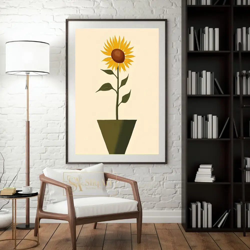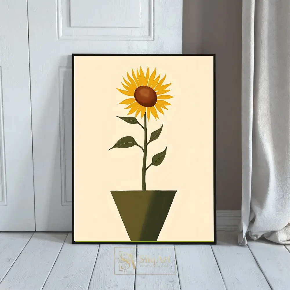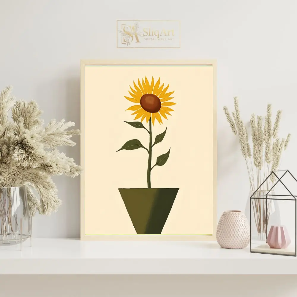Bring the warmth of a summer garden indoors with this elegant minimalist sunflower art print. Featuring a single, vibrant sunflower standing tall in a contemporary geometric pot, this piece combines vintage charm with modern simplicity.