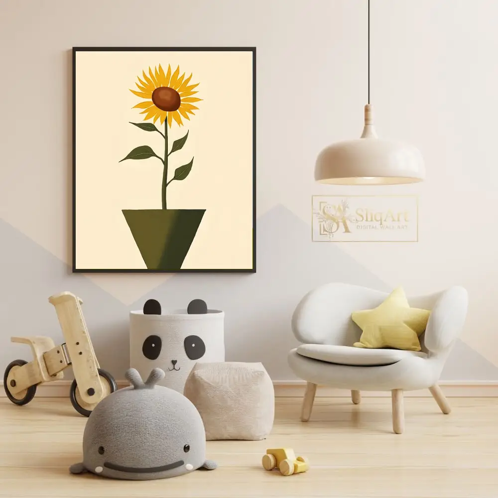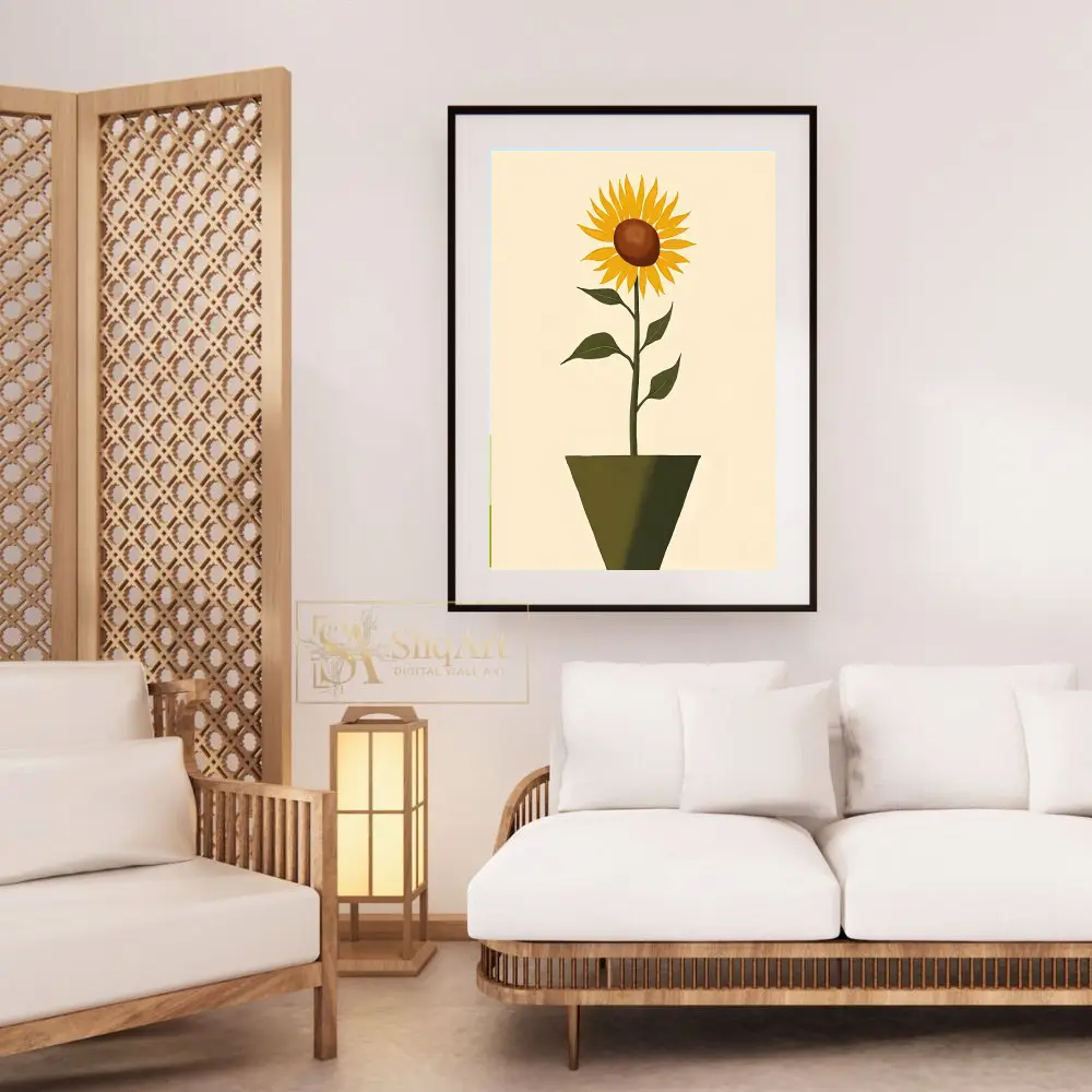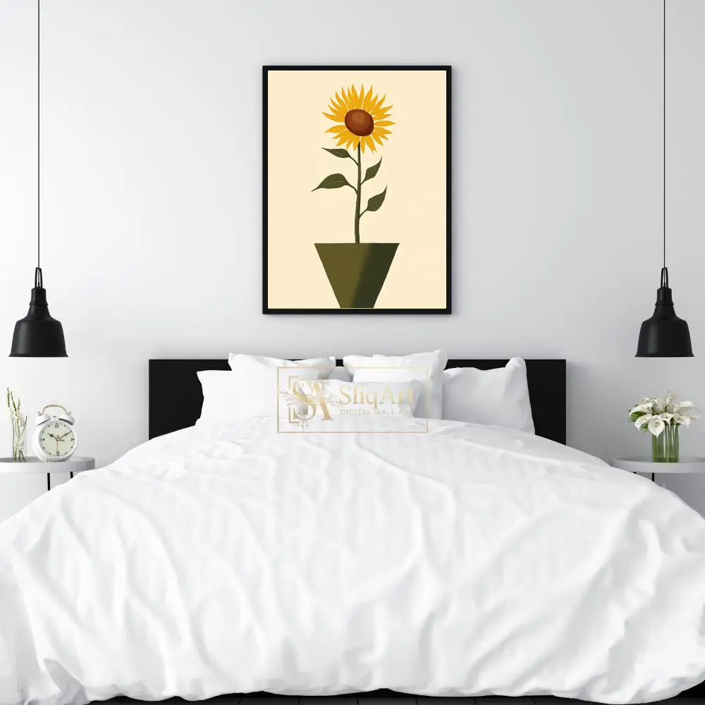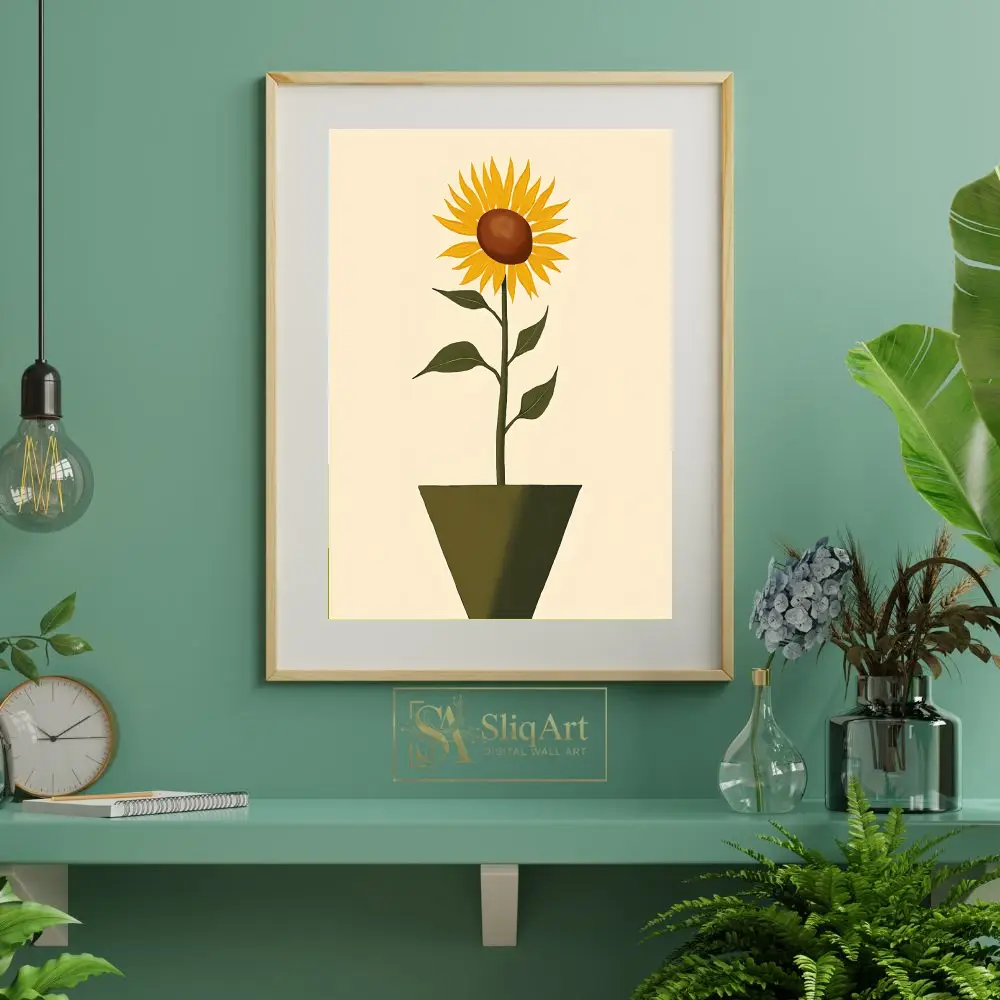 Bring the warmth of a summer garden indoors with this elegant minimalist sunflower art print. Featuring a single, vibrant sunflower standing tall in a contemporary geometric pot, this piece combines vintage charm with modern simplicity.
