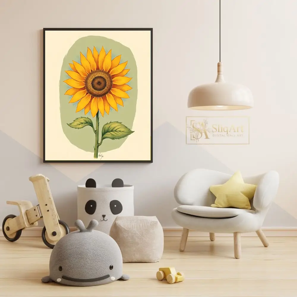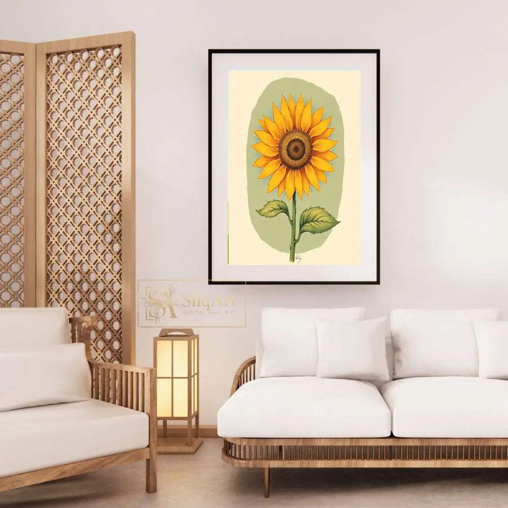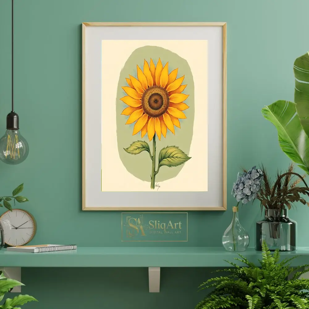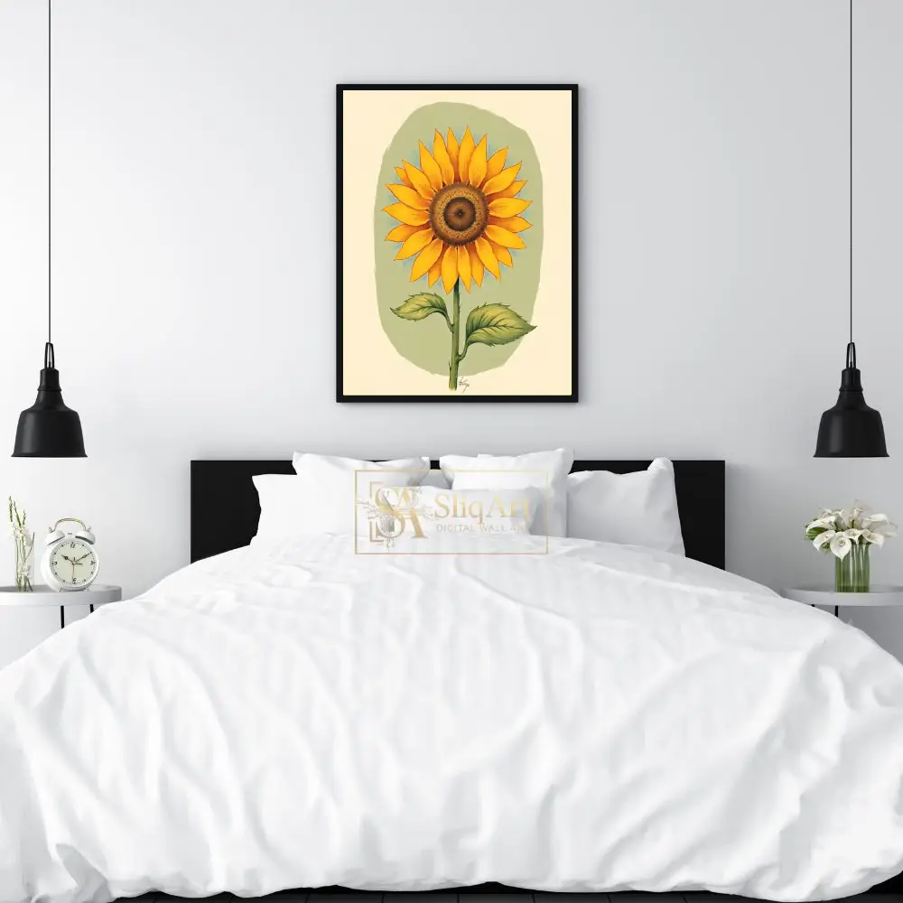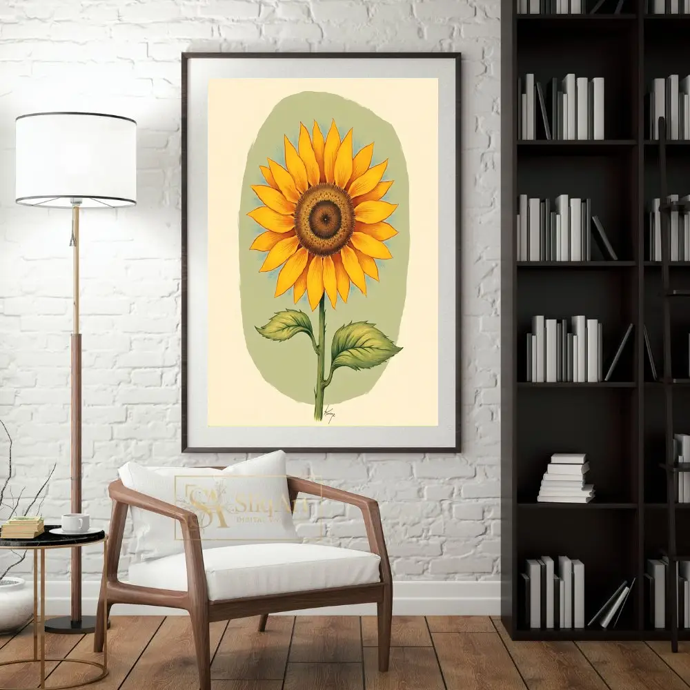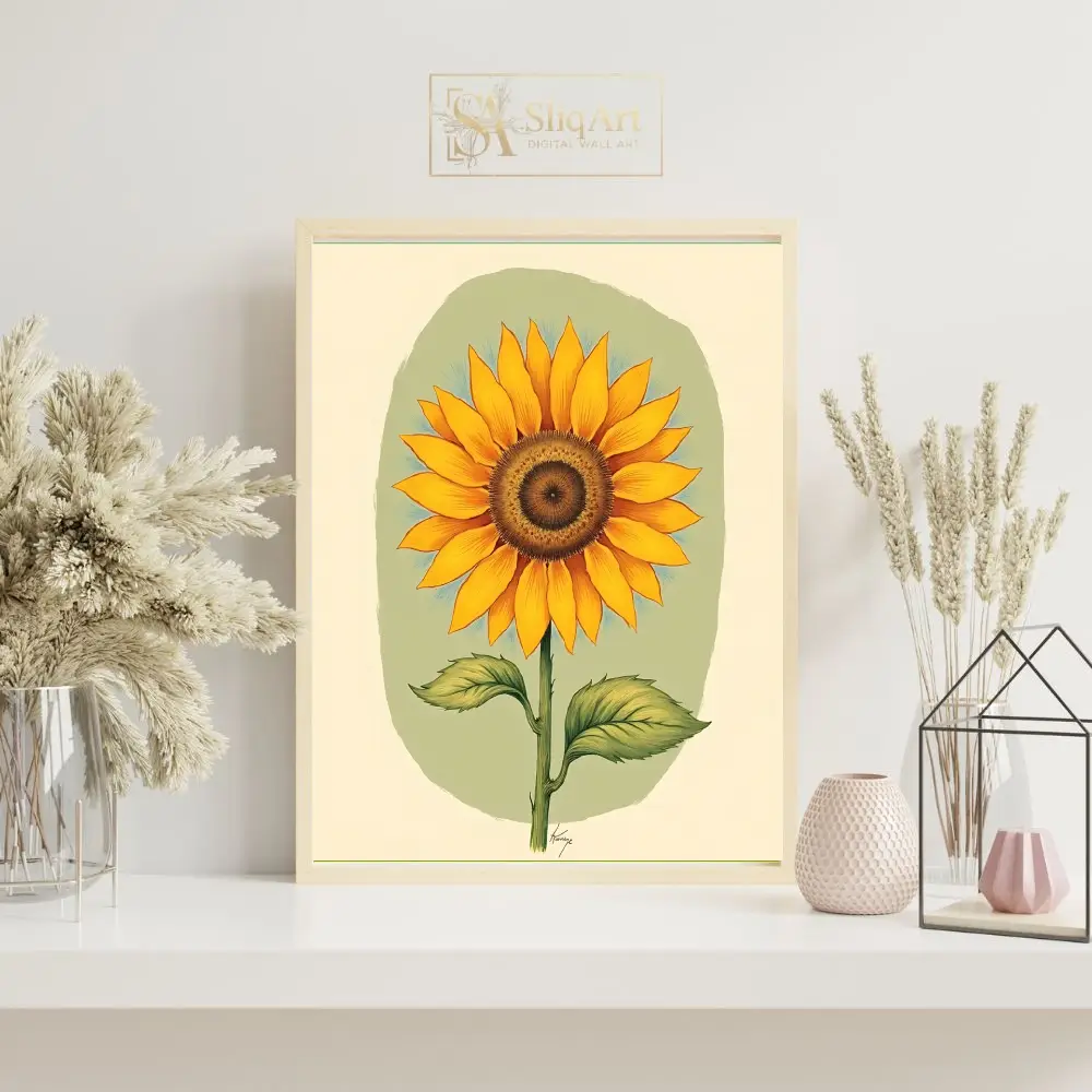 Its vintage-inspired aesthetic and fine-line detailing capture the organic beauty of nature, bringing a sense of warmth, growth, and optimism to any space. Whether you are looking to brighten a neutral wall or complement a floral-themed decor, this piece serves as a timeless celebration of summer’s most iconic flower.