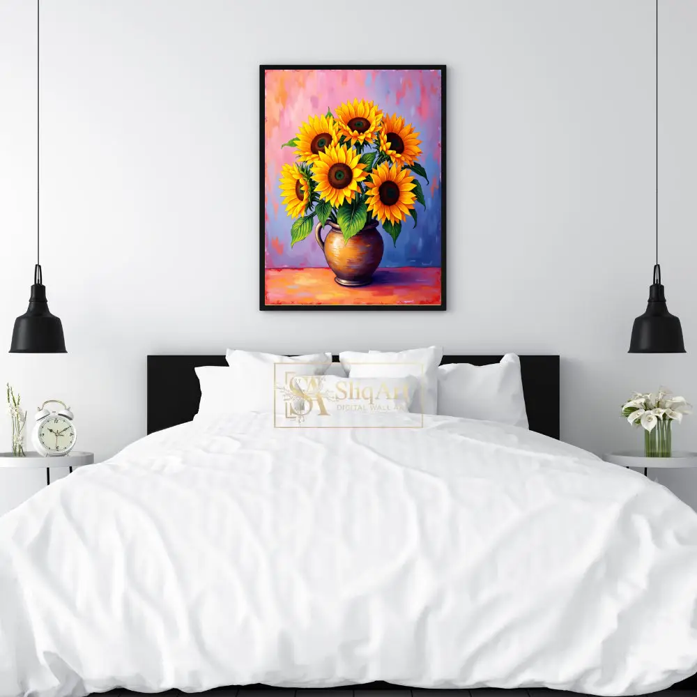 Add a burst of sunshine to your walls with this radiant sunflower bouquet digital painting. This piece features six lush, golden-yellow sunflowers meticulously arranged in a rustic ceramic vase.