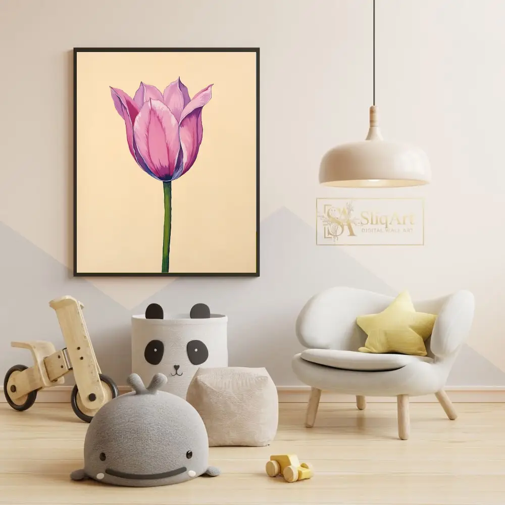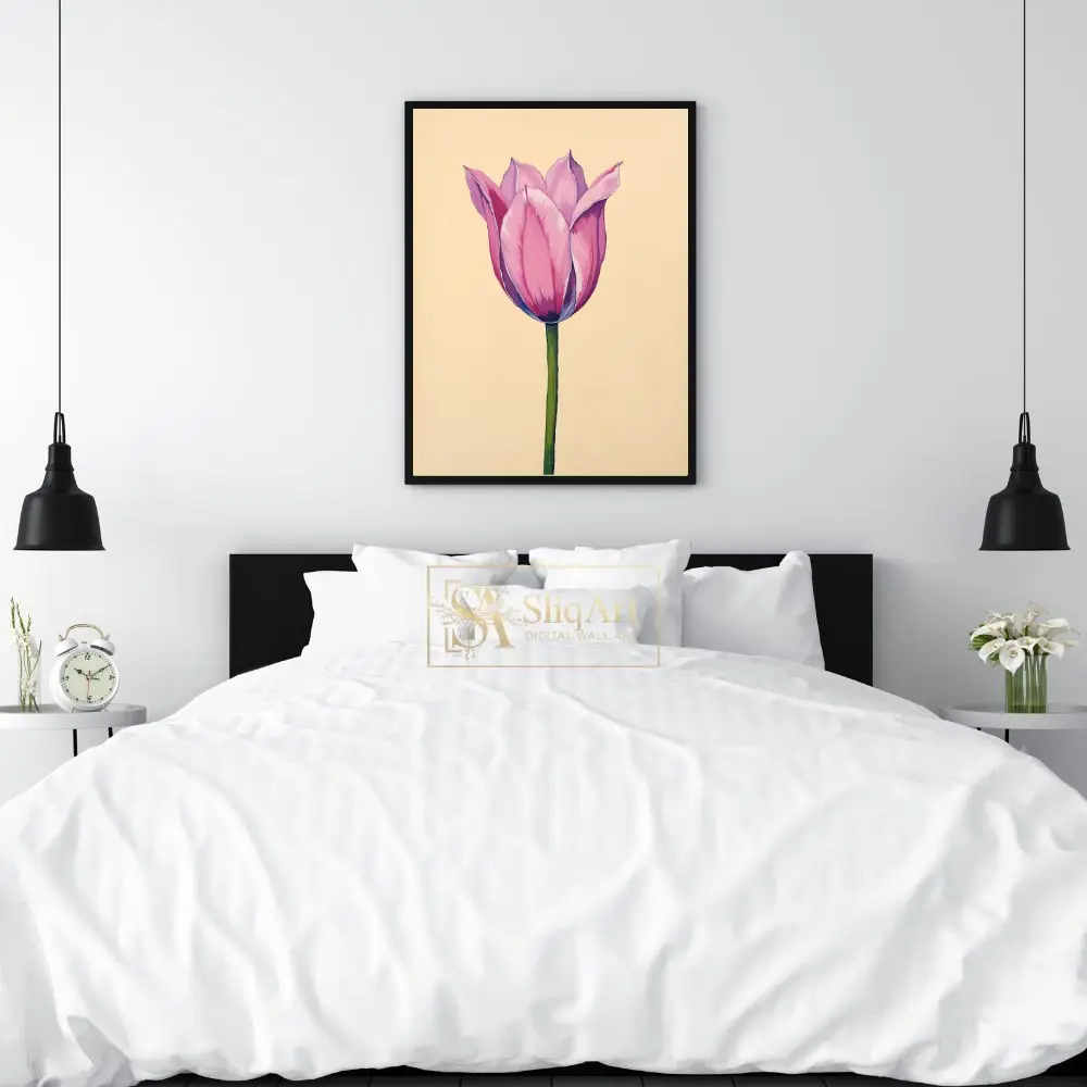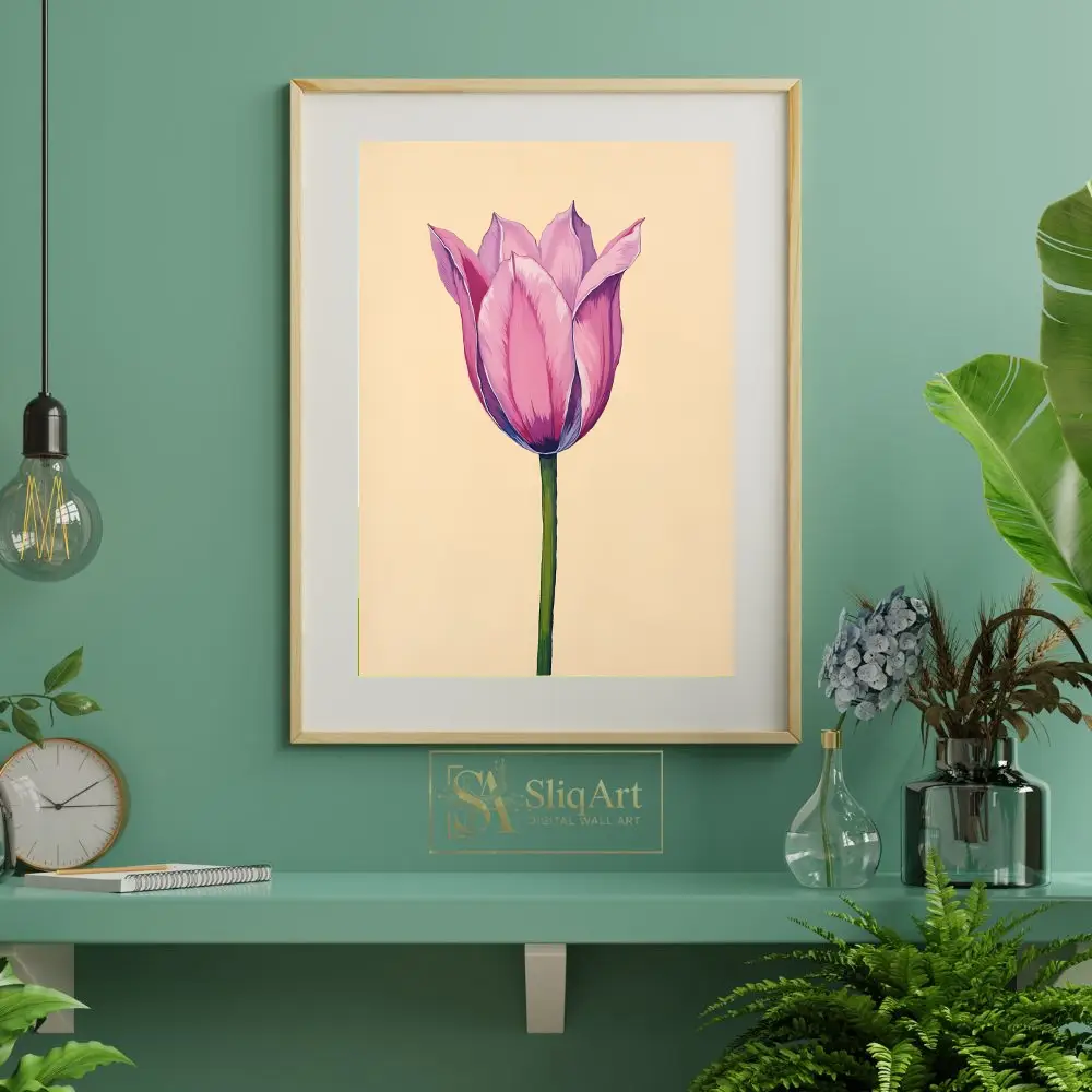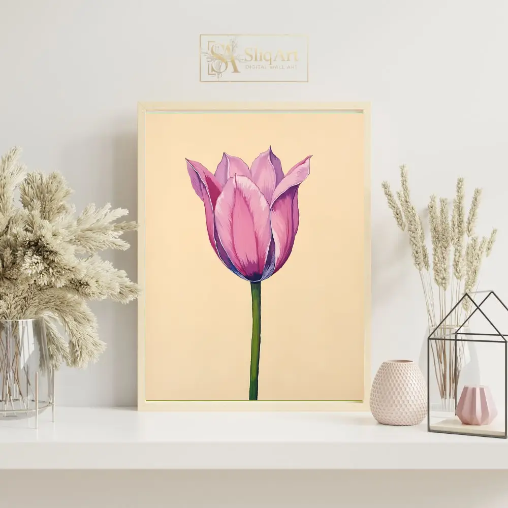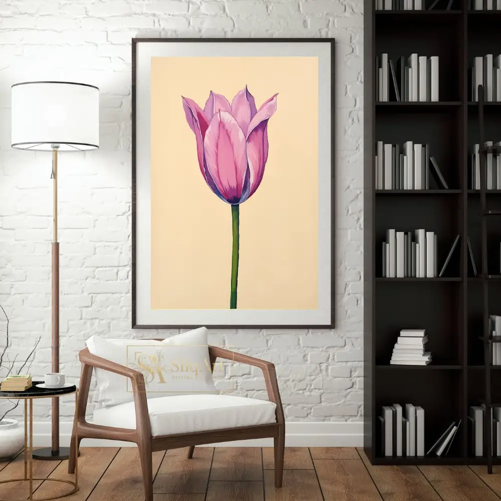 Bring the delicate beauty of spring into your home with this stunning botanical illustration of a pink tulip. The artwork features a single, gracefully detailed tulip bloom in shades of soft and vibrant pink, set against a warm, neutral cream background.