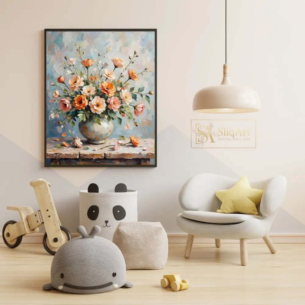 Add a touch of timeless elegance to your home with this stunning impressionist still life. Featuring a bountiful bouquet of peach, vibrant orange, and delicate cream blossoms, this piece is brought to life with thick, expressive palette knife strokes that create a rich, tactile texture.