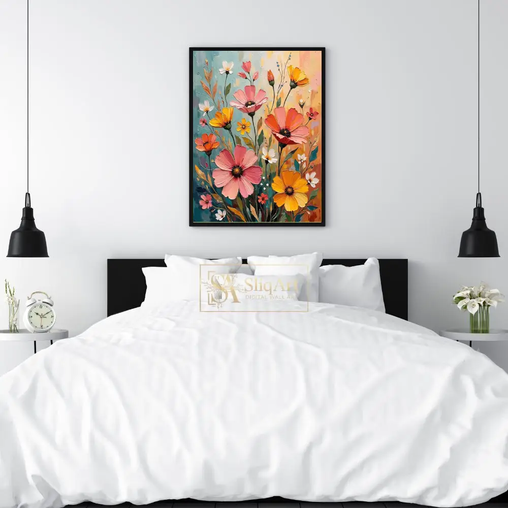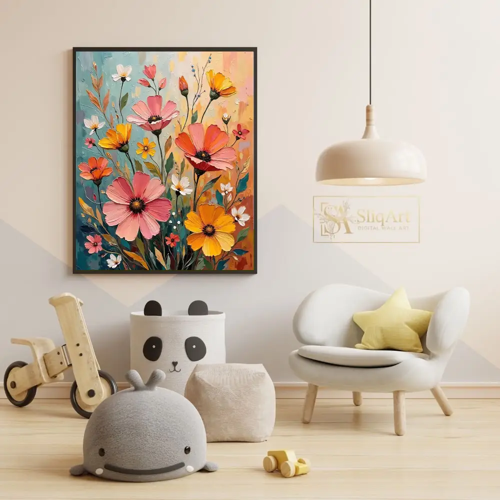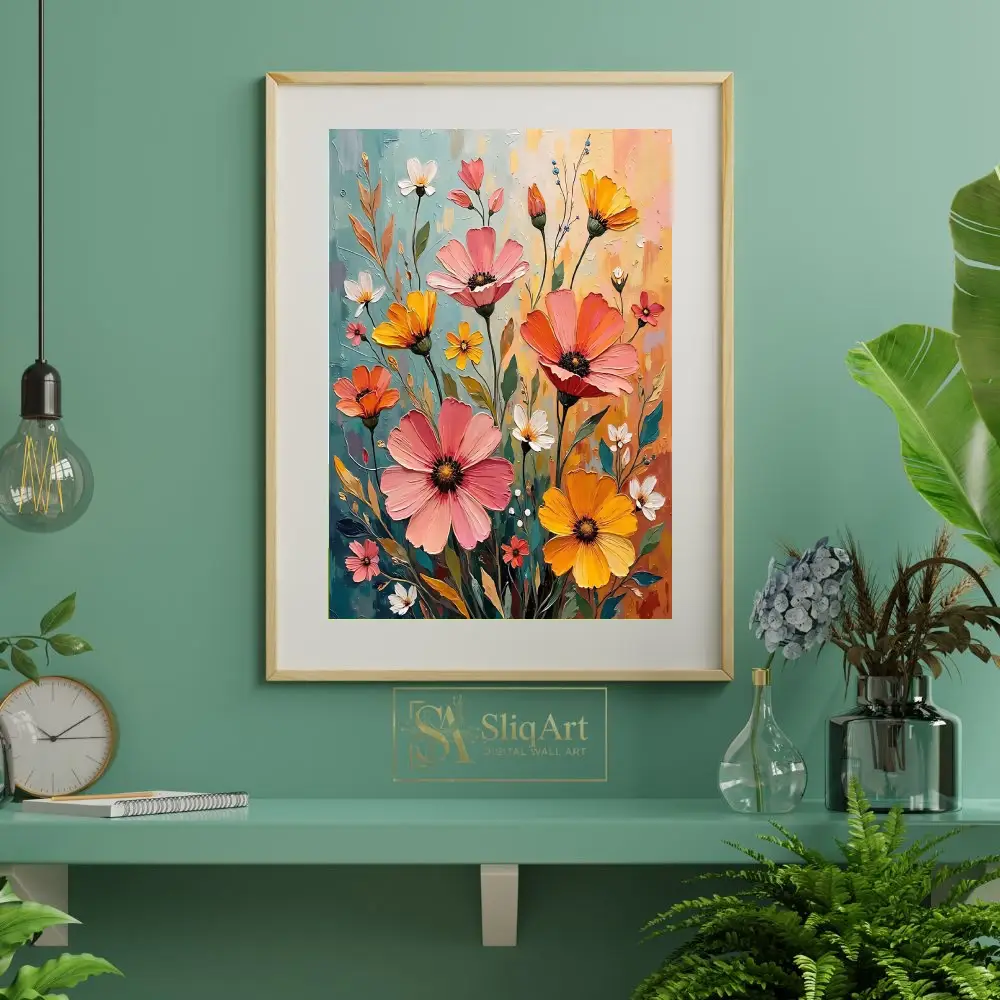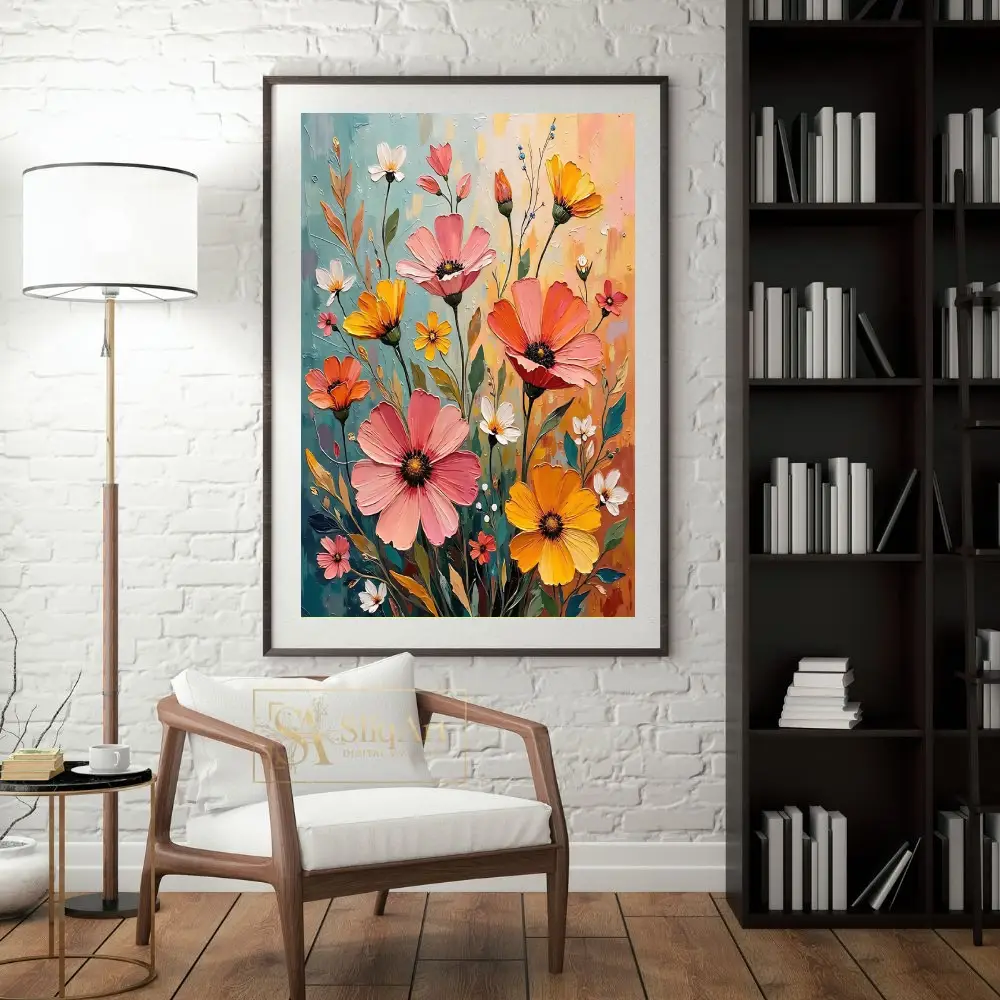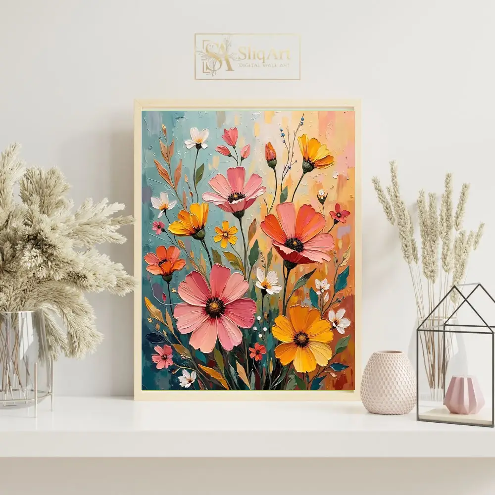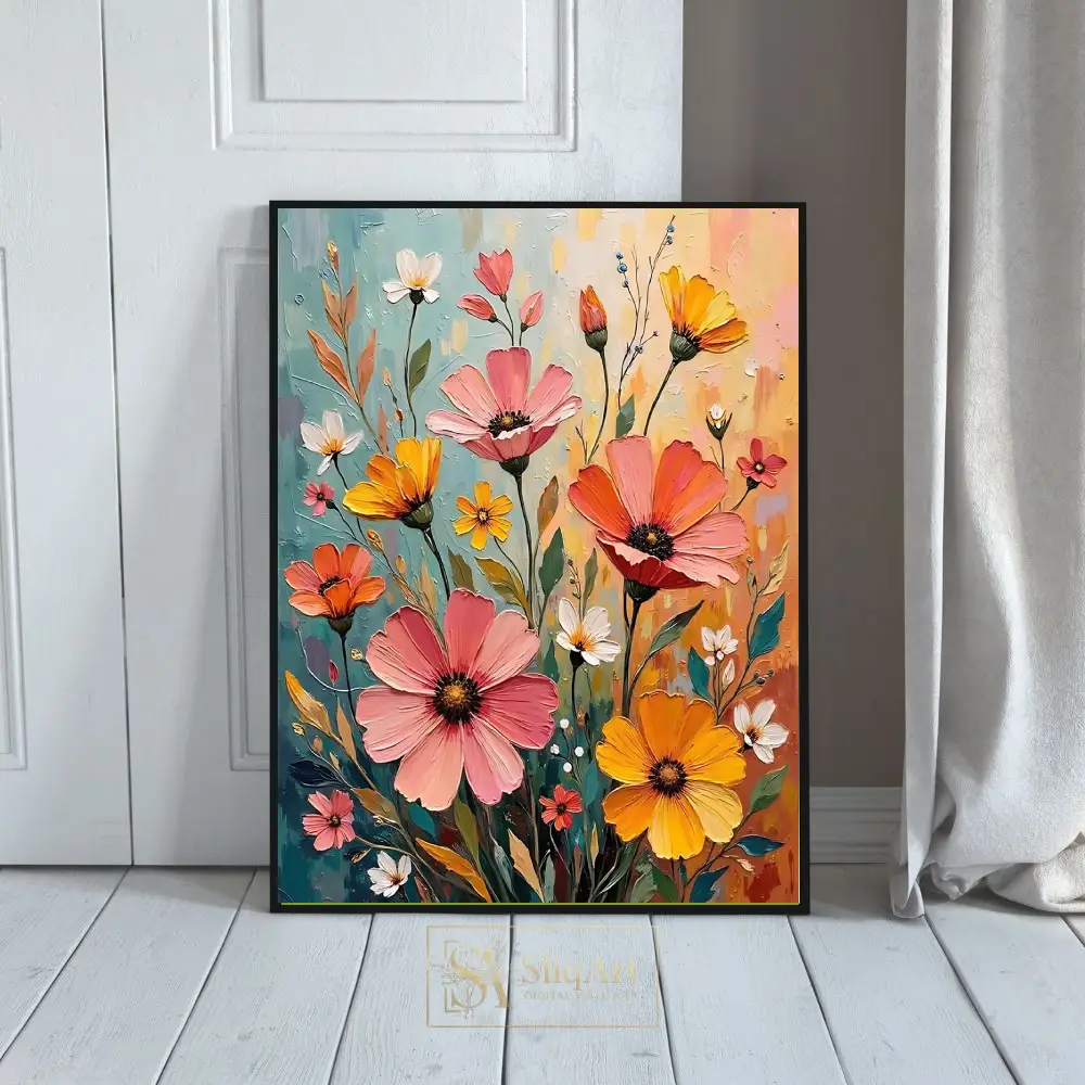 Featuring a rich palette of coral pinks, sun-drenched yellows, and burnt oranges against a tranquil teal and cream background, the piece uses thick, expressive brushstrokes to create a sense of movement and tangible texture. The layering of colors and the dynamic composition of cosmos-like blooms make this piece a sophisticated choice for anyone looking to bring the outdoors in with a modern, artistic flair.
