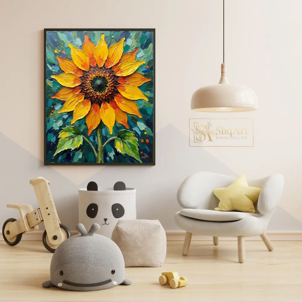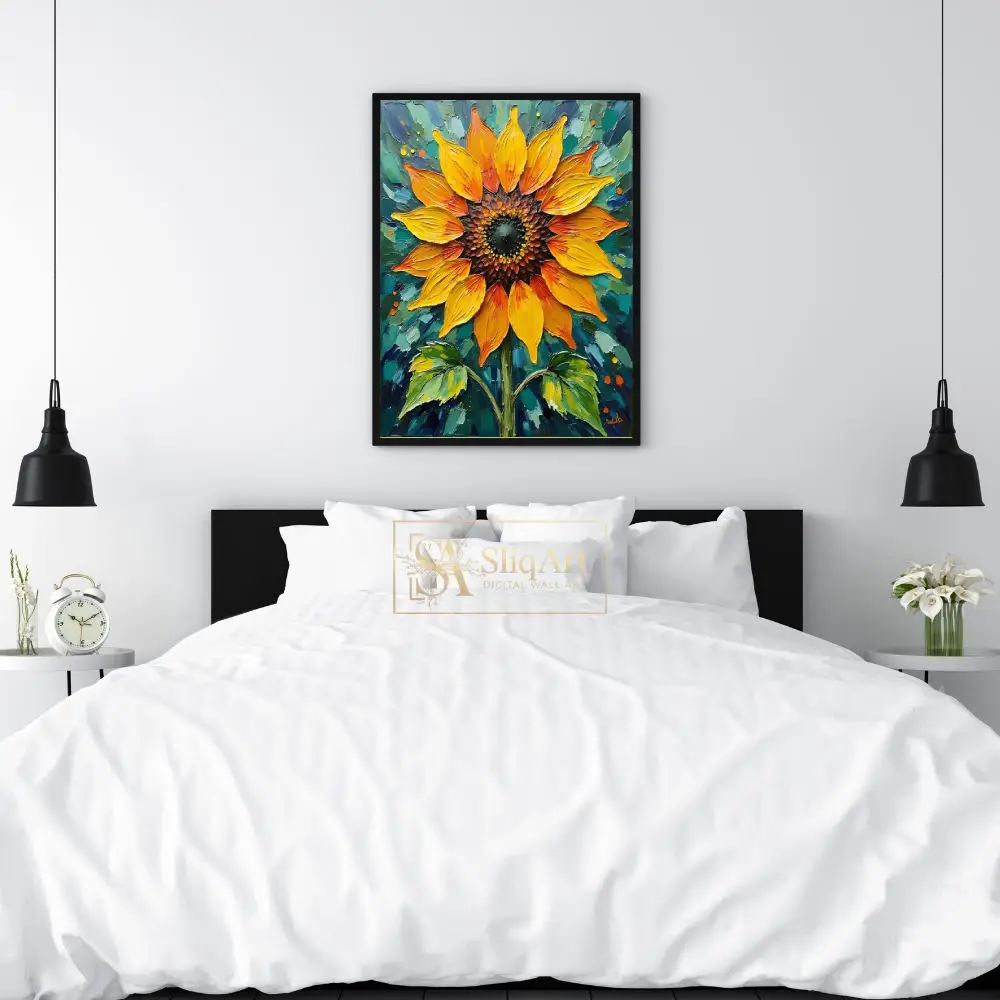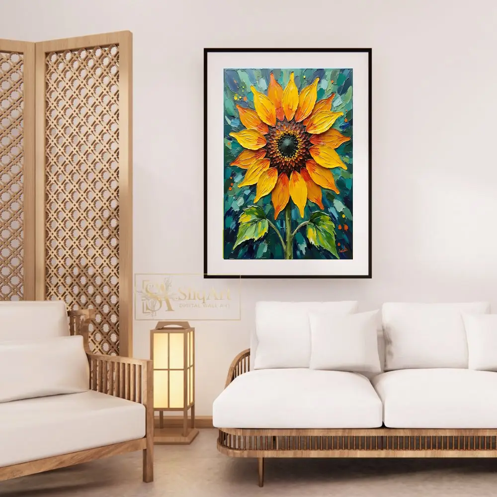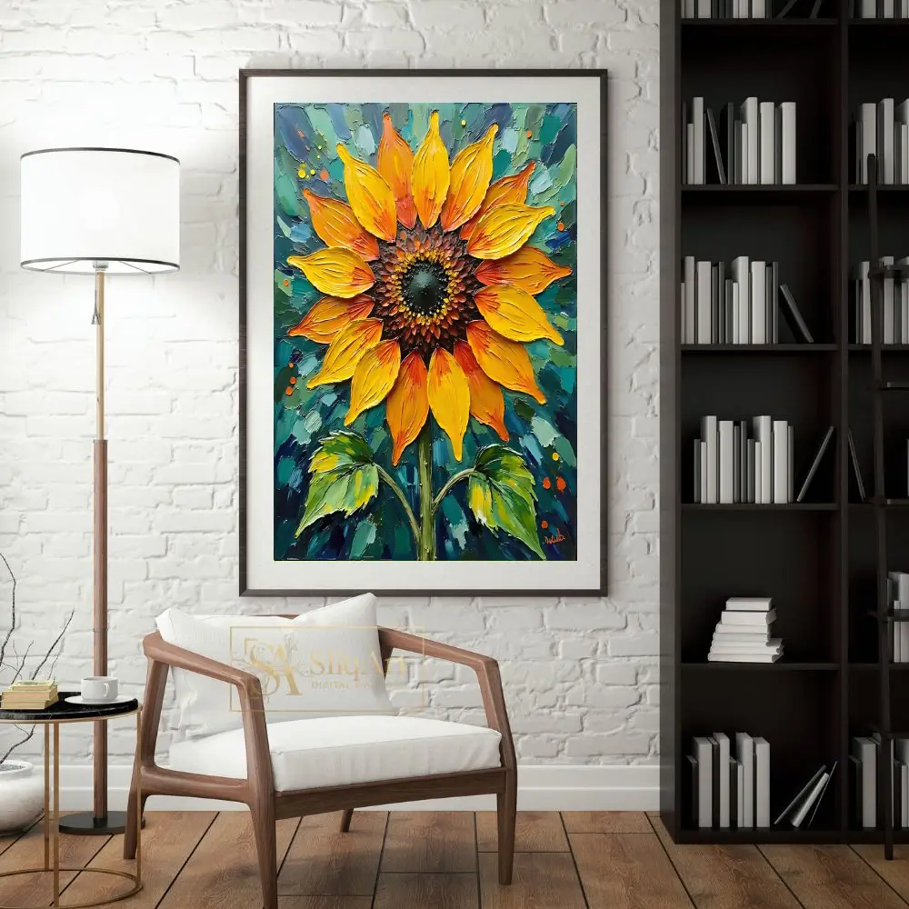 Illuminate your space with the radiant energy of this Sunflower Impasto Oil Painting. Expertly crafted with heavy, expressive brushstrokes, the golden yellow and fiery orange petals are rendered with a tactile quality that invites the eye.