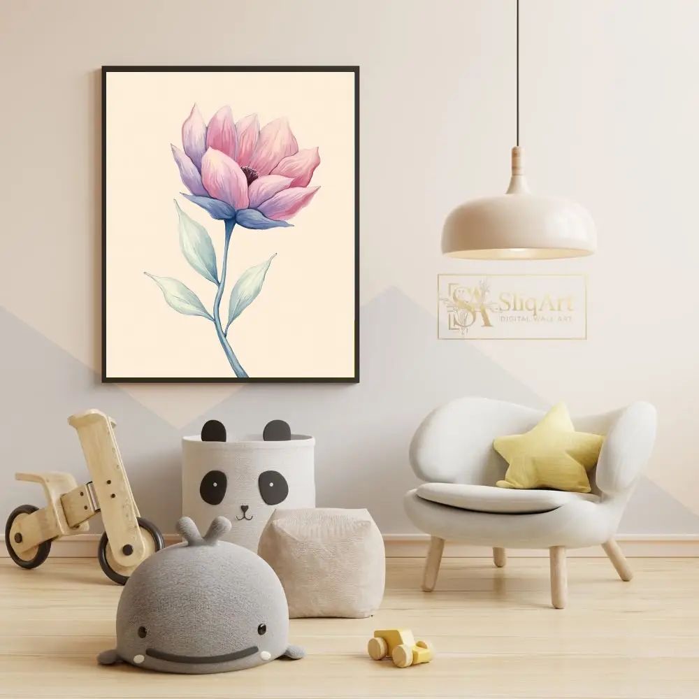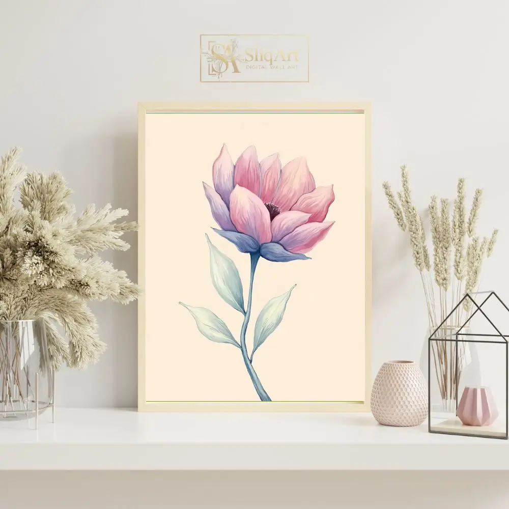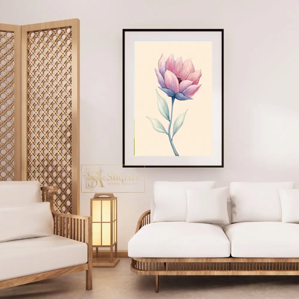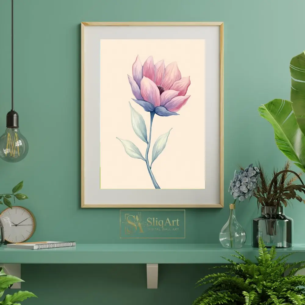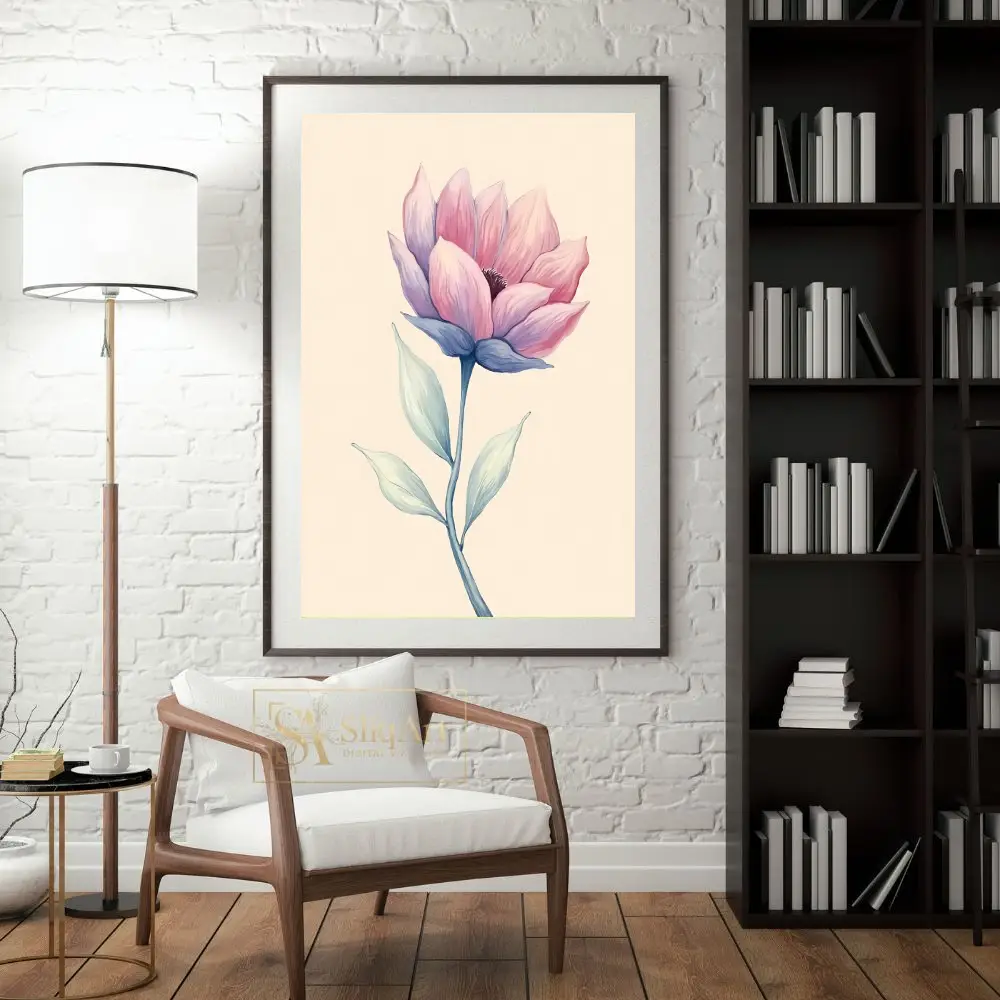Enhance your home with the soft, sophisticated beauty of this ‘Elegant Serene Blossom’ print. Featuring a single, masterfully painted flower in delicate shades of pink, purple, and lavender, this piece captures the essence of tranquility.