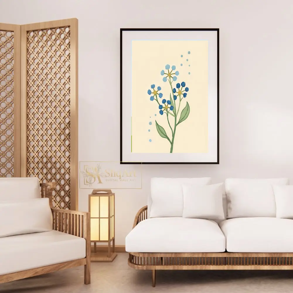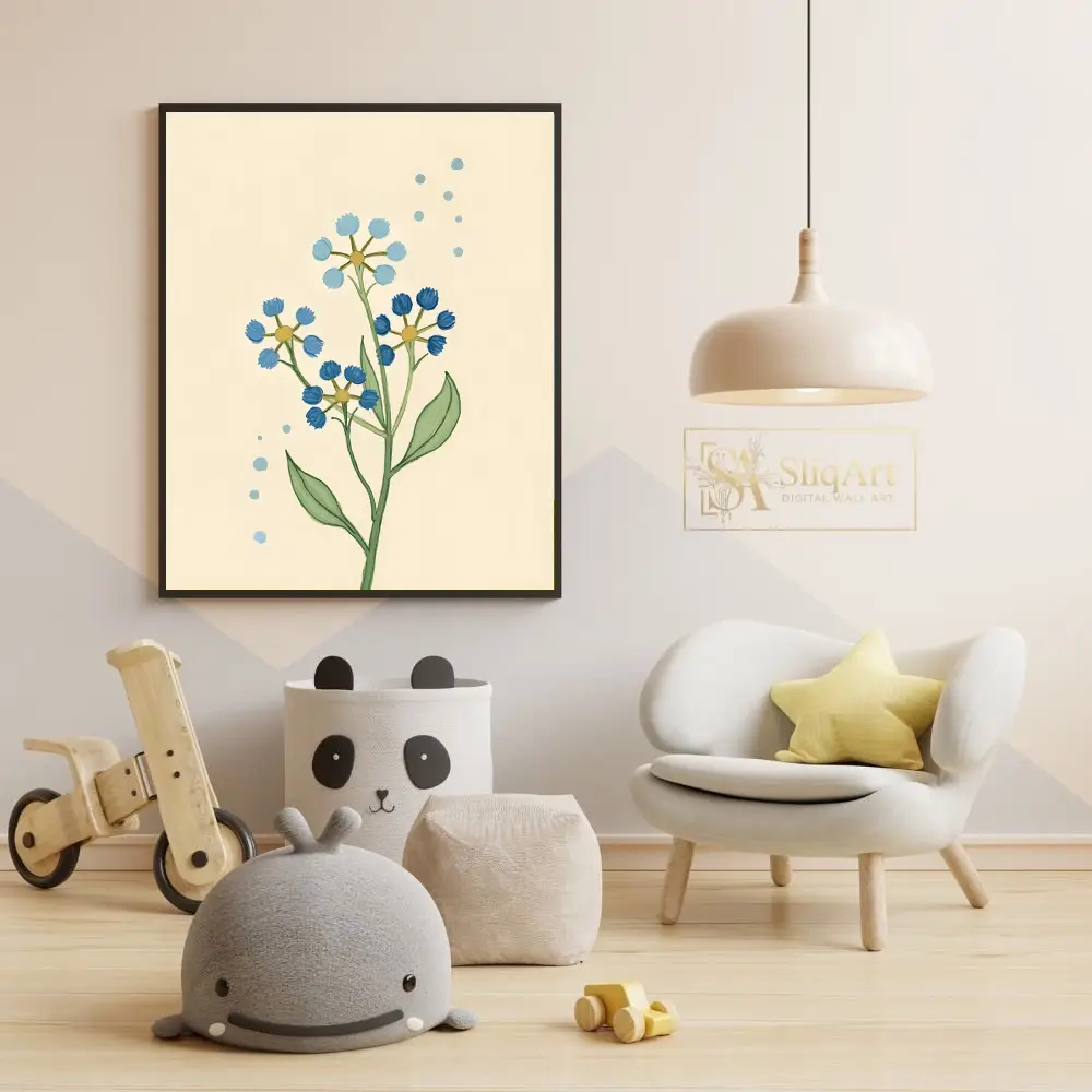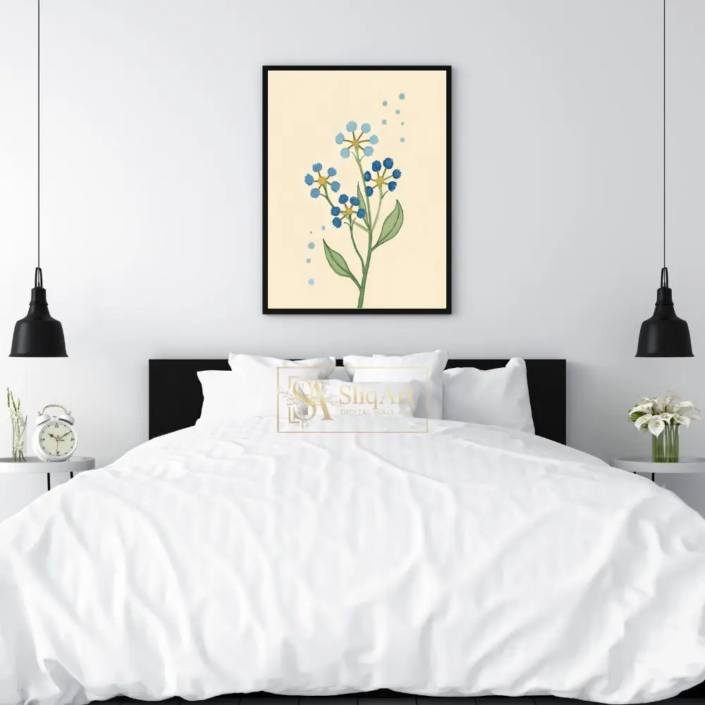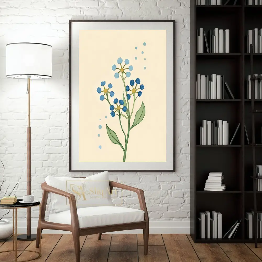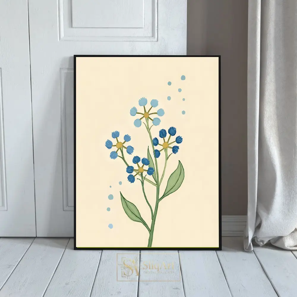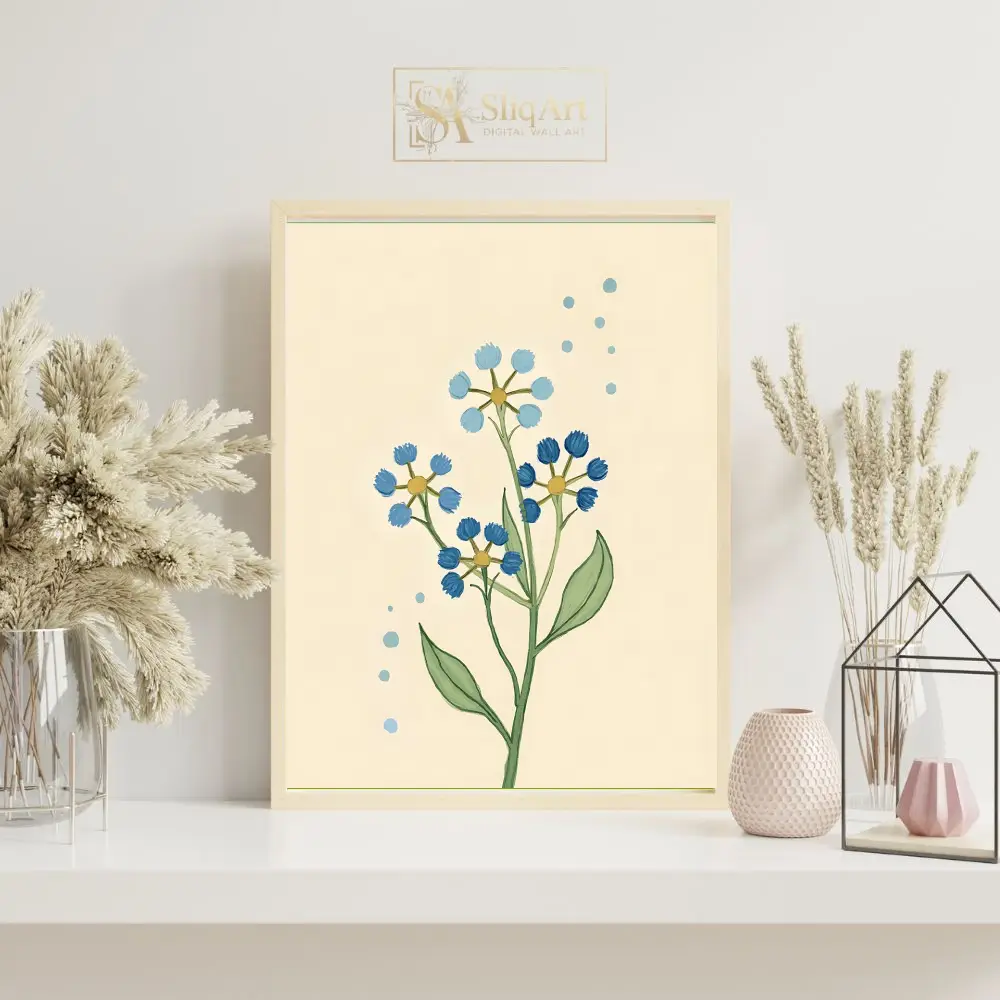 This charming botanical illustration features delicate wildflower stems in varying shades of blue, set against a warm, cream-colored background. The simple, hand-drawn aesthetic brings a touch of nature’s serenity into your home.
