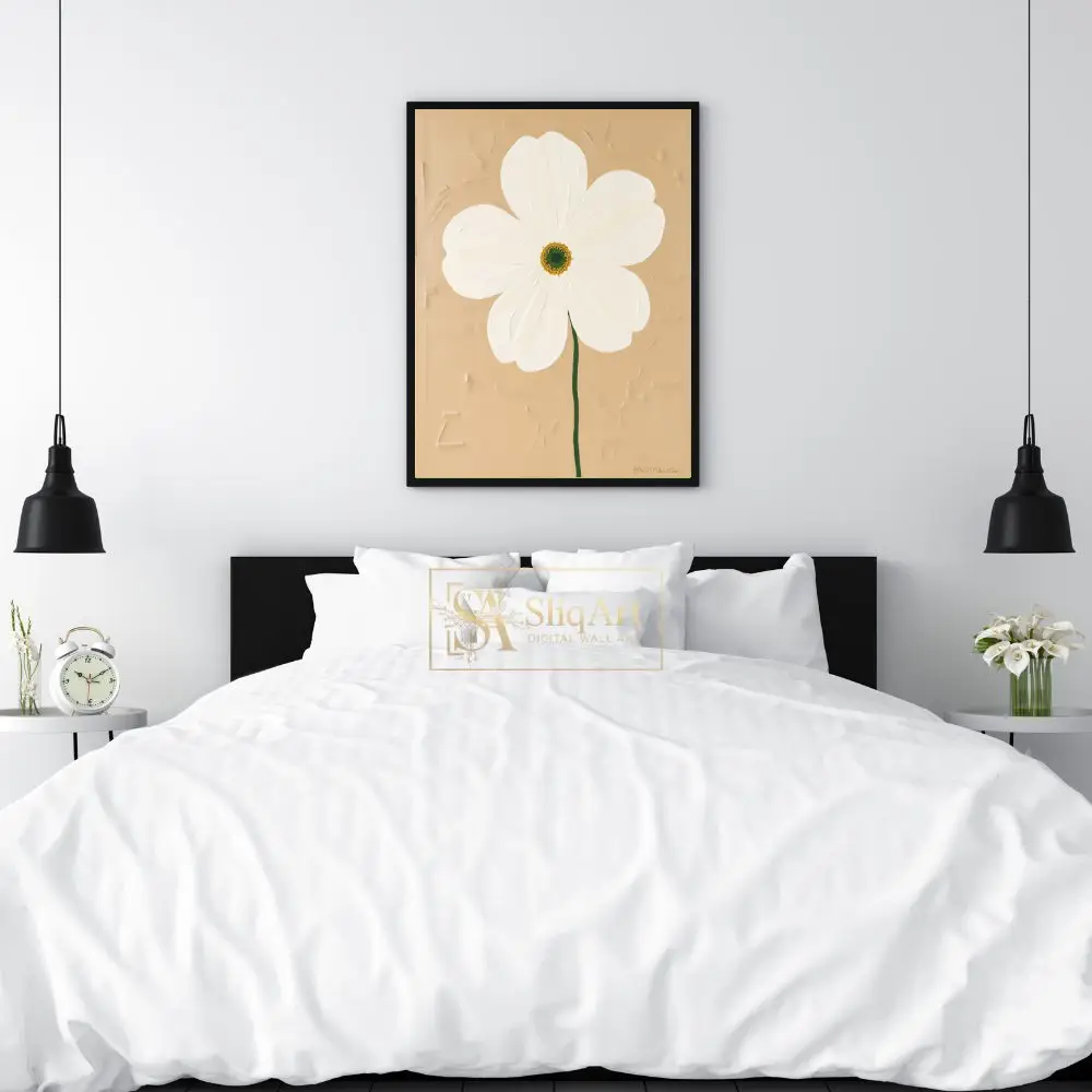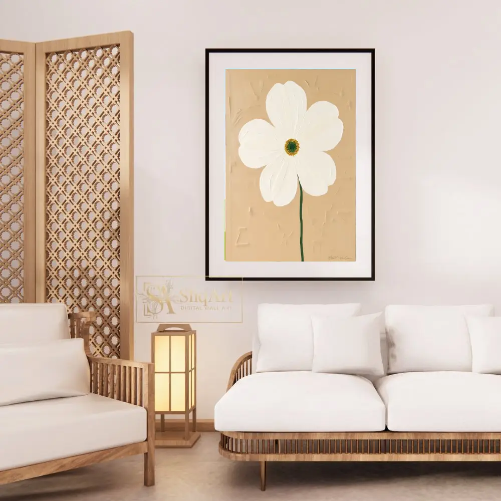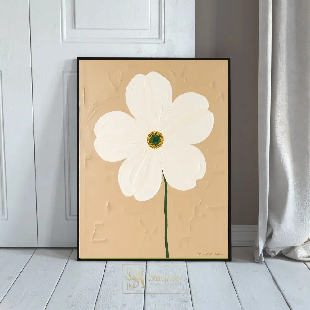Elevate your interior design with this serene minimalist floral painting. The artwork features a single, large white flower with five elegantly rendered petals, meticulously crafted using an impasto technique that provides a rich, tactile texture.