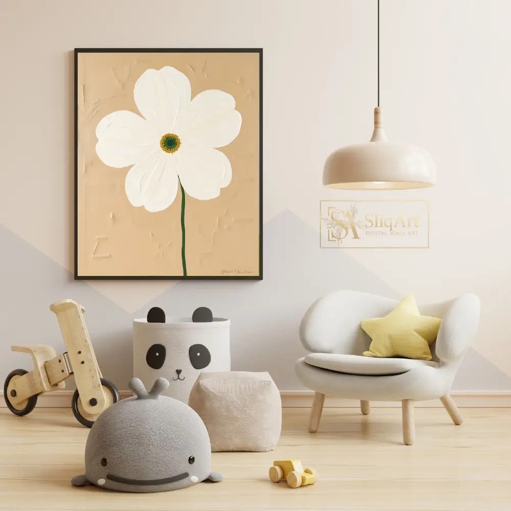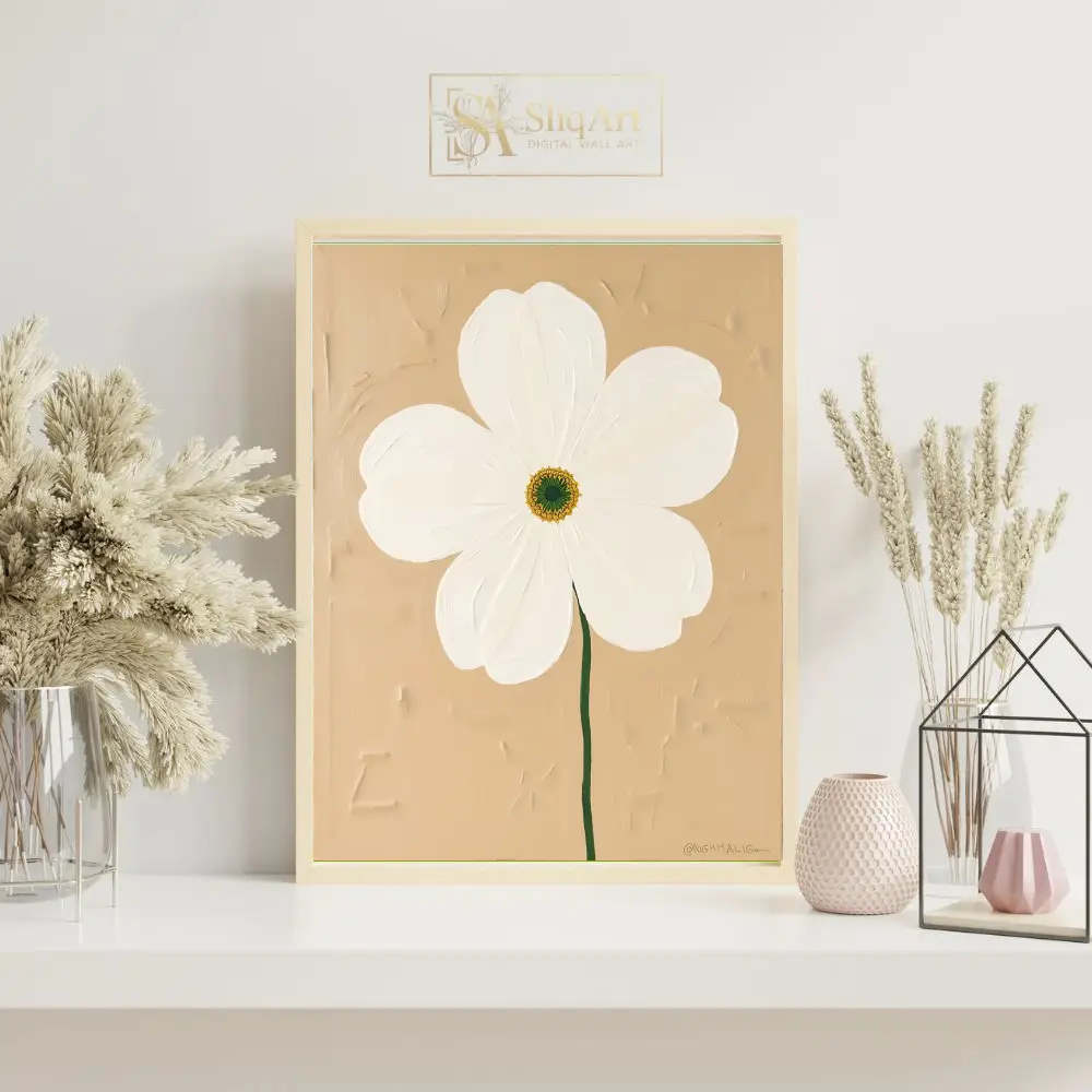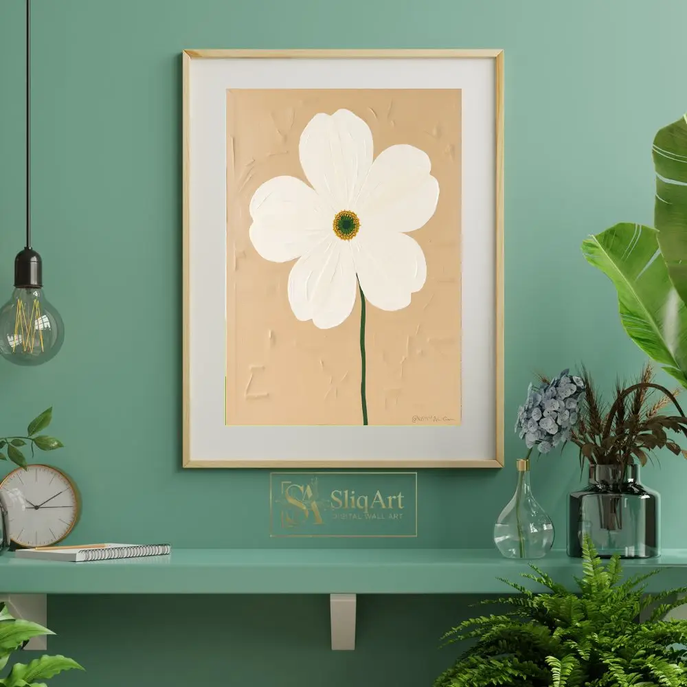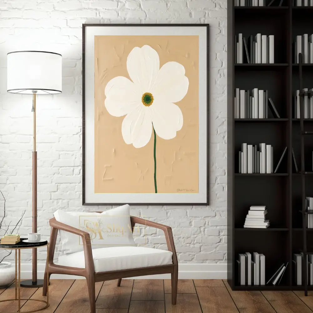 Elevate your interior design with this serene minimalist floral painting. The artwork features a single, large white flower with five elegantly rendered petals, meticulously crafted using an impasto technique that provides a rich, tactile texture.