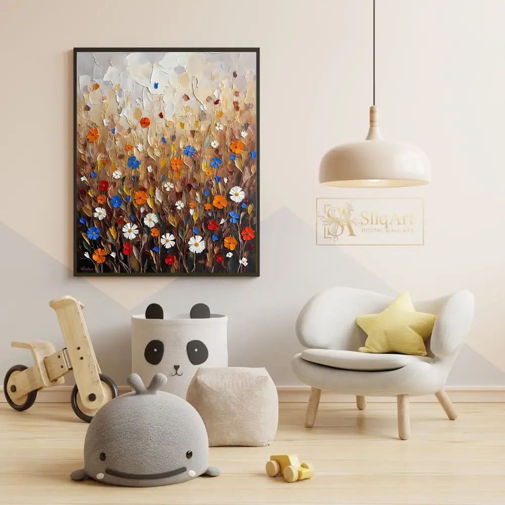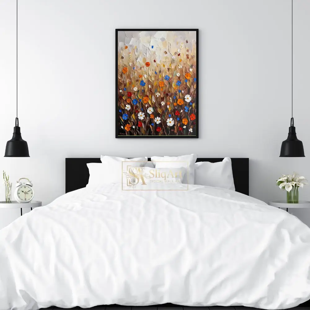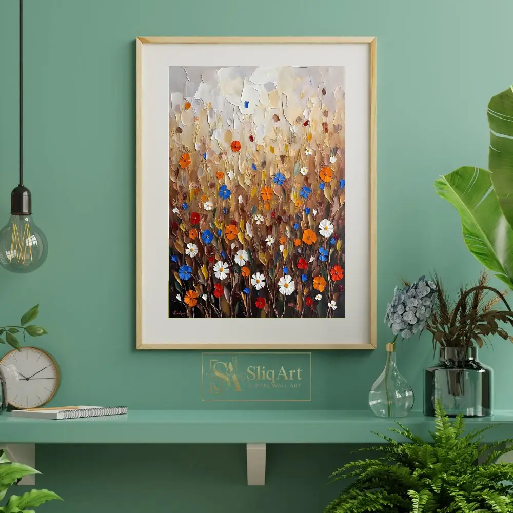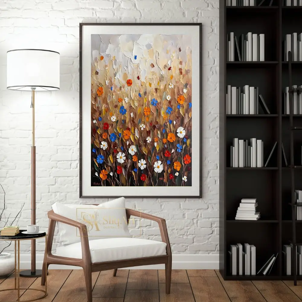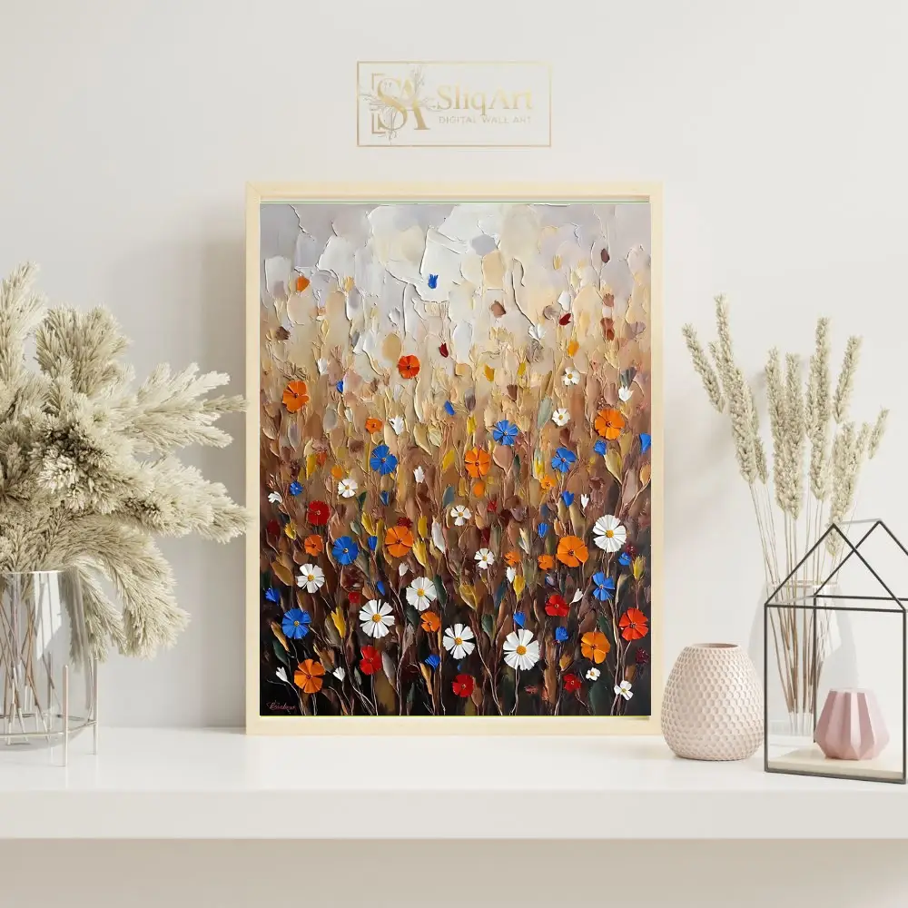 Embrace the tactile beauty of nature with this vibrant impasto-style wildflower meadow painting. Expertly crafted with thick, expressive palette knife strokes, this artwork brings a sense of life and movement to your walls.