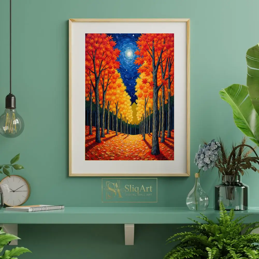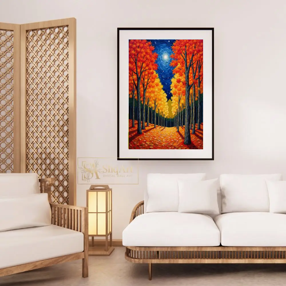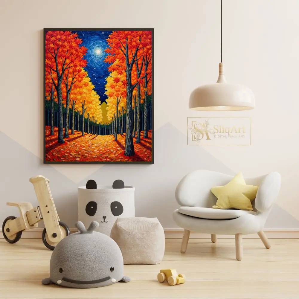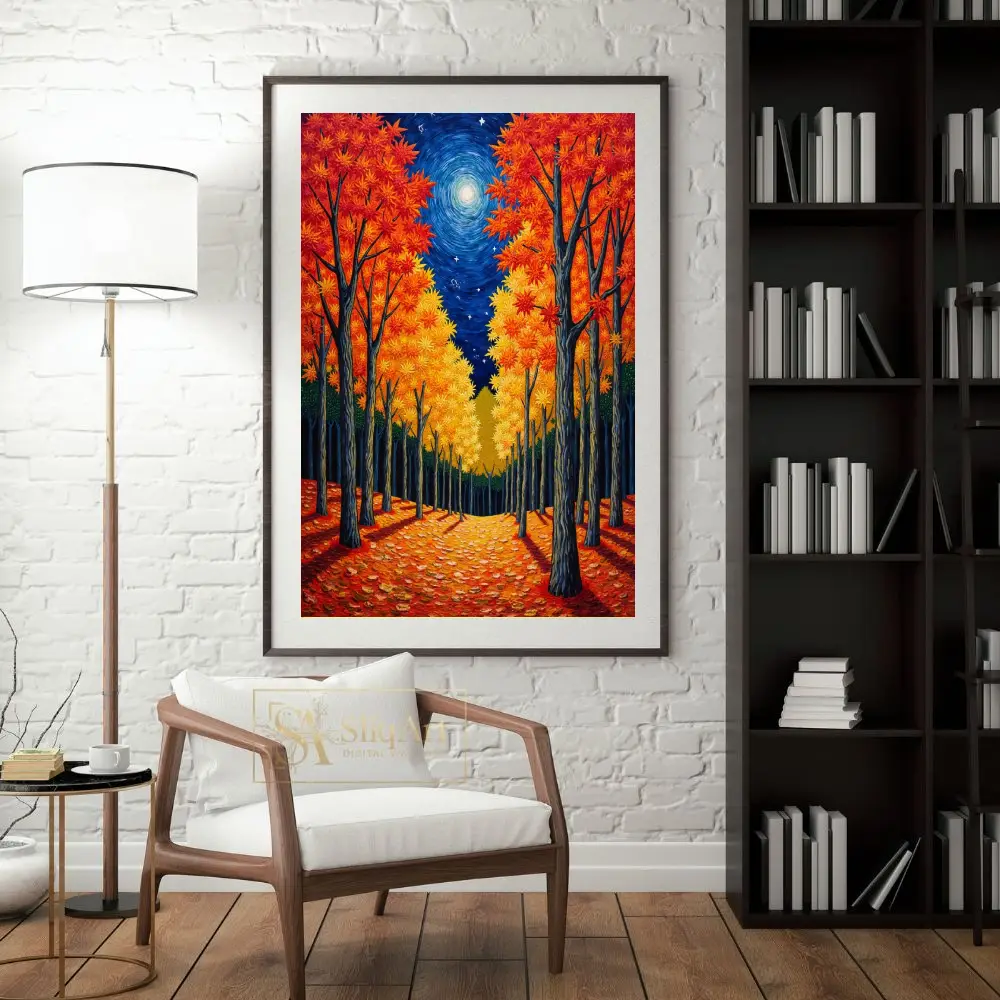 Evoking the expressive energy of Post-Impressionism, this striking piece depicts a path through an autumn forest under a mesmerizing night sky.