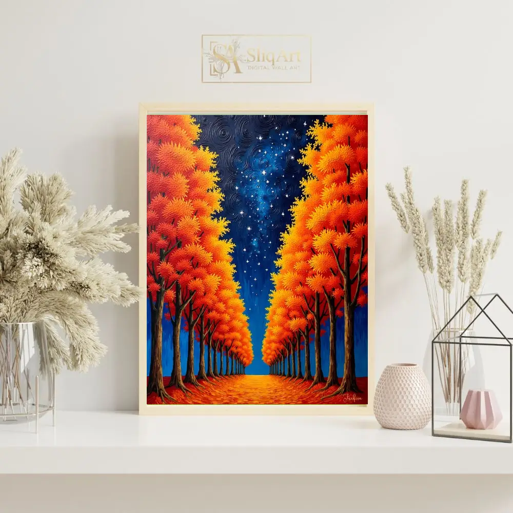 Transform your space with this captivating masterpiece featuring a symmetrical path of vibrant orange autumn trees leading toward a swirling, starry night sky. The high-contrast color palette of deep sapphire blues and fiery ambers creates a mesmerizing visual experience.