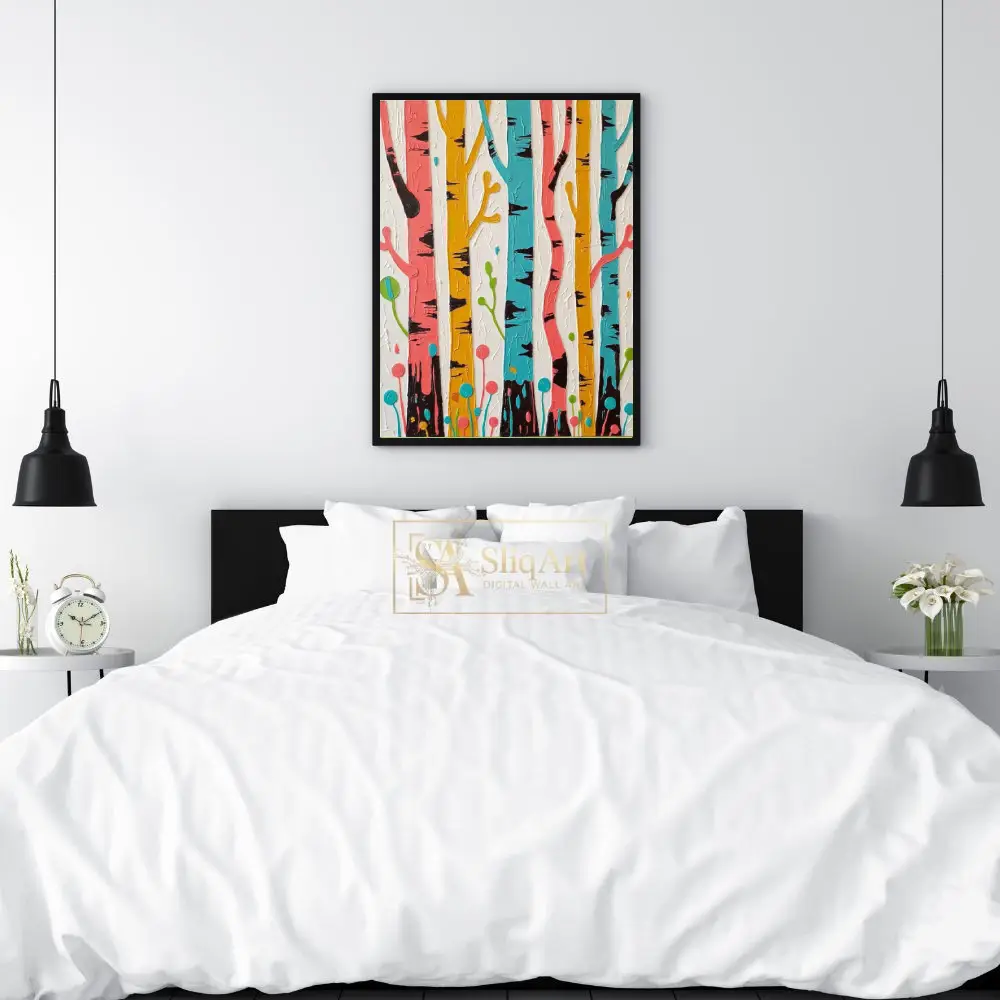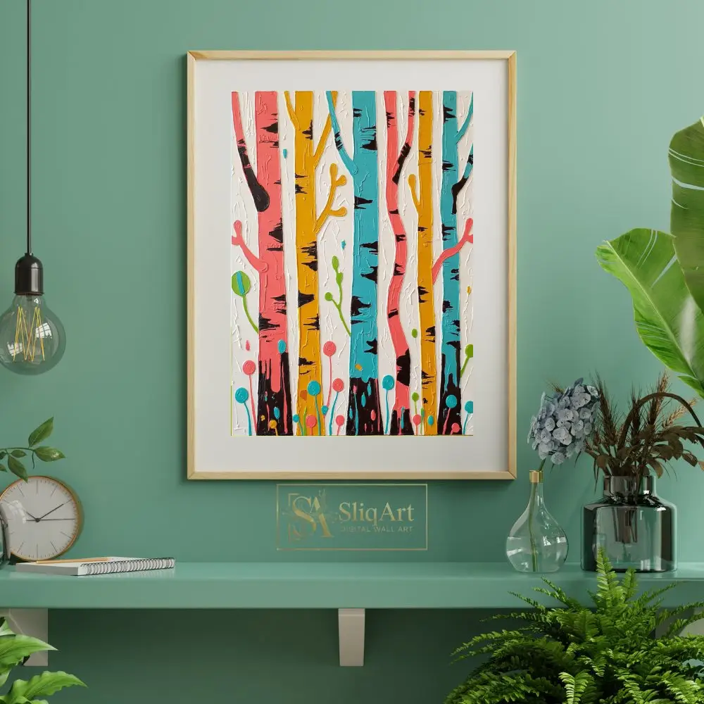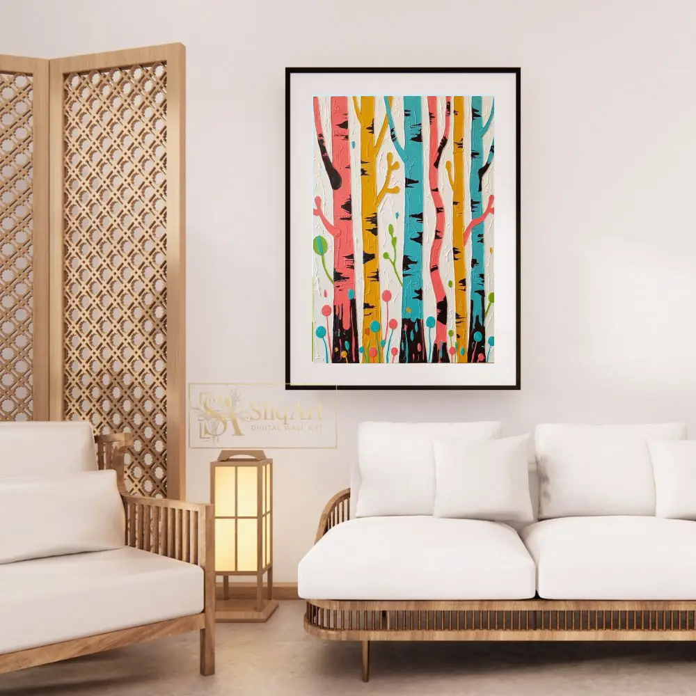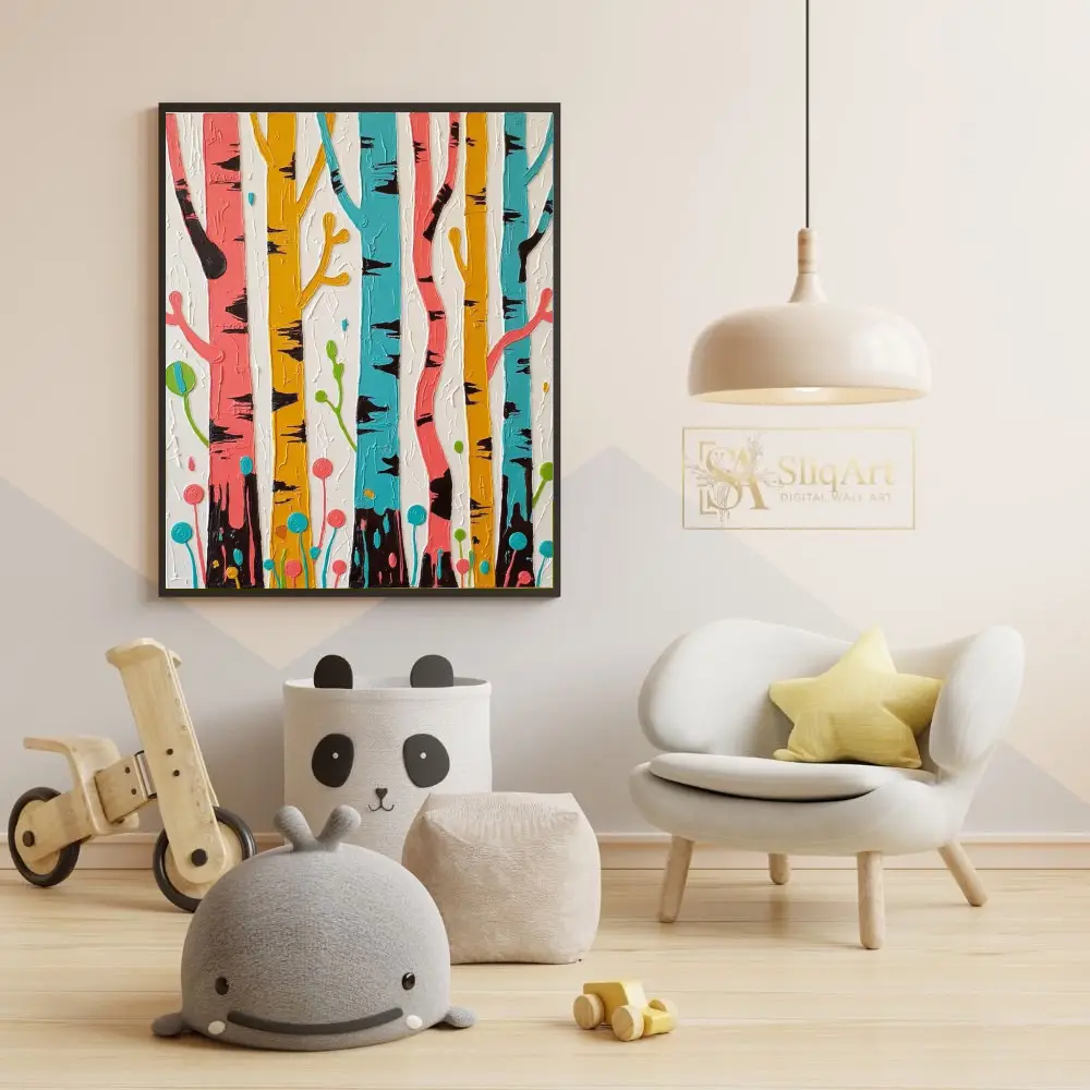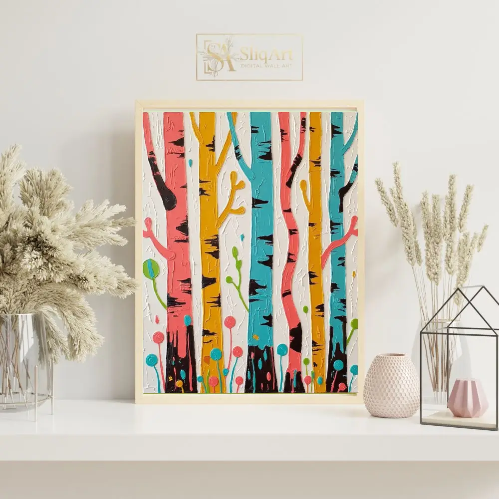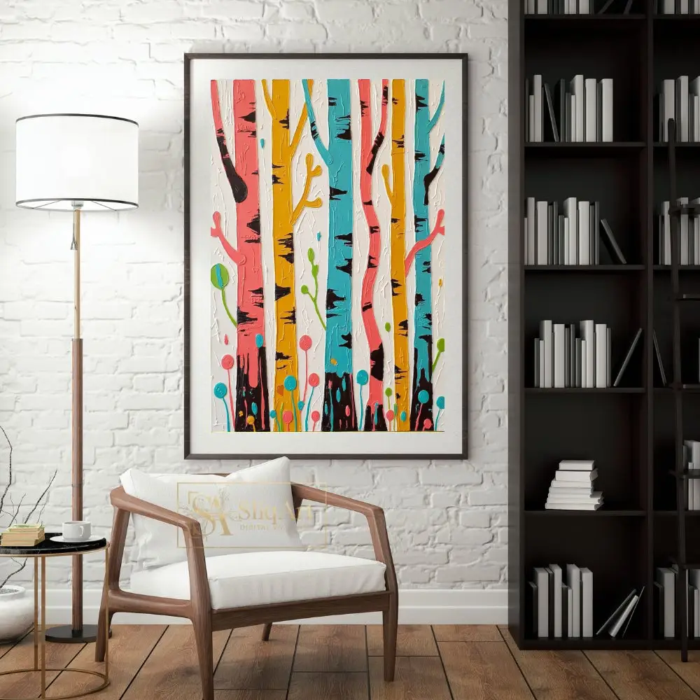 The whimsical interpretation of tree trunks, accented with deep black bark details and stylized botanical elements at the base, creates a joyful and modern atmosphere. Set against a clean, textured white background, the colors pop with contemporary intensity, making it a perfect conversation piece for any modern home.