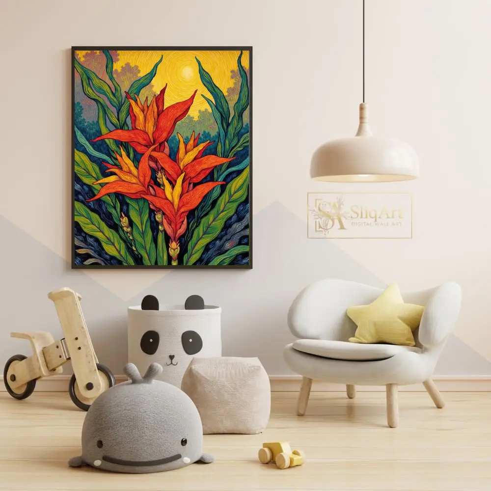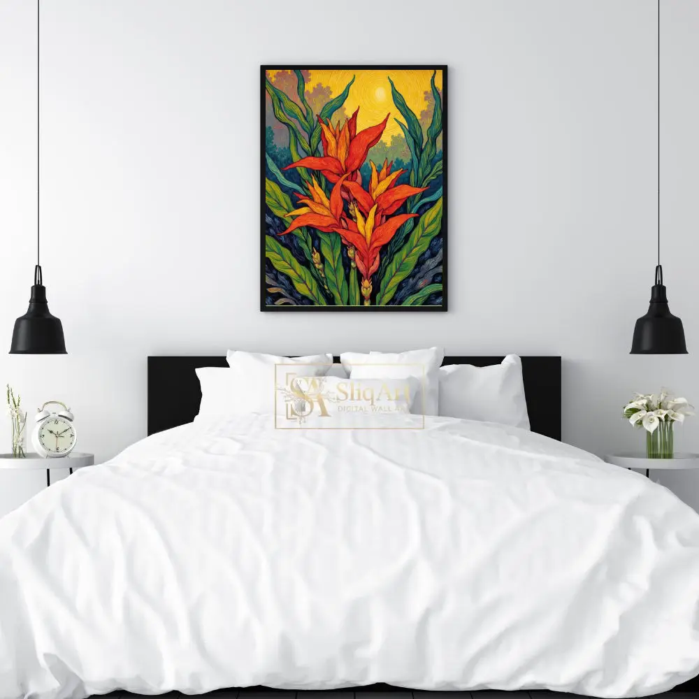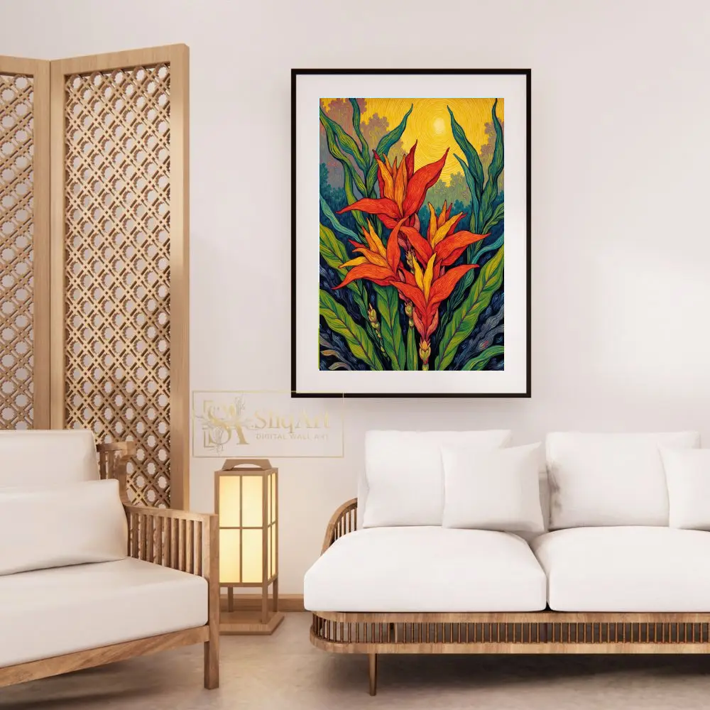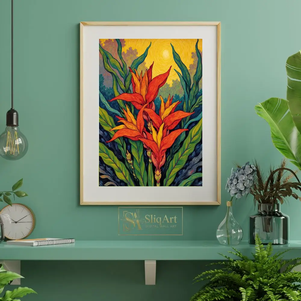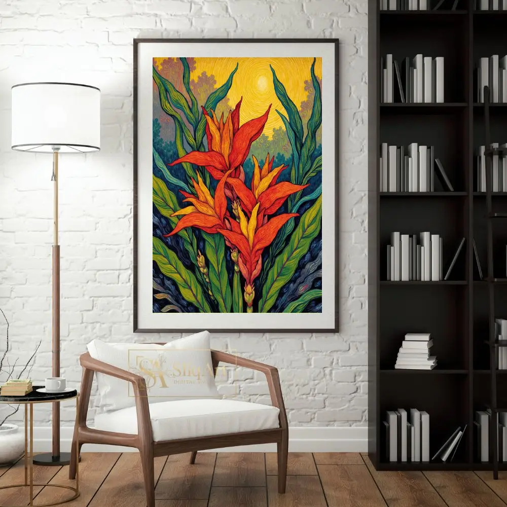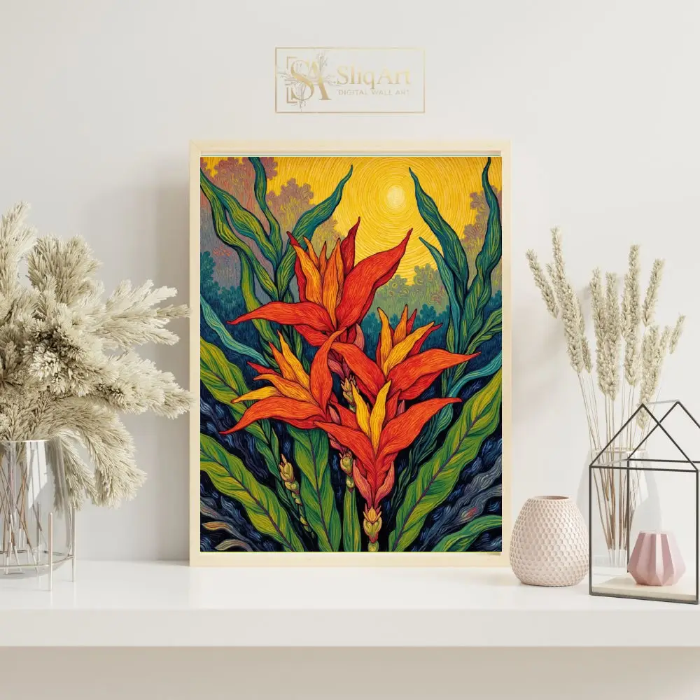 Immerse yourself in the radiant energy of the tropics with this post-impressionist masterpiece. The artwork features stylized tropical blooms in fiery shades of orange and red, reaching toward a swirling, golden sun.