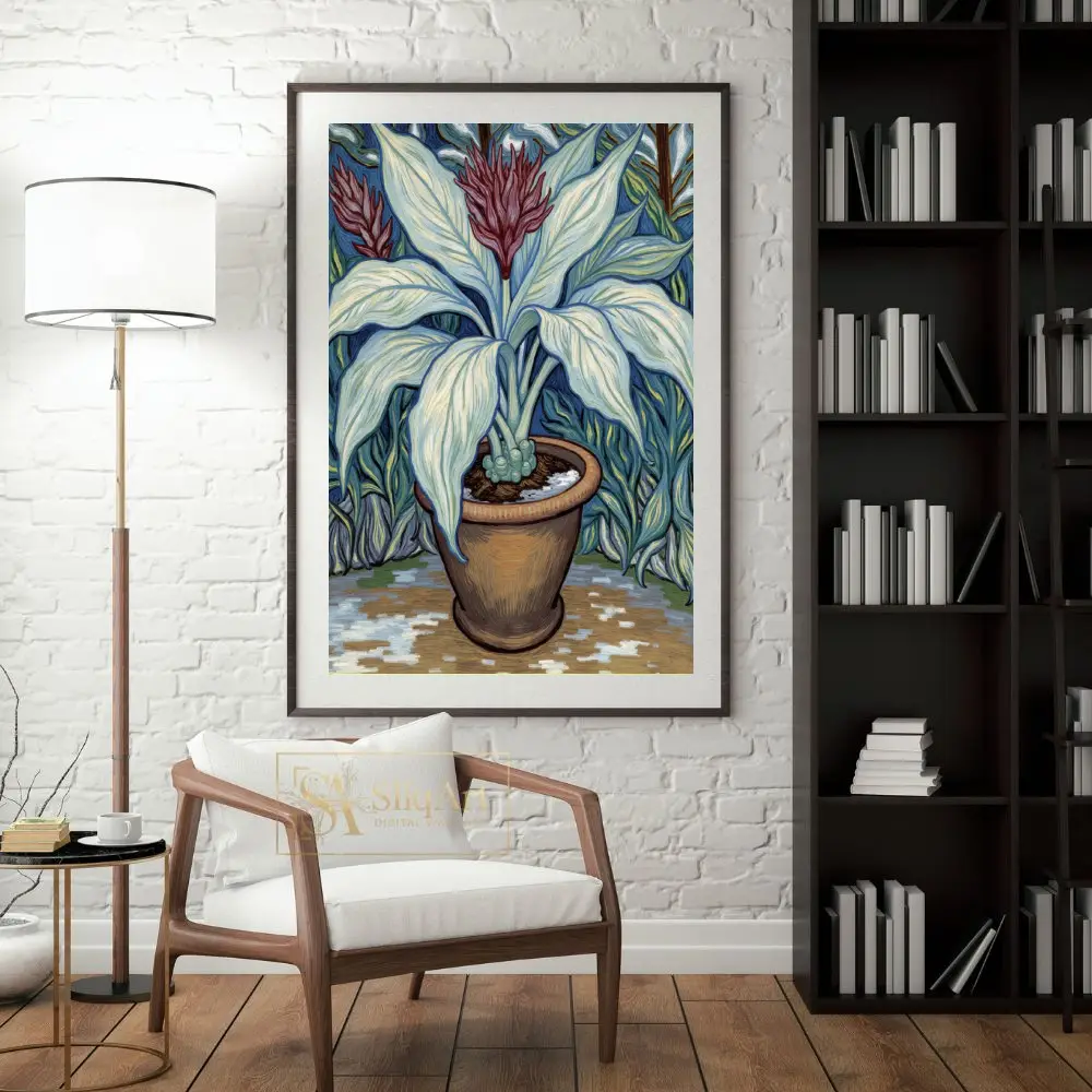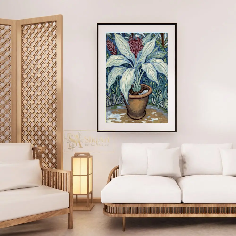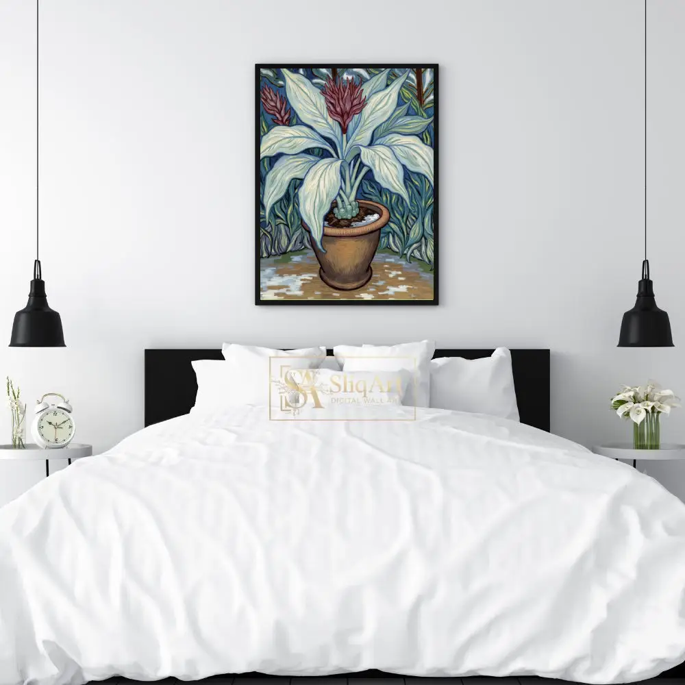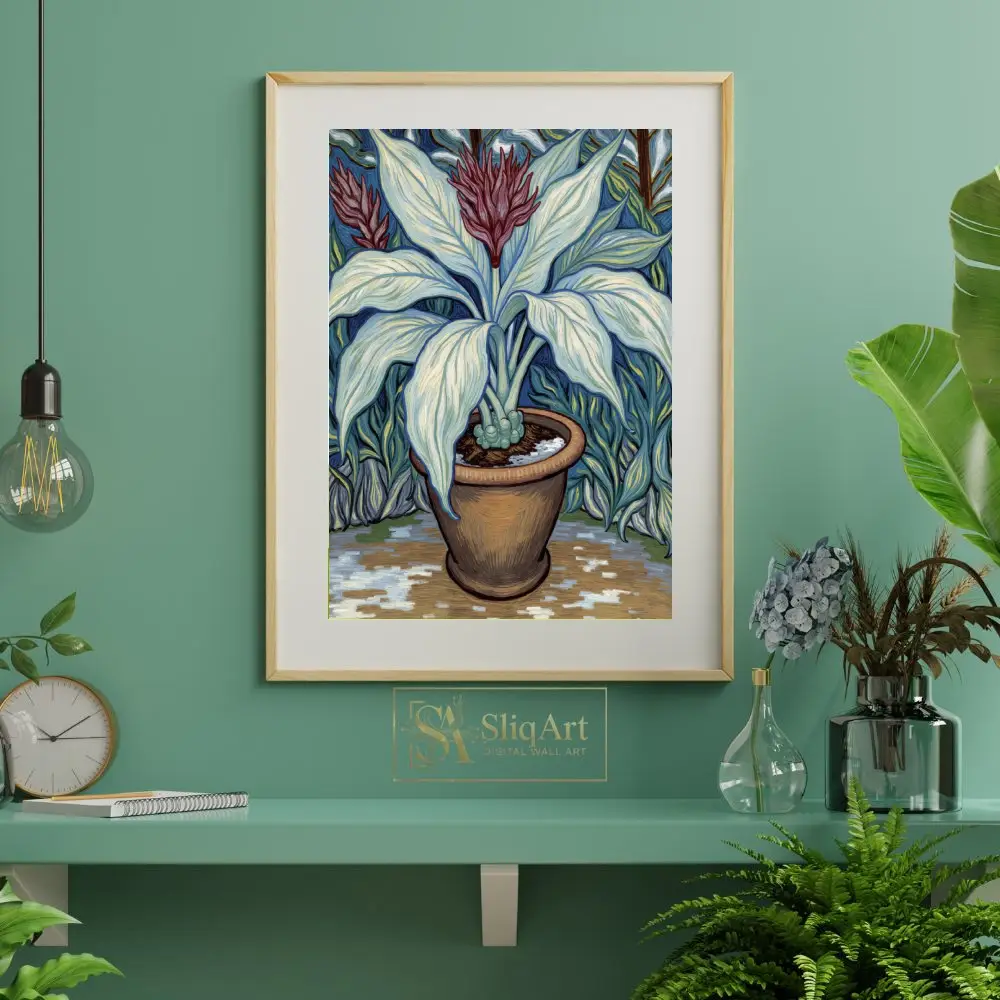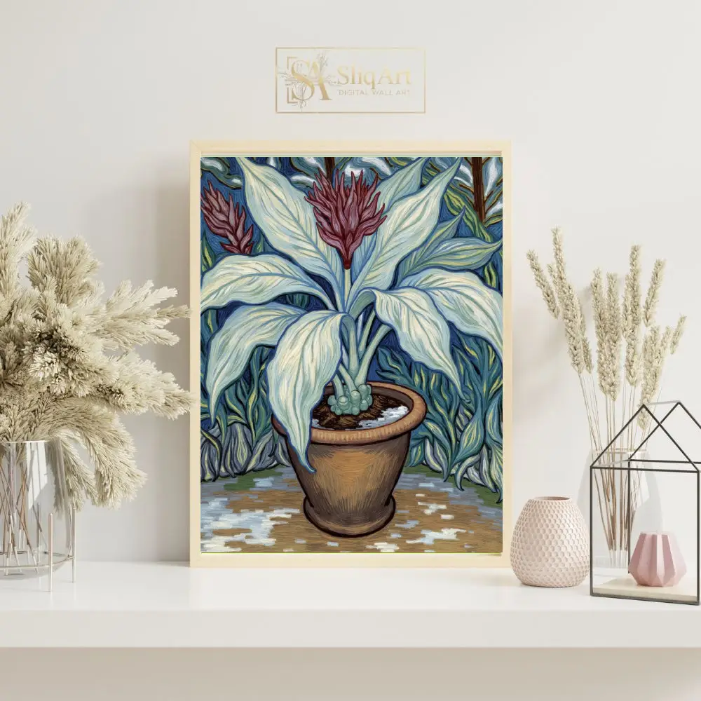 Enhance your living space with this exquisite Impressionist-style botanical art piece. The artwork showcases a potted plant with elegantly curved, pale blue-green leaves and a vibrant maroon floral crown.