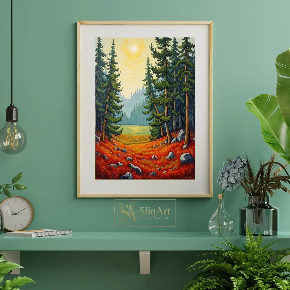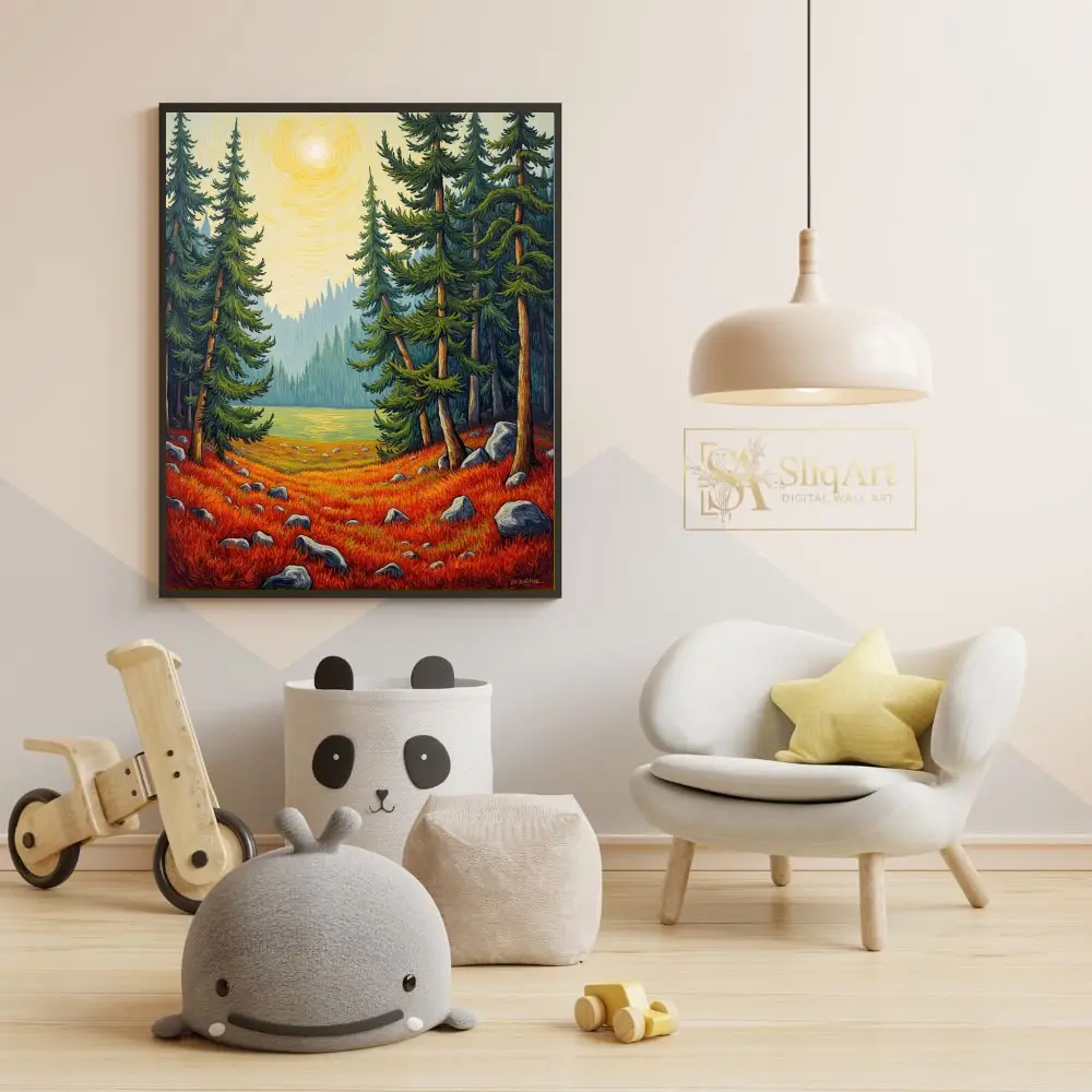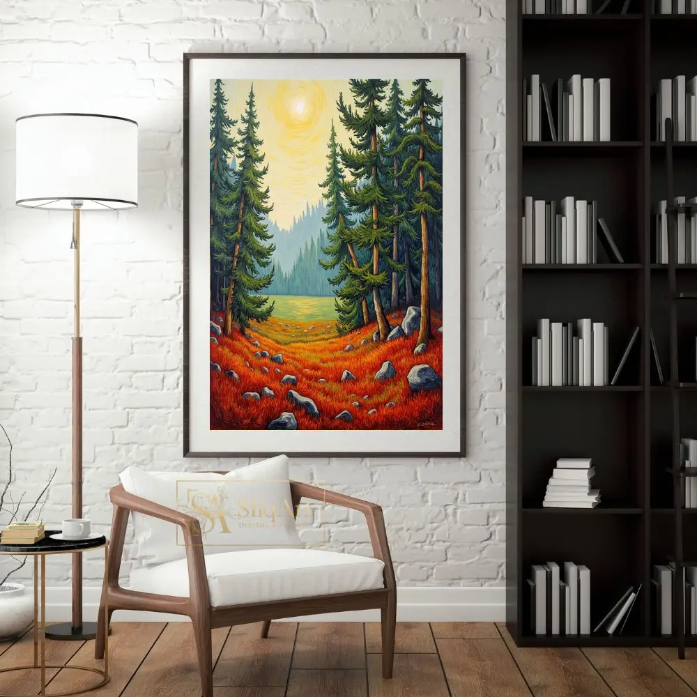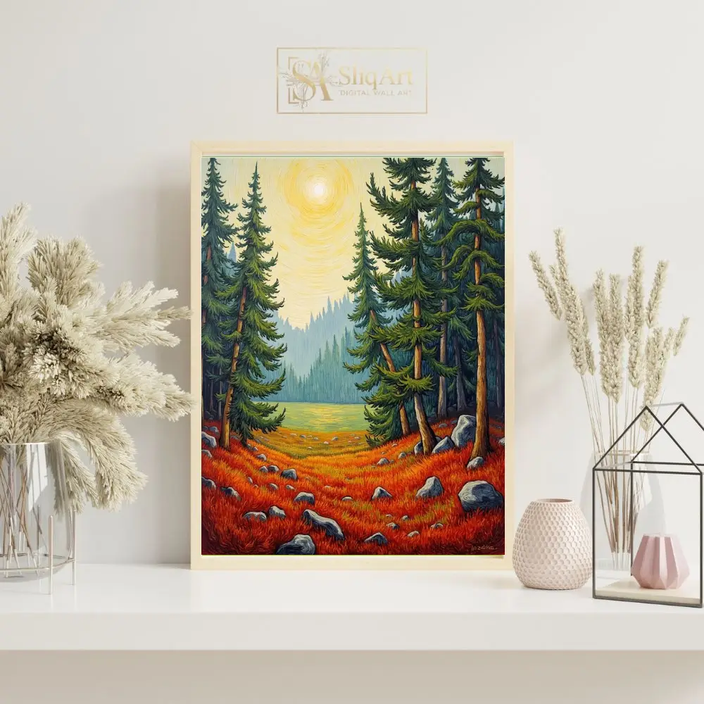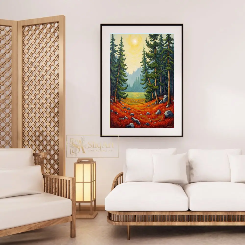 Framed by towering evergreen pines and overlooking a serene mountain lake, this piece uses rhythmic, textured line work to create a sense of movement and life. Perfect for bringing the vibrant colors of an autumn woodland into your interior space, this print combines modern illustrative techniques with a timeless folk-art sensibility.