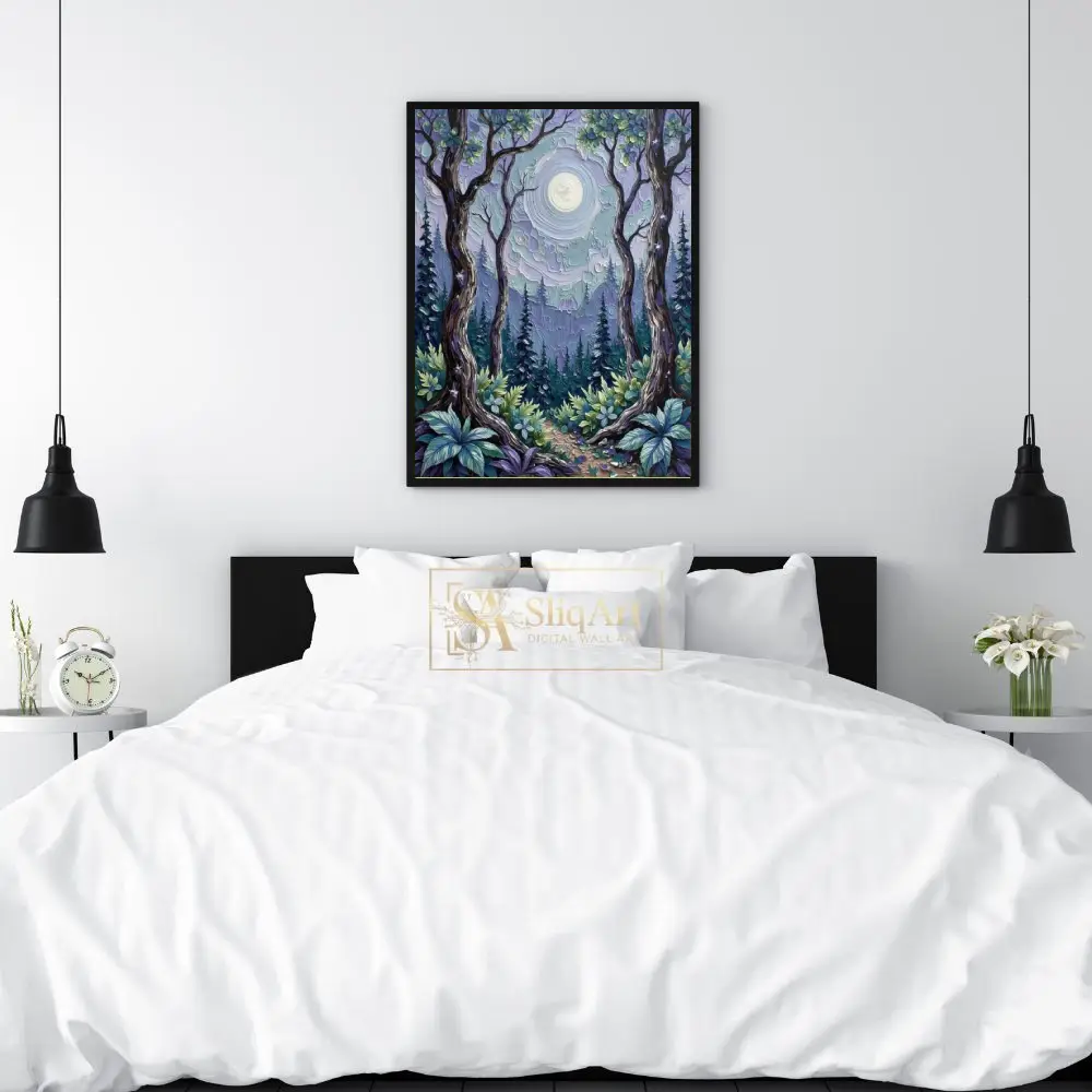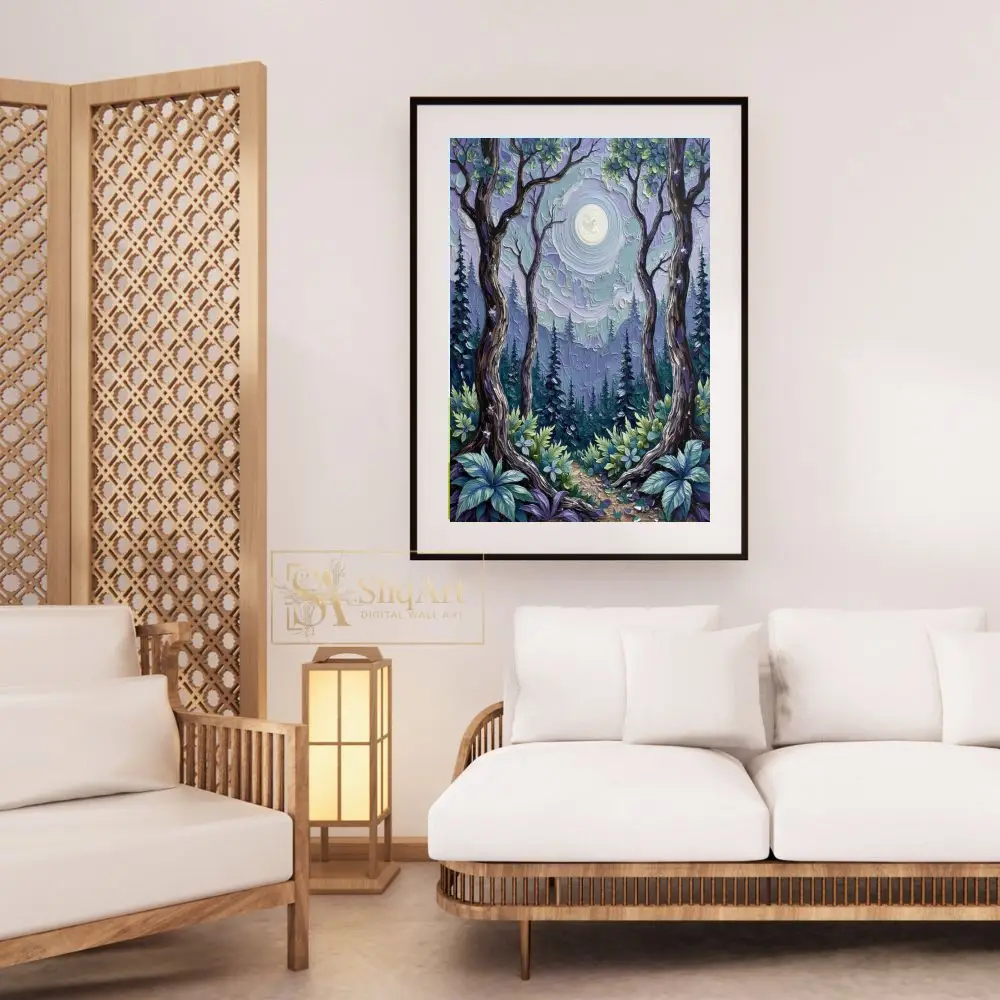 Two majestic, gnarled trees frame a central view of a dense pine forest bathed in the ethereal glow of a large, luminous full moon. The sky is a whirlpool of lavender and pale blue, while the foreground flourishes with stylized foliage in deep teals and soft greens. This piece beautifully balances a sense of mystical wonder with the calming rhythm of nature, making it a perfect centerpiece for any modern home.