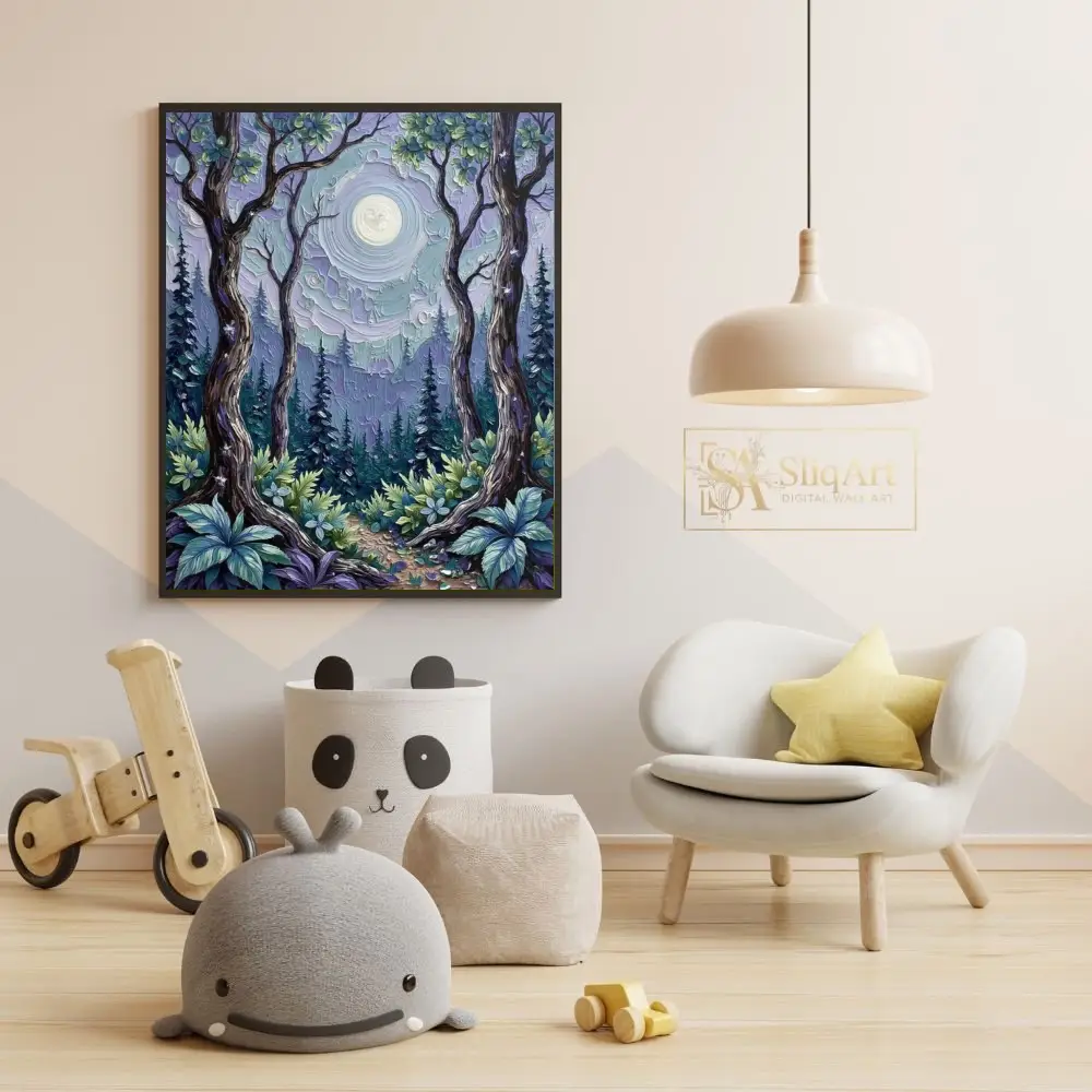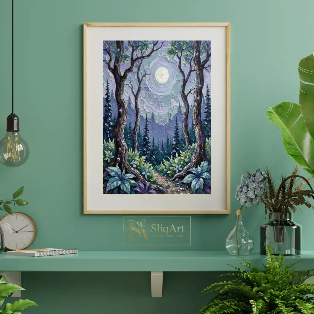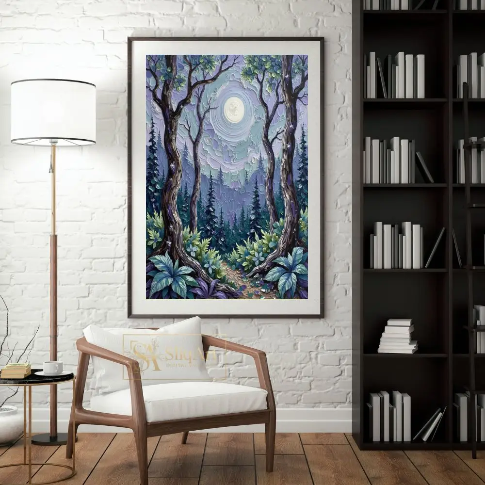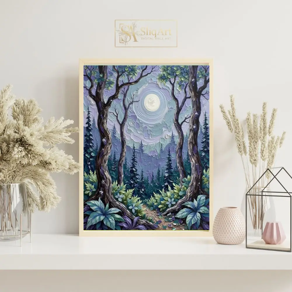 Step into a dream with this captivating impasto oil painting of an enchanted moonlit forest. This artwork features heavy, expressive brushwork that creates a tactile, three-dimensional surface.