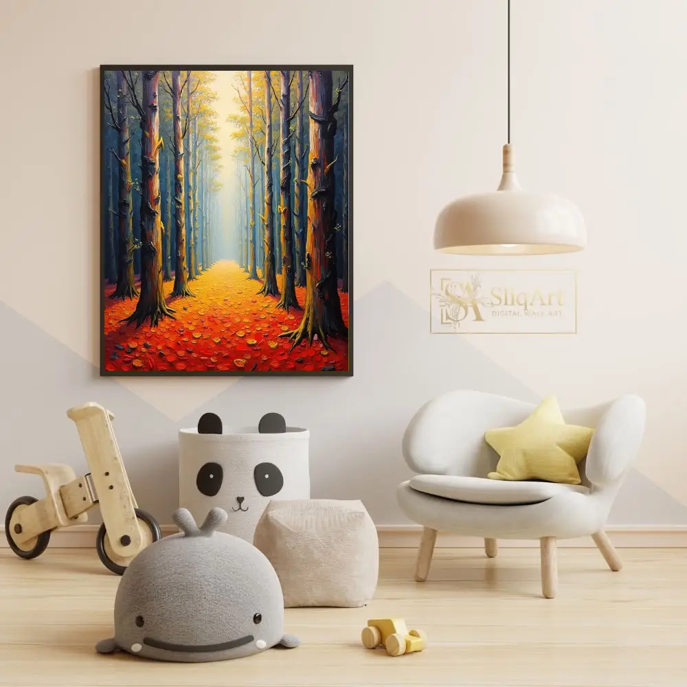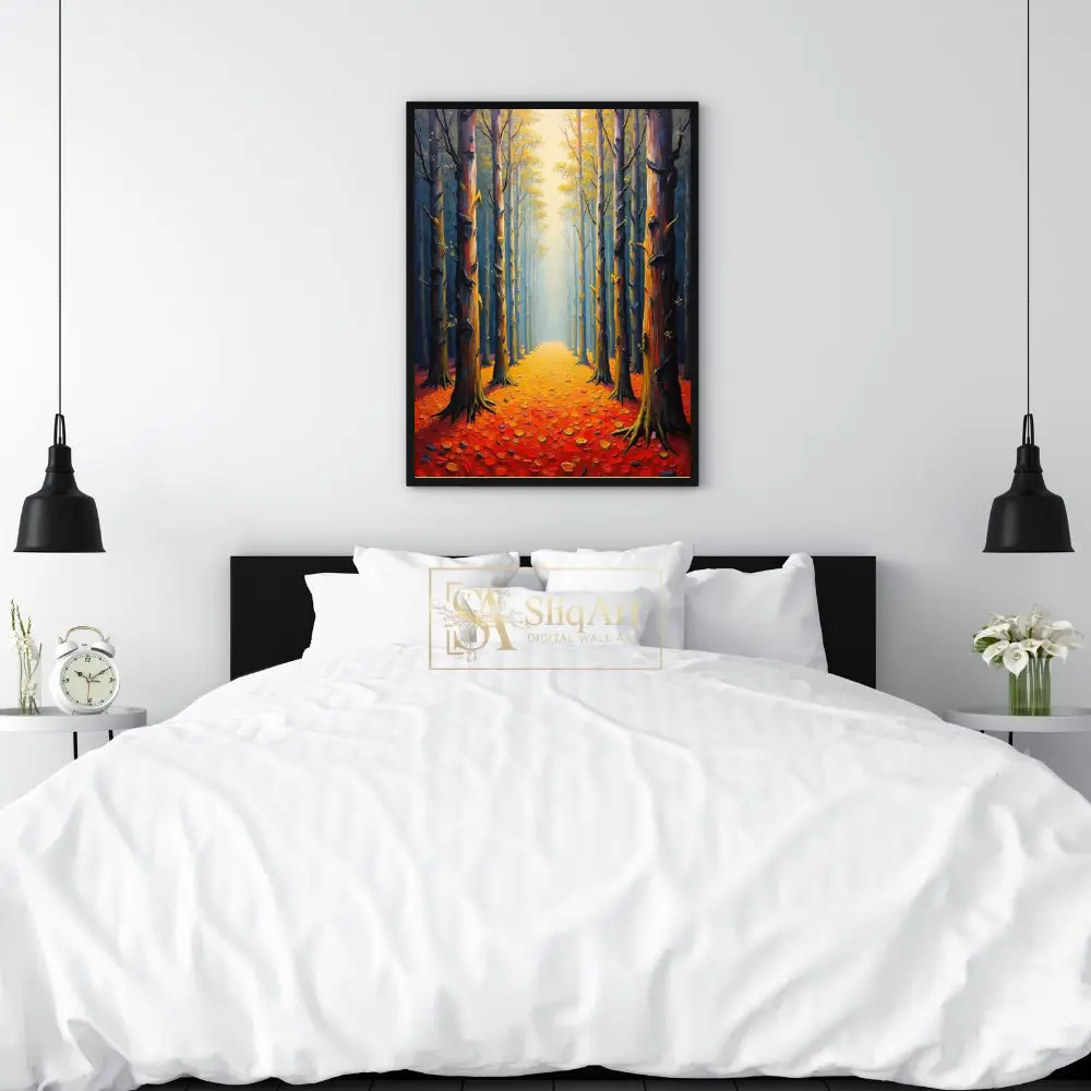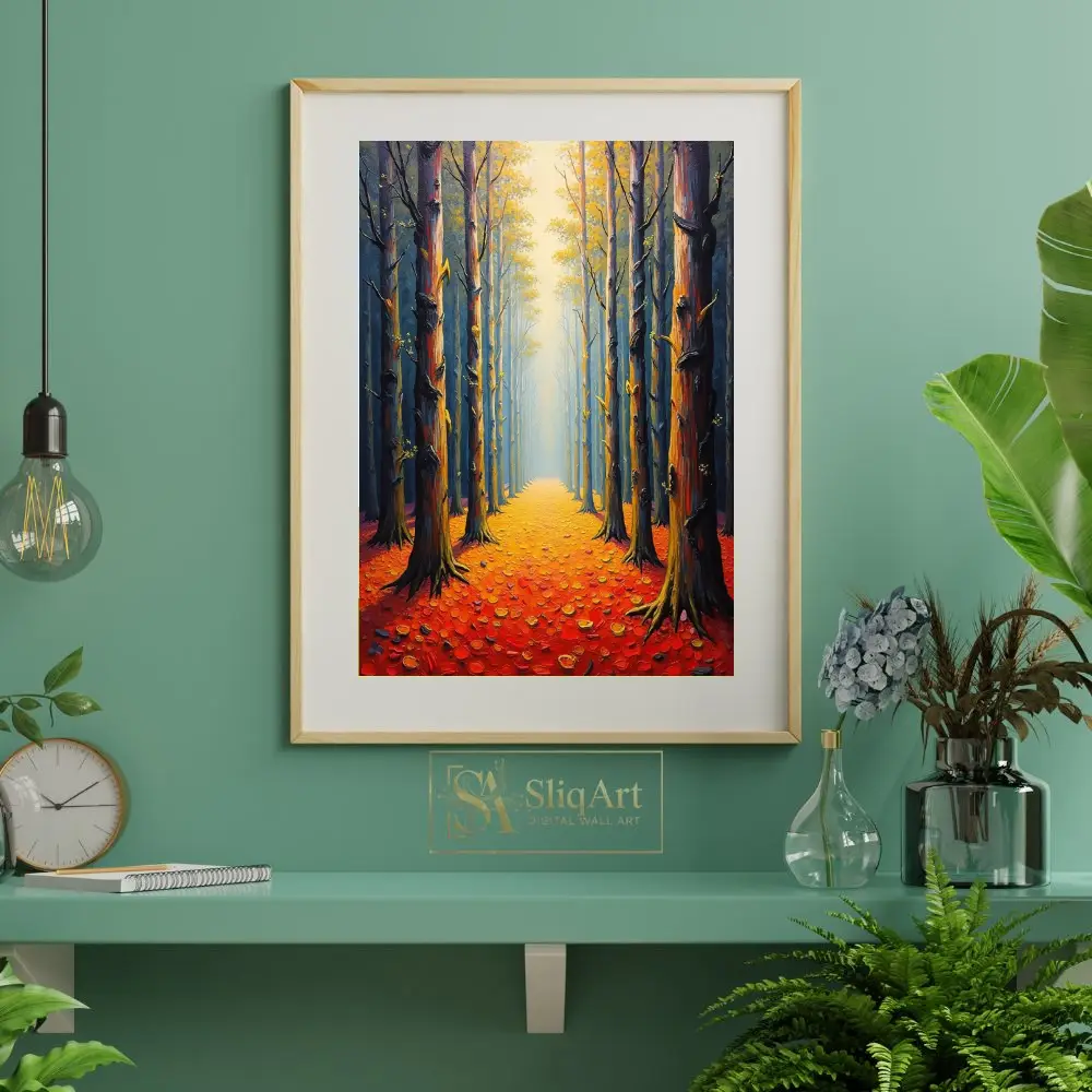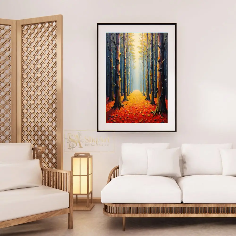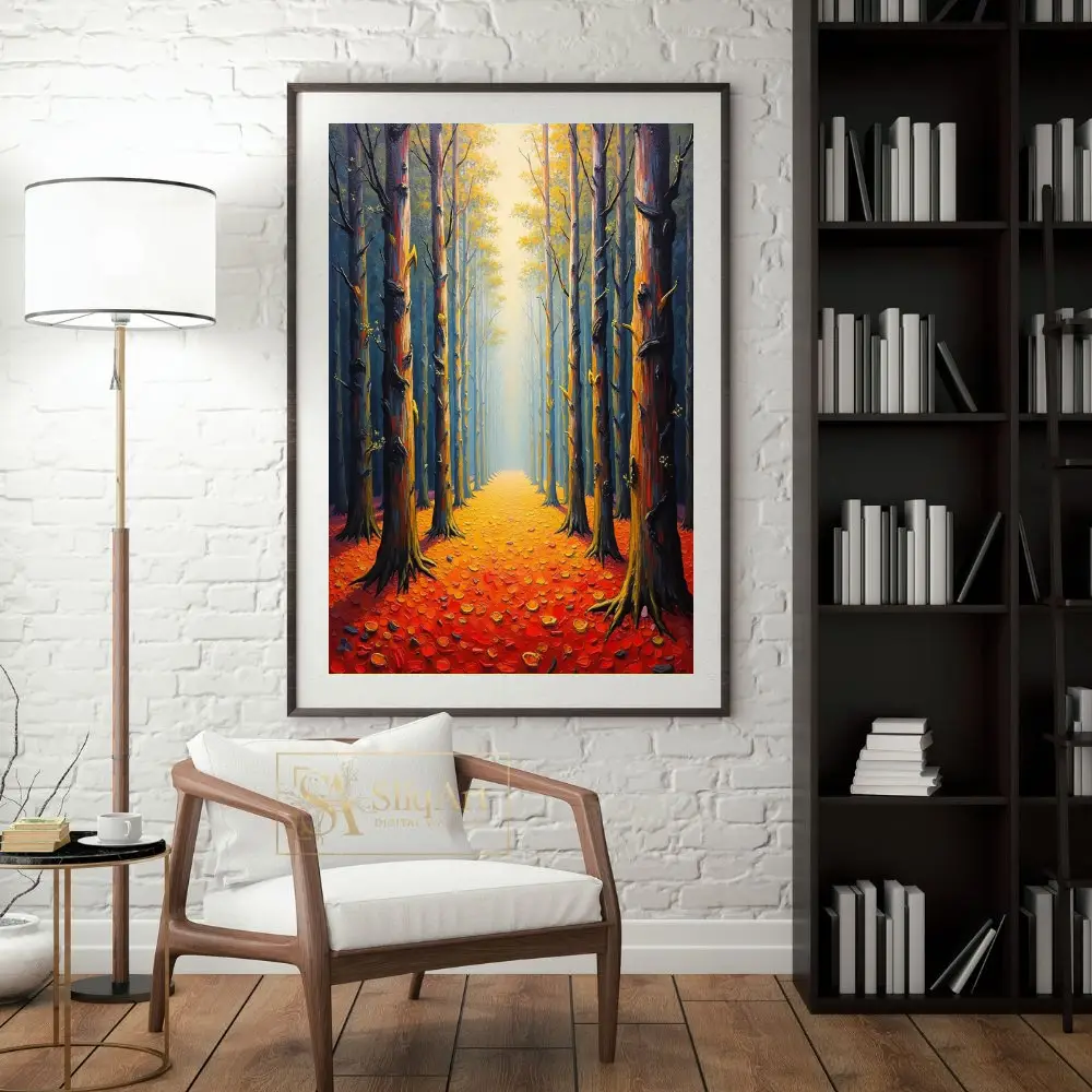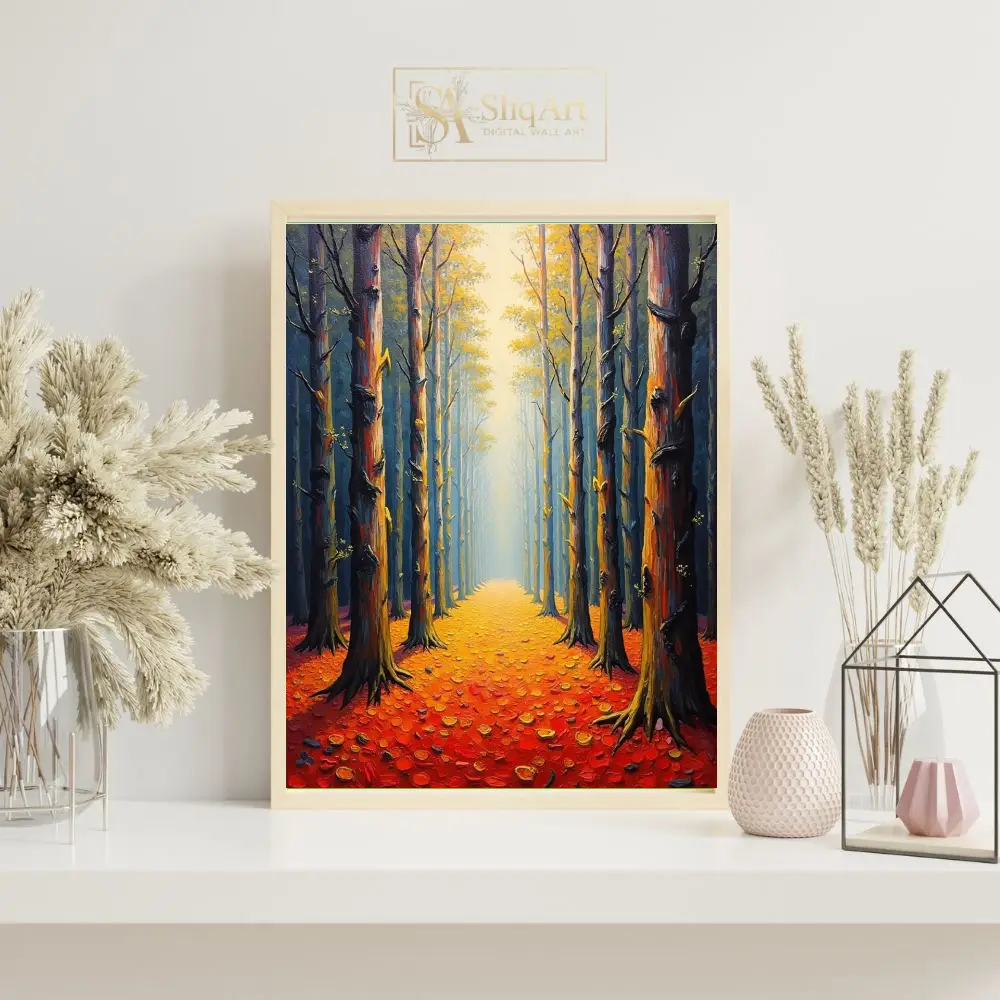 Immerse yourself in the vibrant warmth of autumn with this stunning impressionist forest landscape. This piece features a symmetrical path of towering, textured trees that lead the eye toward a glowing, ethereal light at the horizon.