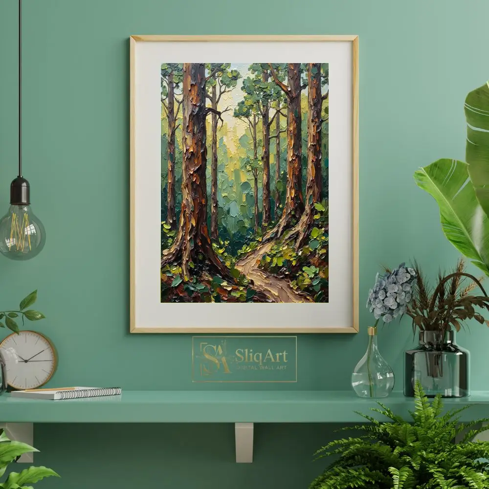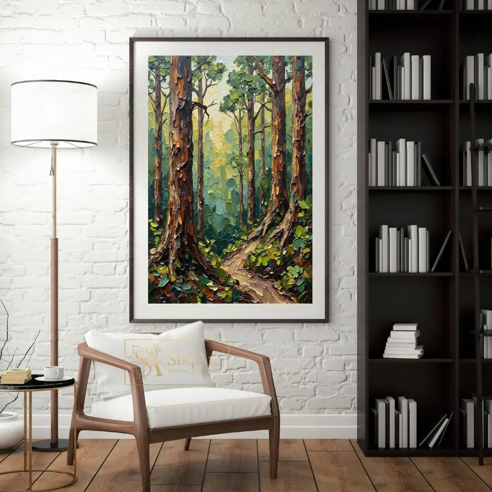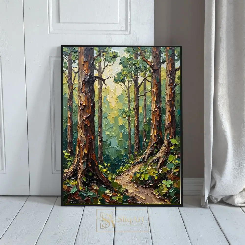 Transform your living space into a serene woodland retreat with this exquisite impasto-style forest painting. The artwork features heavy, tactile palette knife textures that bring the towering tree trunks and lush canopy to life.