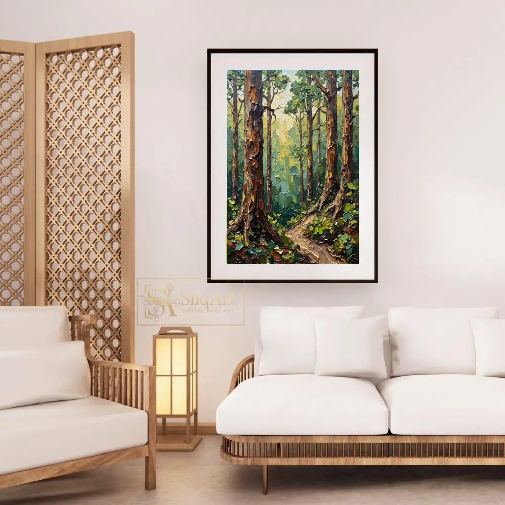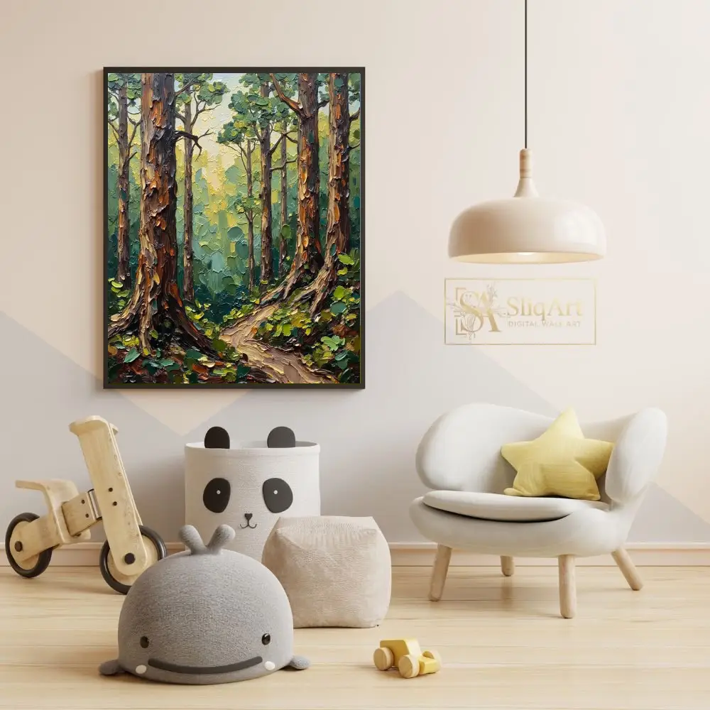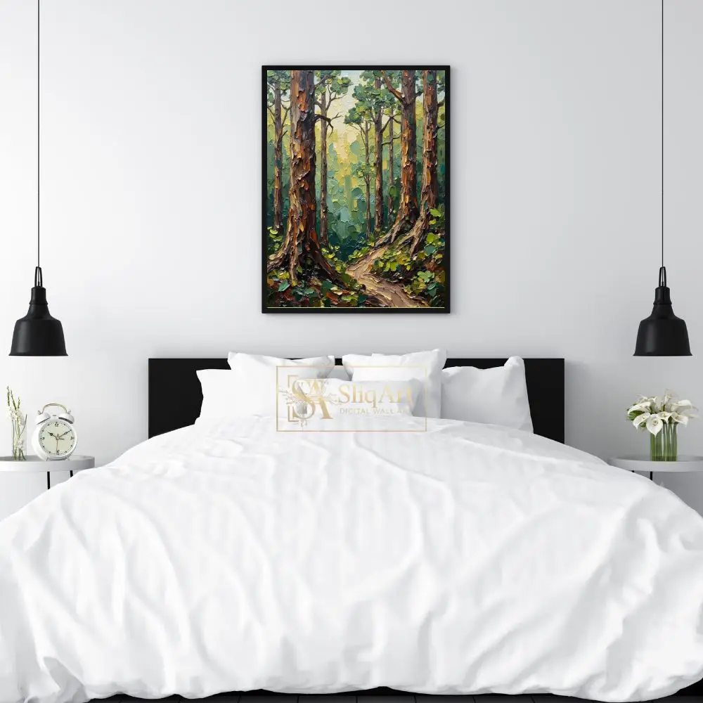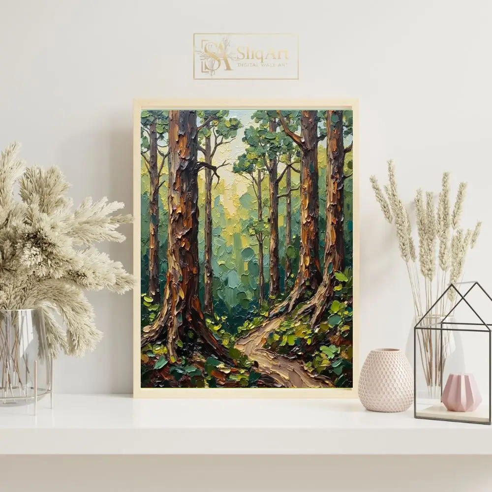Transform your living space into a serene woodland retreat with this exquisite impasto-style forest painting. The artwork features heavy, tactile palette knife textures that bring the towering tree trunks and lush canopy to life.