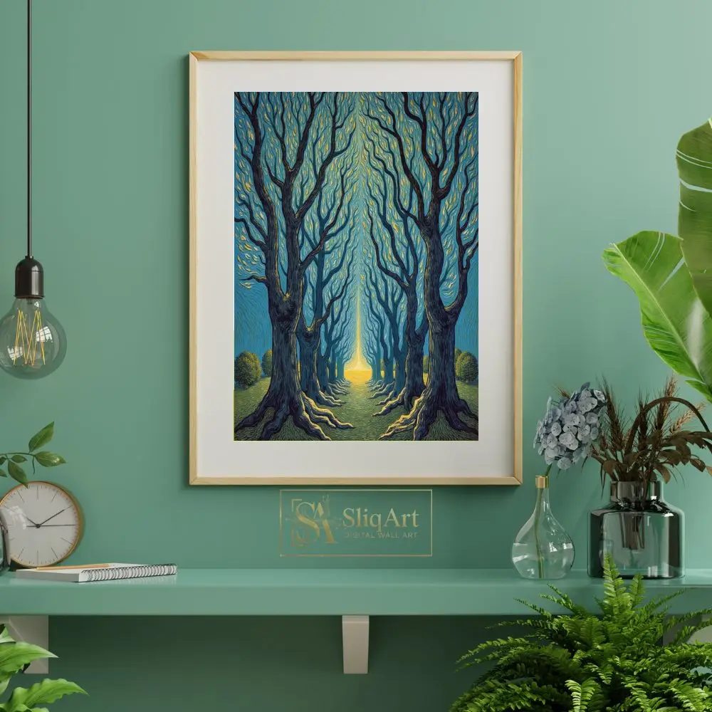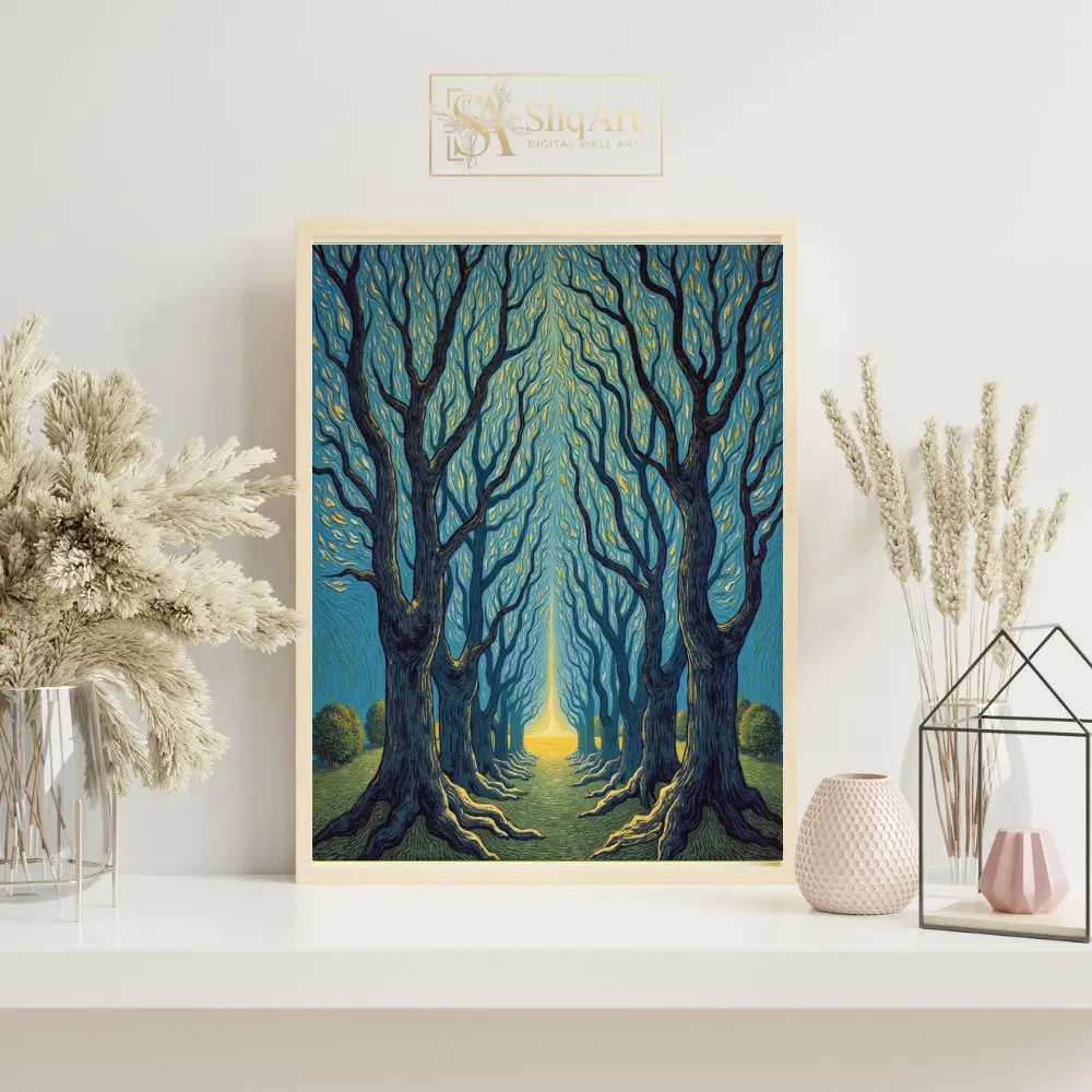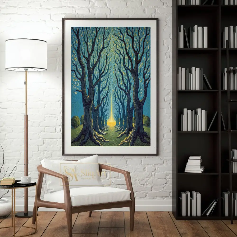 Immerse yourself in a rhythmic journey of color and light with this stunning Post-Impressionist landscape. This piece features a symmetrical avenue of towering trees, their branches reaching upward in swirling, Van Gogh-inspired patterns that guide the eye toward a radiant golden horizon.