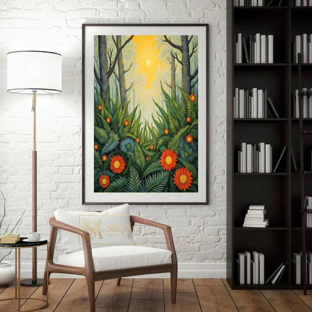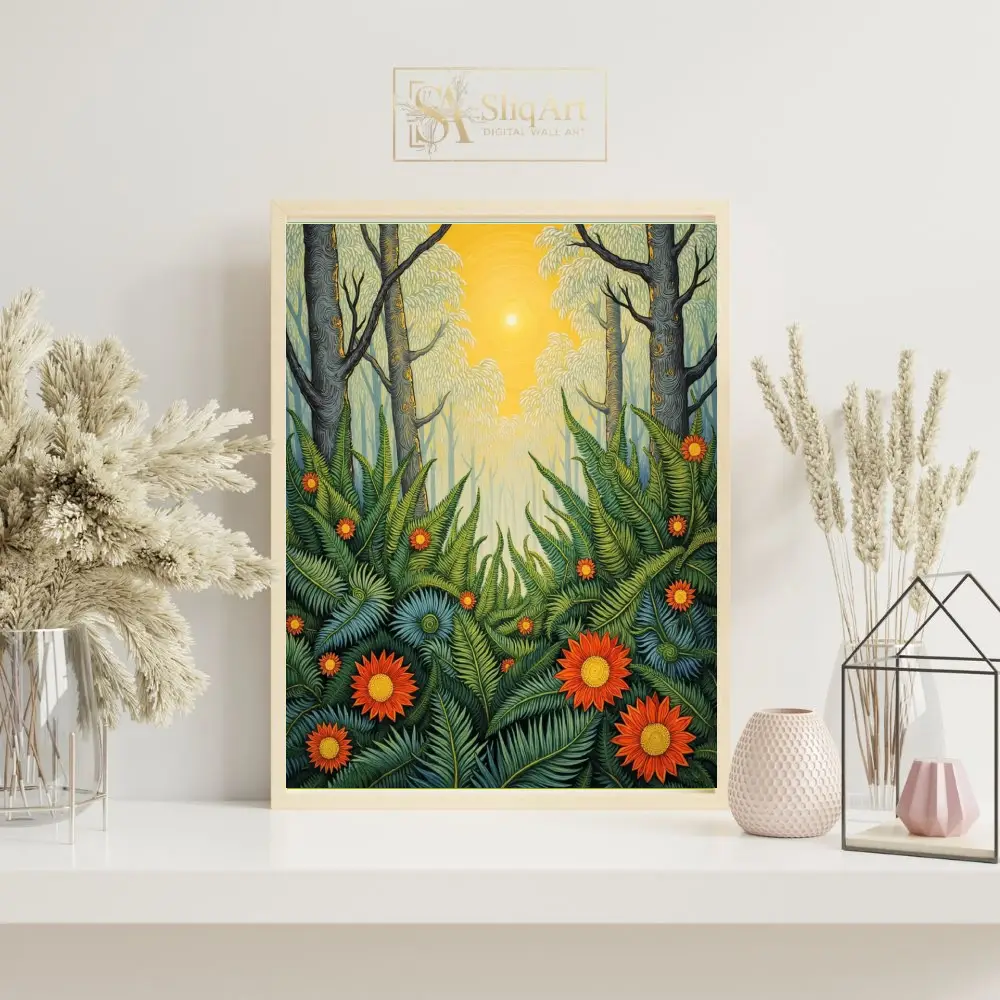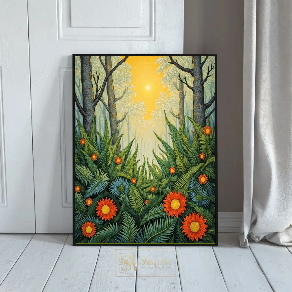 This artwork captures a mystical forest scene where a bright, centered sun radiates warmth through towering trees, illuminating a lush undergrowth of intricate green ferns and striking orange-red flowers. The detailed line work and rich, layered patterns create a sense of depth and folk-art charm, making it a captivating focal point for any interior that craves the energy of the great outdoors.