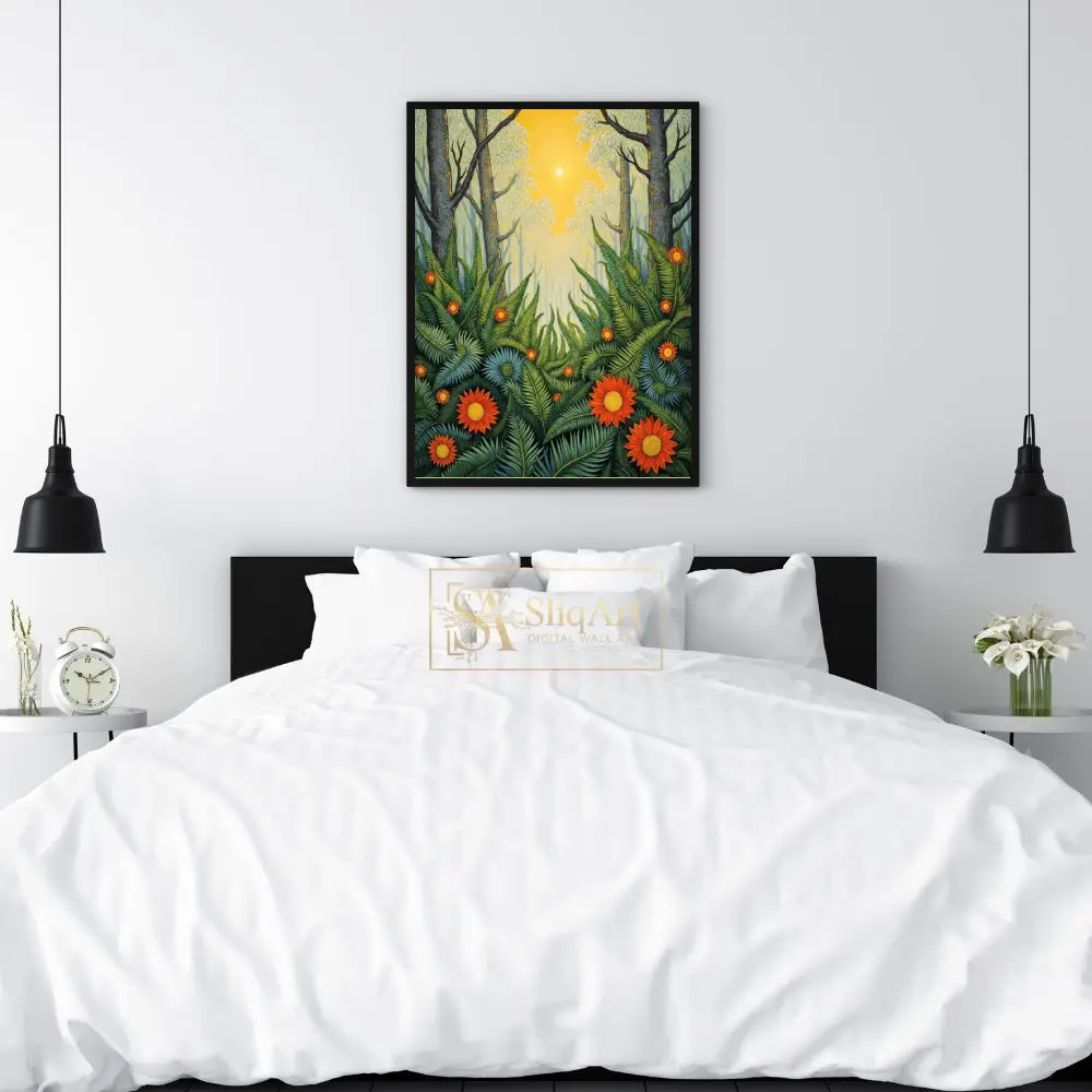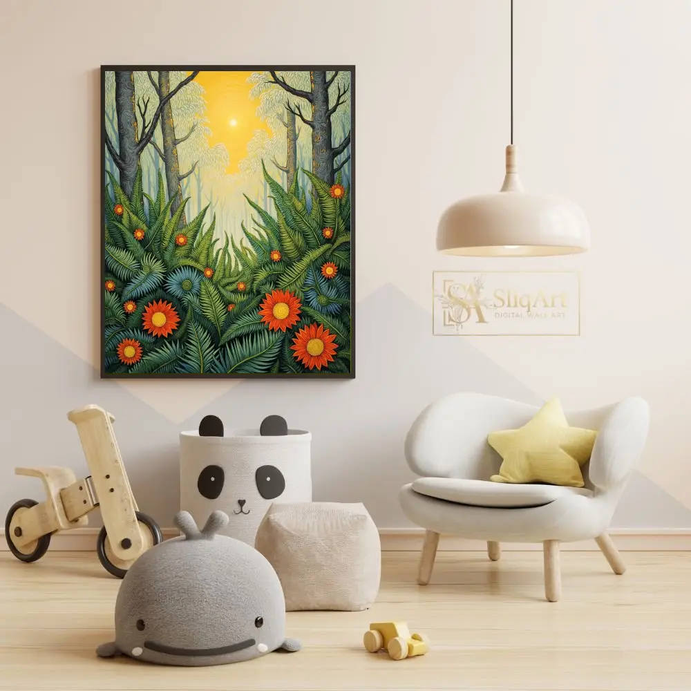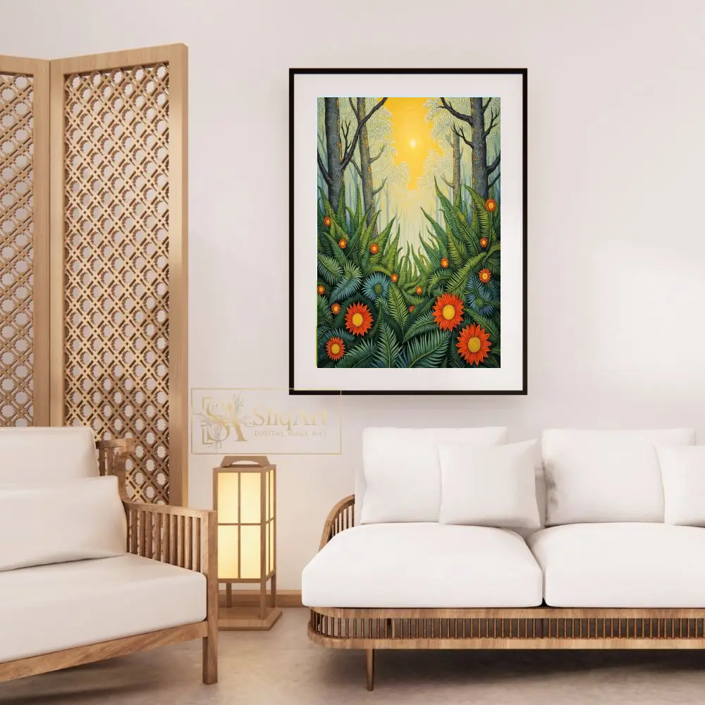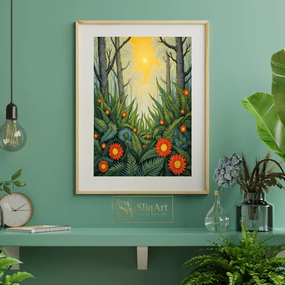 This artwork captures a mystical forest scene where a bright, centered sun radiates warmth through towering trees, illuminating a lush undergrowth of intricate green ferns and striking orange-red flowers. The detailed line work and rich, layered patterns create a sense of depth and folk-art charm, making it a captivating focal point for any interior that craves the energy of the great outdoors.