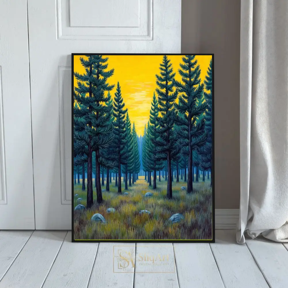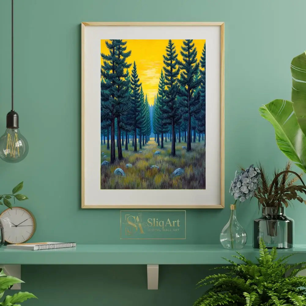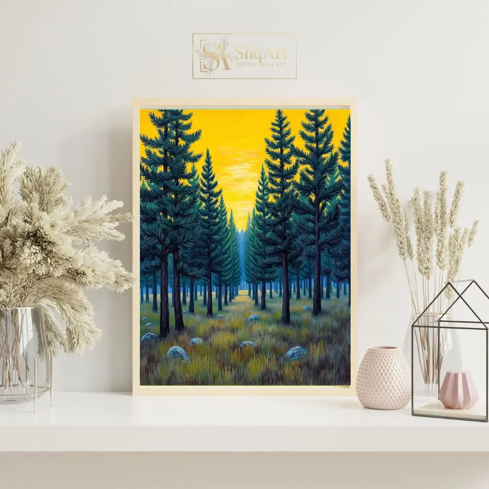 The symmetrical composition creates a sense of balance and tranquility, while the rich teal and deep green needles contrast beautifully against the radiant, mustard-yellow sky. Detailed textures in the grassy foreground and scattered stones add a touch of rustic charm to this modern illustrative landscape, making it a timeless addition to any nature-lover’s collection.
