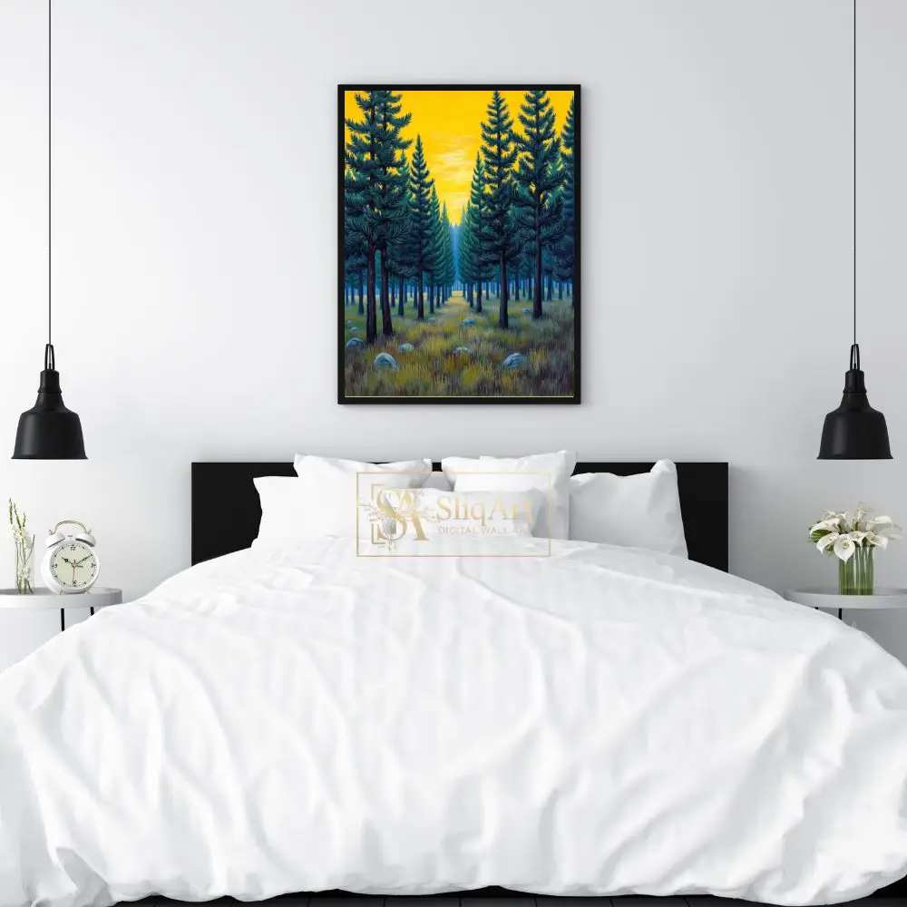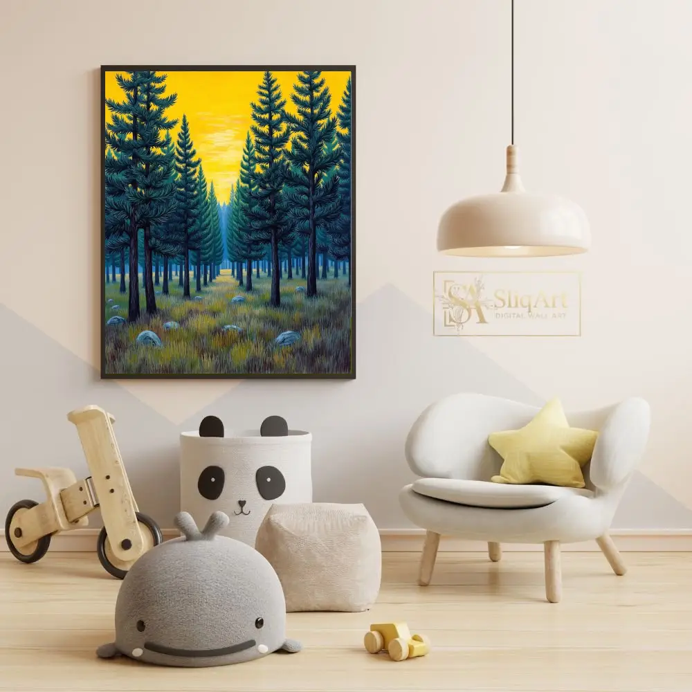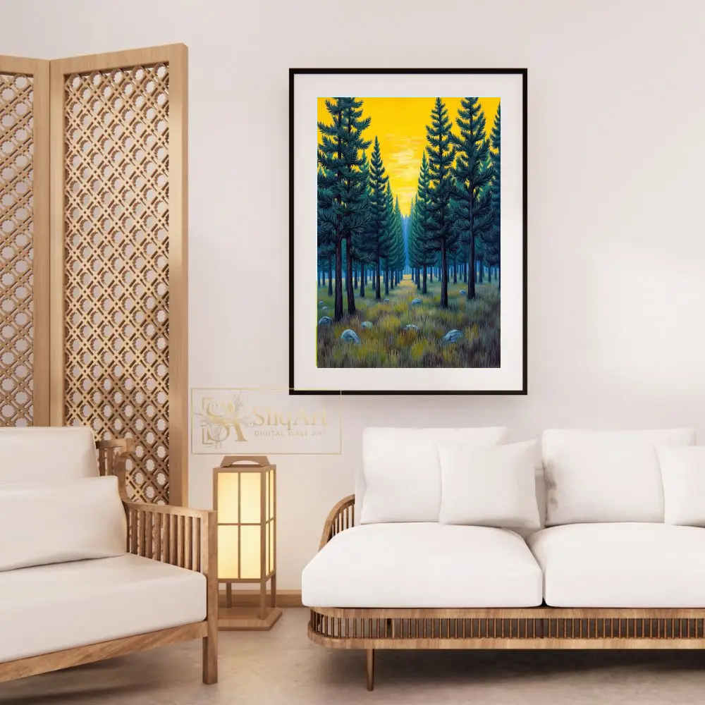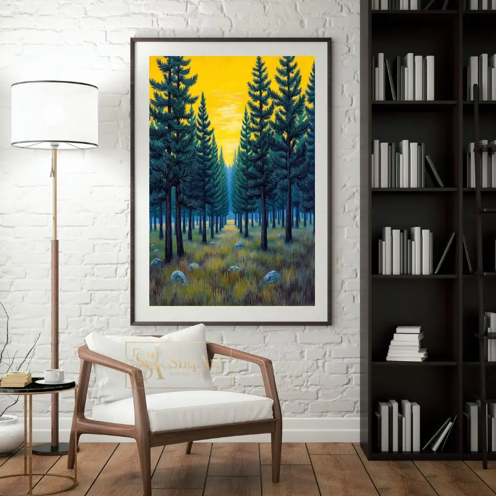 The symmetrical composition creates a sense of balance and tranquility, while the rich teal and deep green needles contrast beautifully against the radiant, mustard-yellow sky. Detailed textures in the grassy foreground and scattered stones add a touch of rustic charm to this modern illustrative landscape, making it a timeless addition to any nature-lover’s collection.