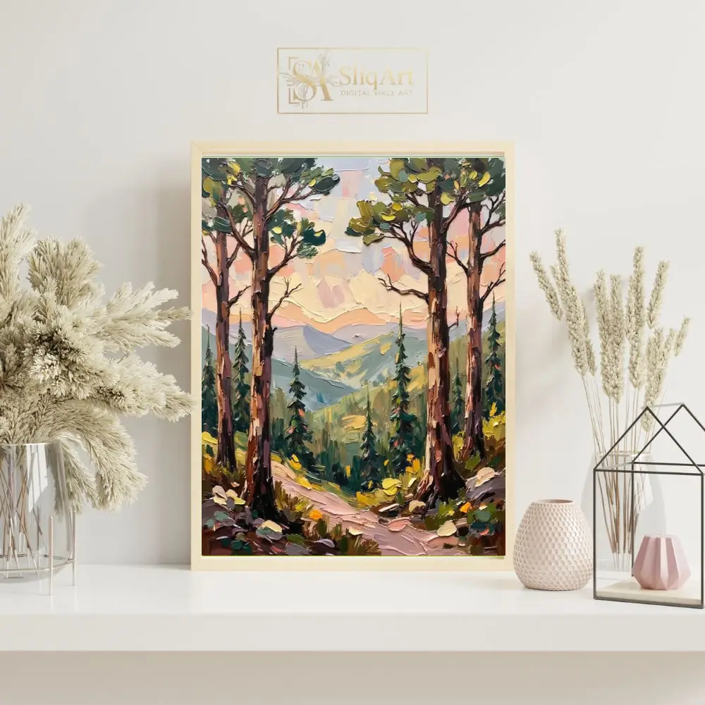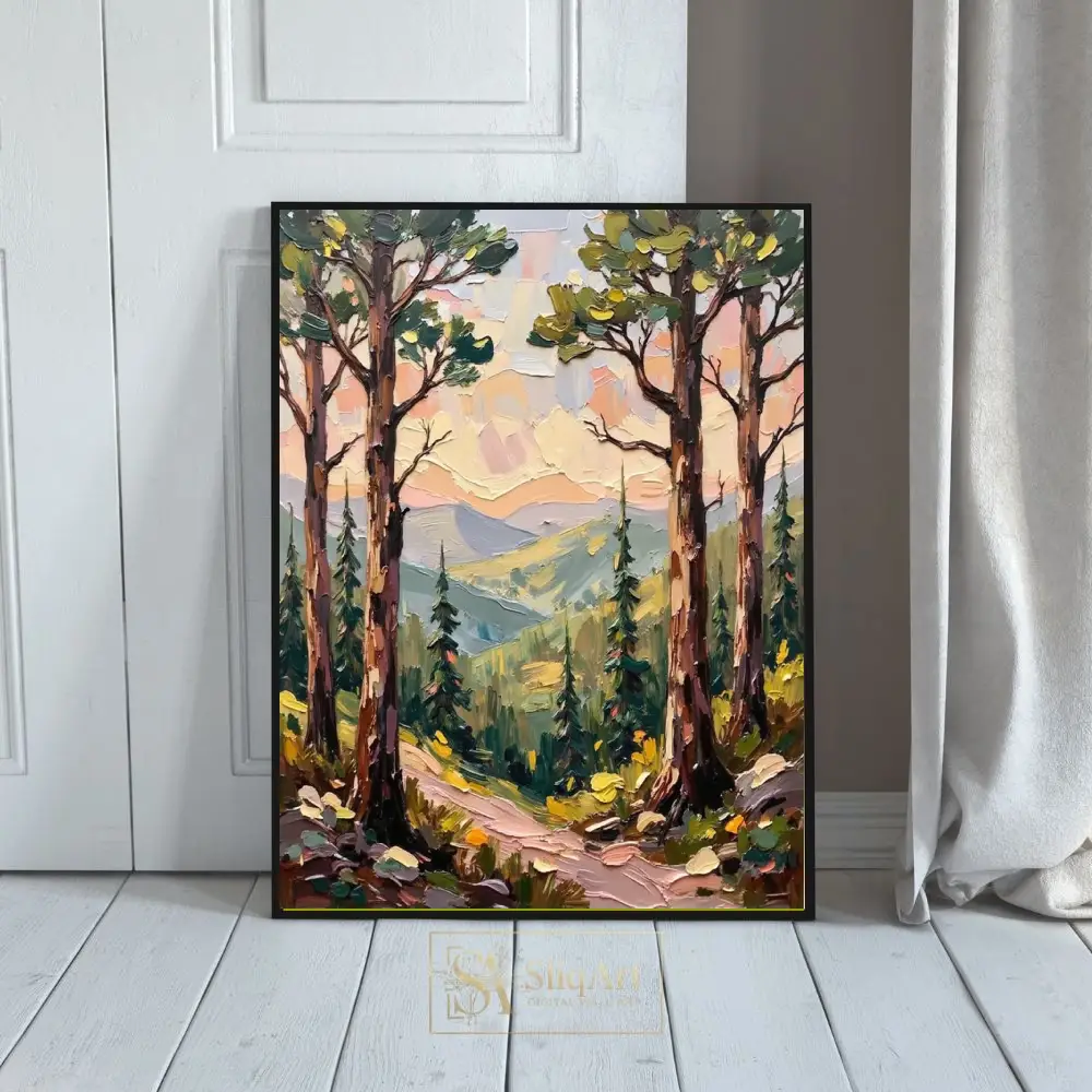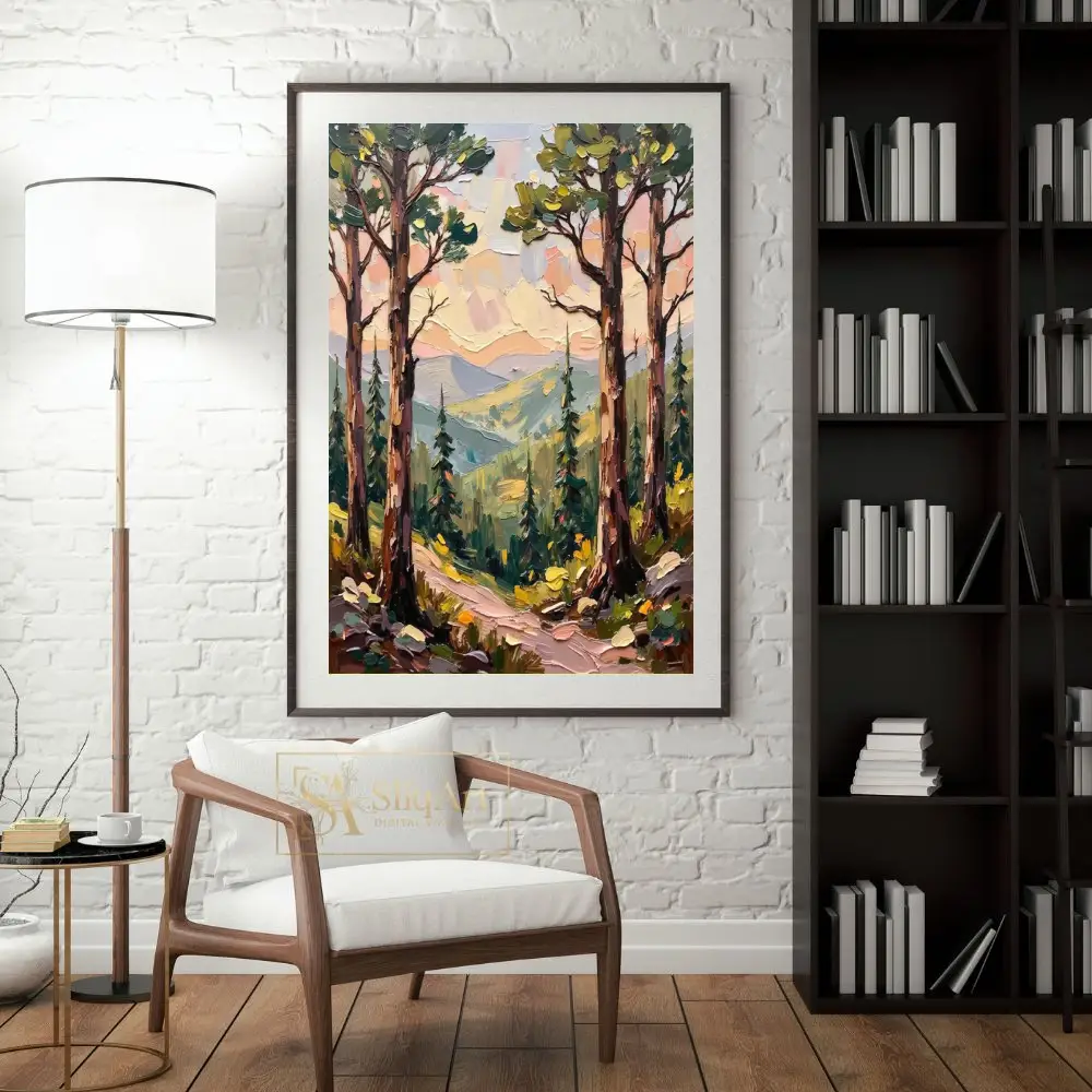 The artist uses thick, bold palette knife strokes to create a sense of physical presence, from the rugged bark of the evergreens to the soft, rolling hills in the distance. Bathed in the gentle glow of a sunset or sunrise, the sky hums with pastel peaches and lavenders, casting a tranquil light over the entire scene. This artwork perfectly blends modern impressionism with rustic charm, making it a sophisticated addition to any contemporary home.