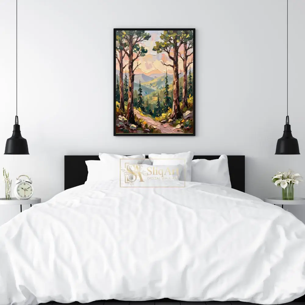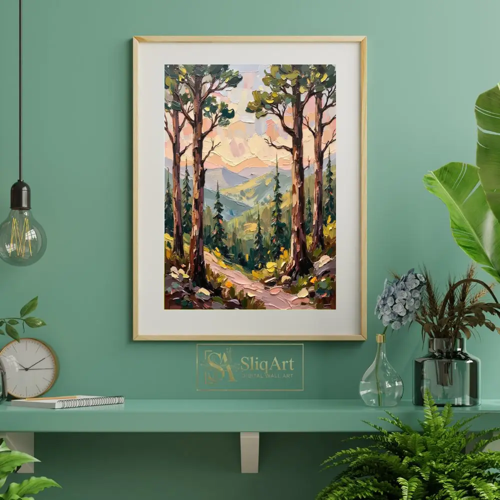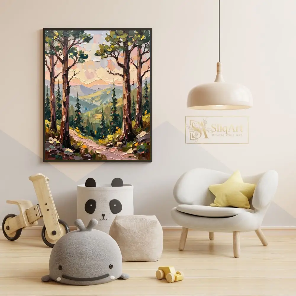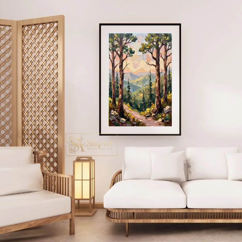 The artist uses thick, bold palette knife strokes to create a sense of physical presence, from the rugged bark of the evergreens to the soft, rolling hills in the distance. Bathed in the gentle glow of a sunset or sunrise, the sky hums with pastel peaches and lavenders, casting a tranquil light over the entire scene. This artwork perfectly blends modern impressionism with rustic charm, making it a sophisticated addition to any contemporary home.
