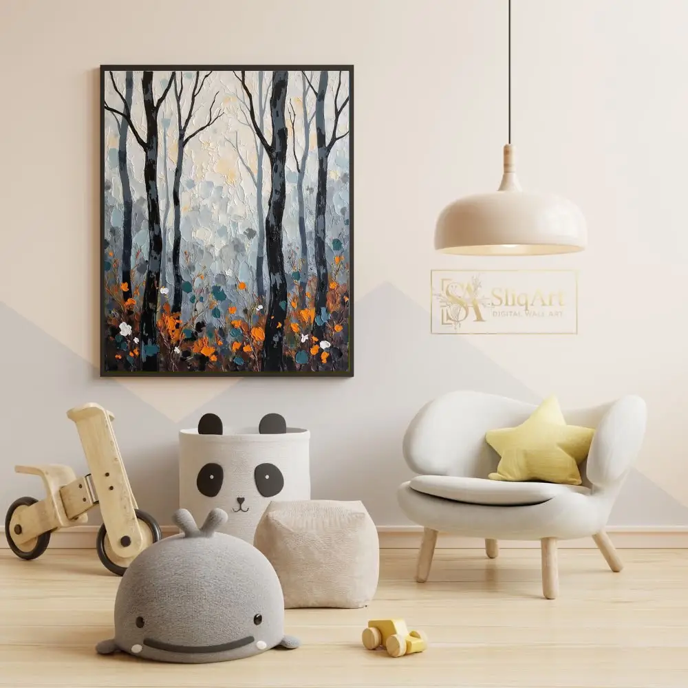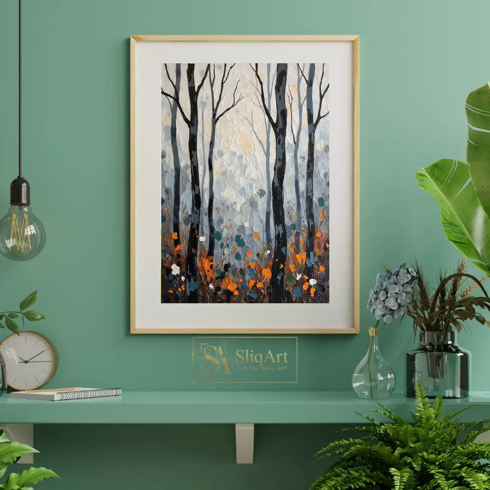 This striking forest landscape captures the quiet beauty of a woodland scene through rich, impasto textures. Slender, dark tree trunks stand in bold contrast against a luminous, neutral background of grey and cream.