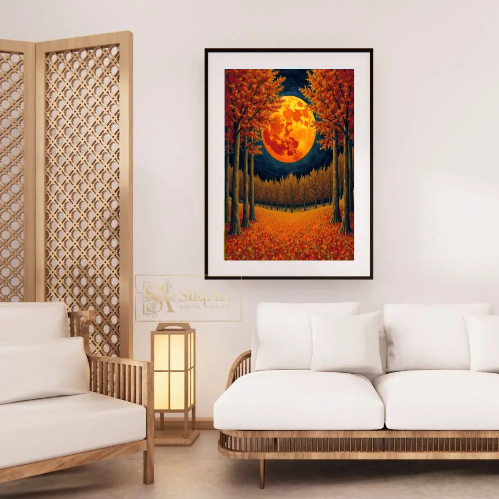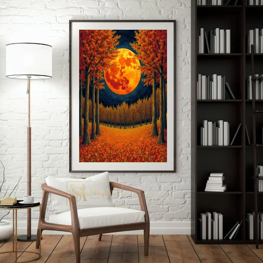 Immerse your space in the enchanting glow of the ‘Autumn Harvest Moon Forest’ canvas print. This striking piece captures a massive, fiery orange moon rising between perfectly symmetrical autumn trees, casting a warm light over a forest floor blanketed in fallen red and gold leaves.