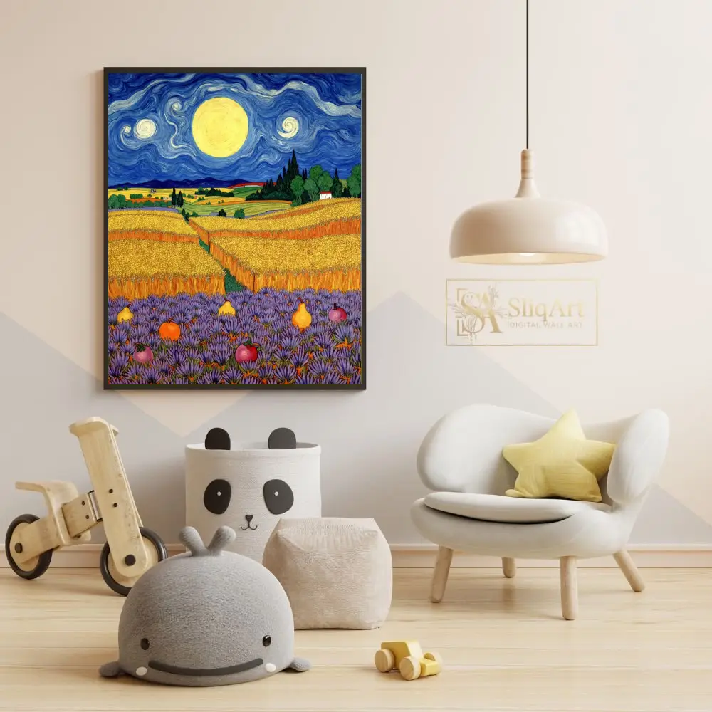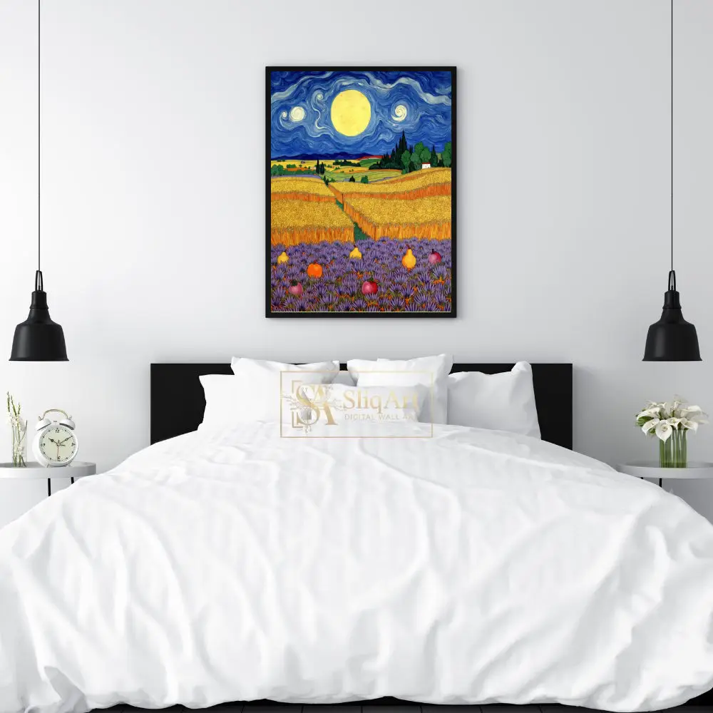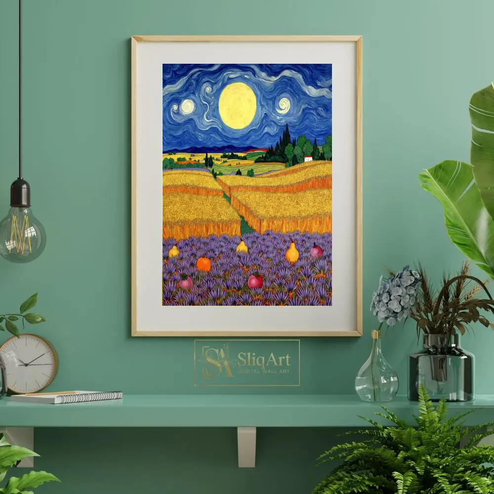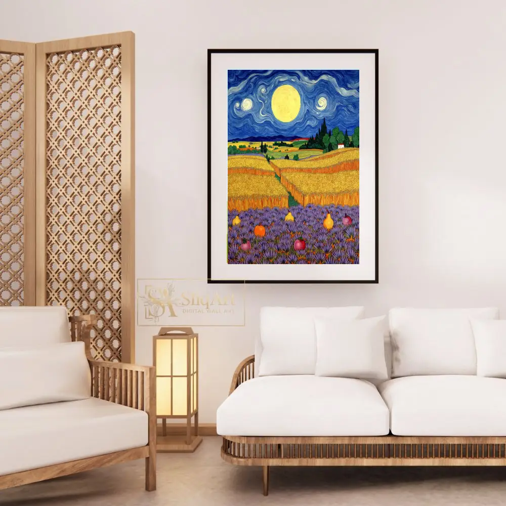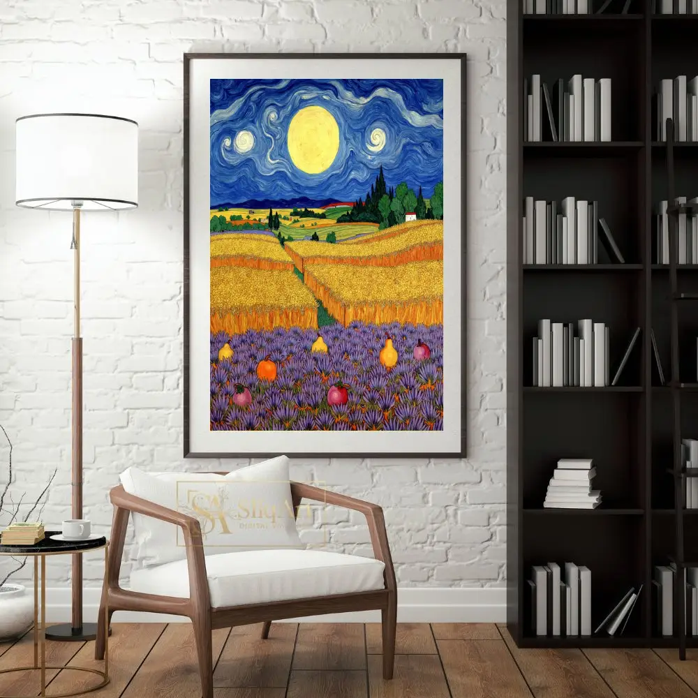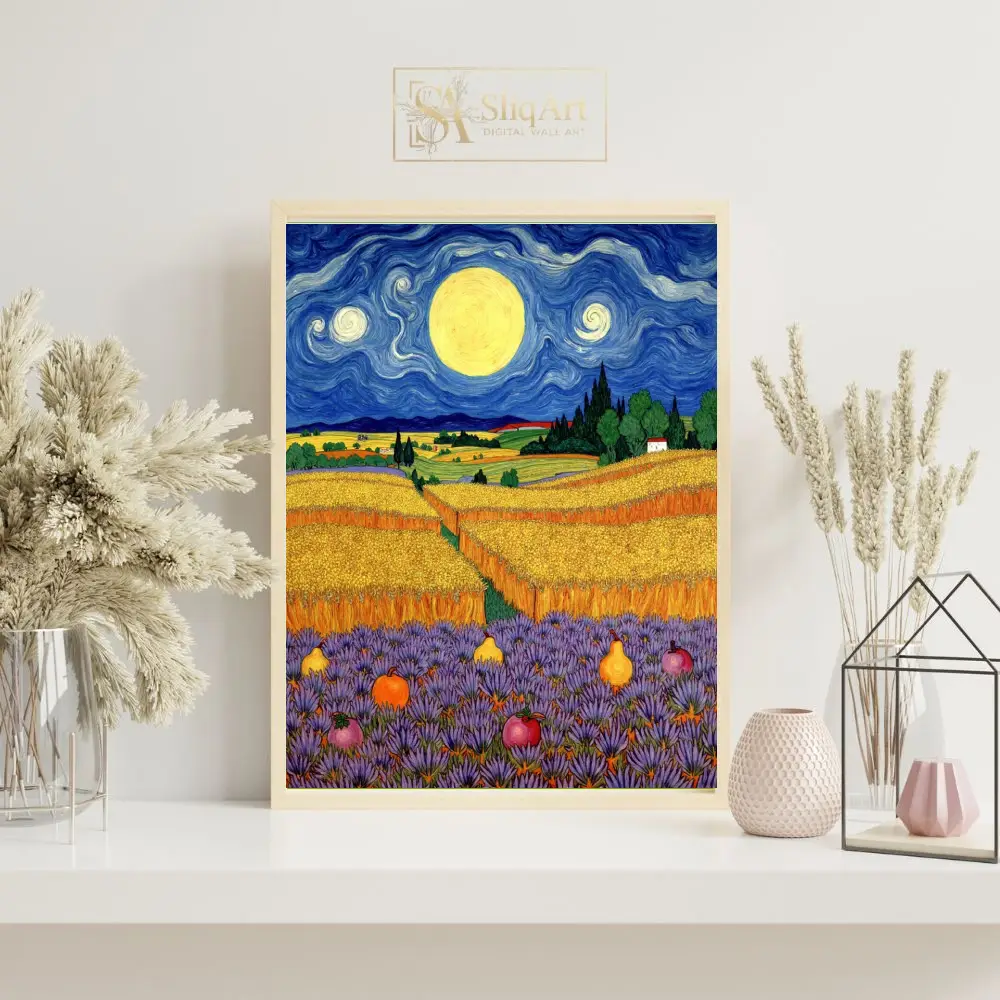 Immerse your space in the mesmerizing beauty of ‘Celestial Harvest,’ a stunning wall art piece that pays homage to the iconic Post-Impressionist movement. This vibrant landscape features a swirling, deep blue night sky dominated by a massive, luminous moon that casts a golden glow over undulating wheat fields.