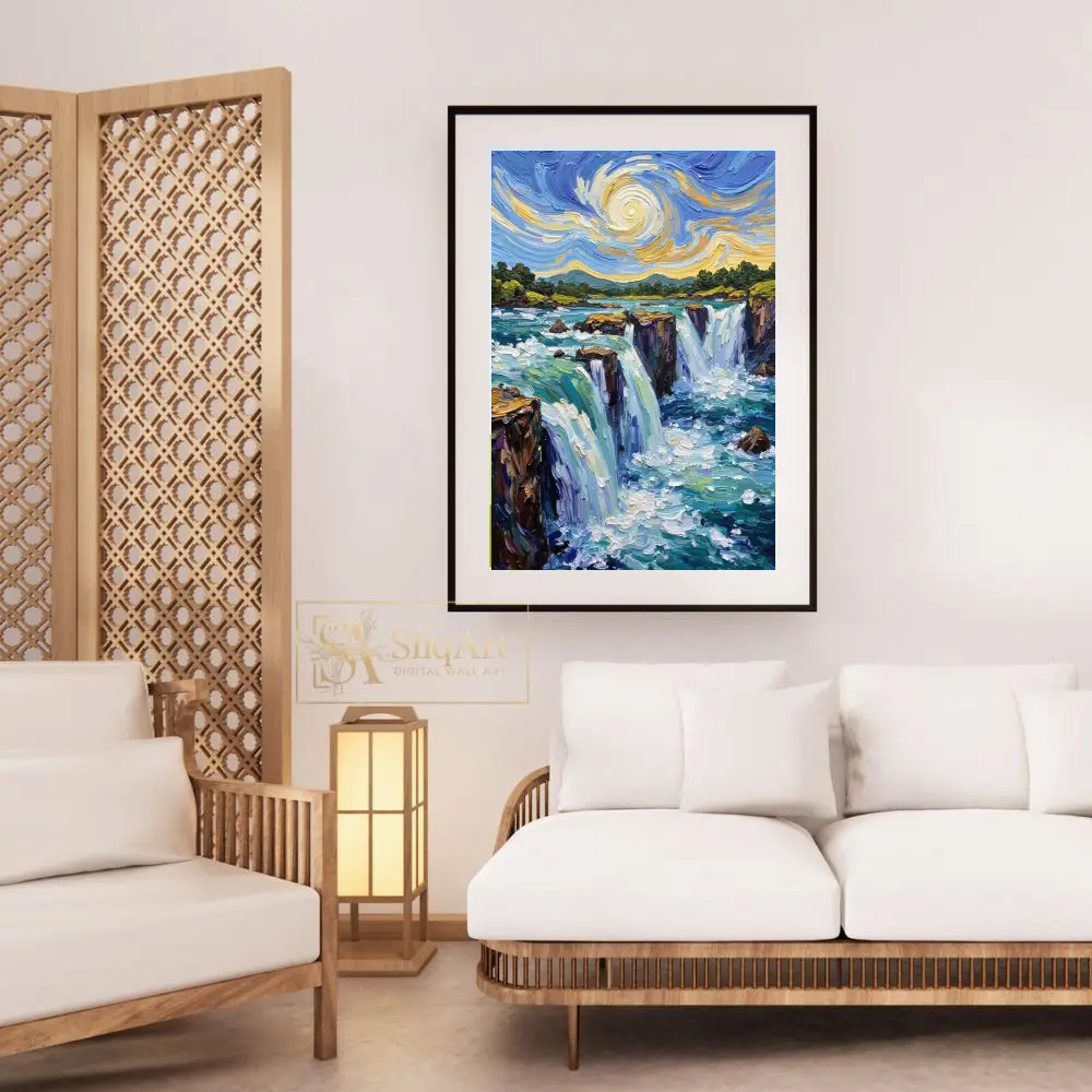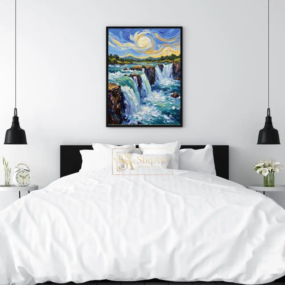 A vibrant and textured impasto landscape featuring a majestic waterfall under a Van Gogh-inspired swirling sky in bold blues and yellows.