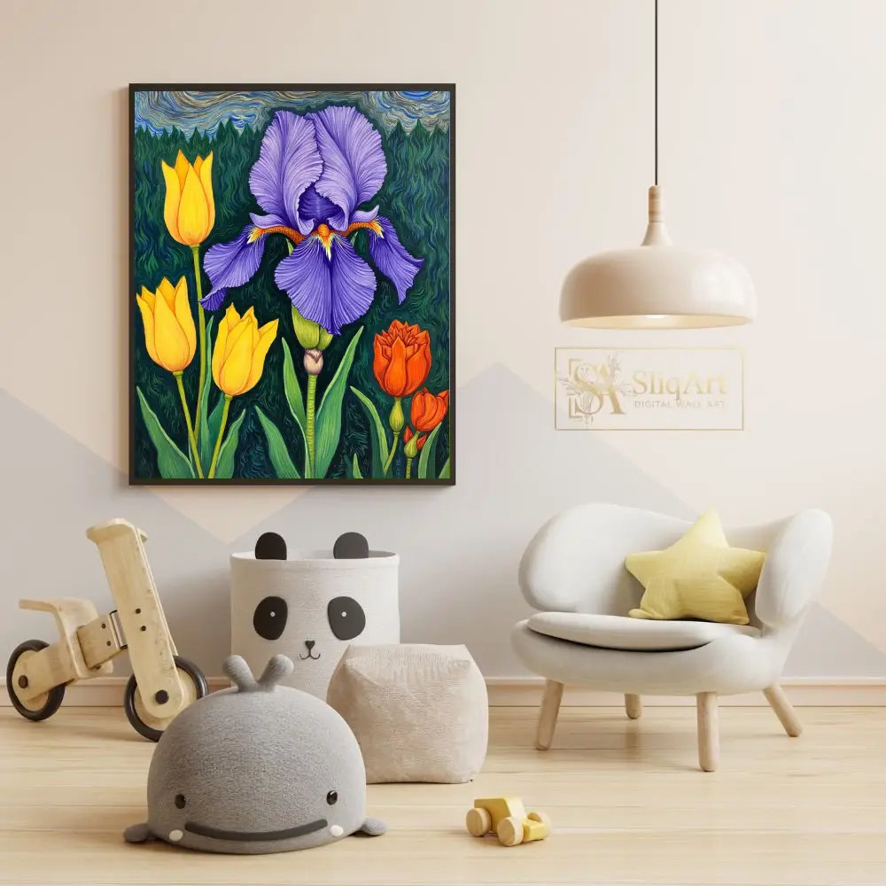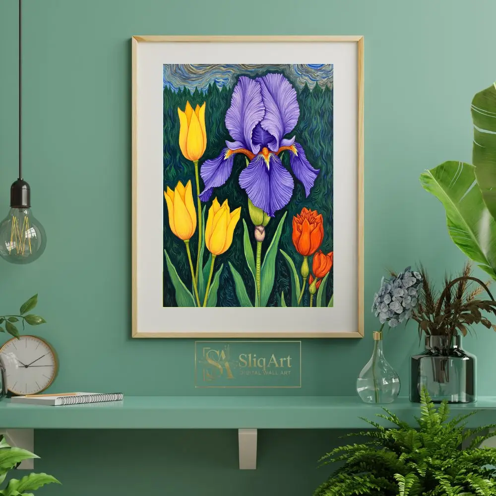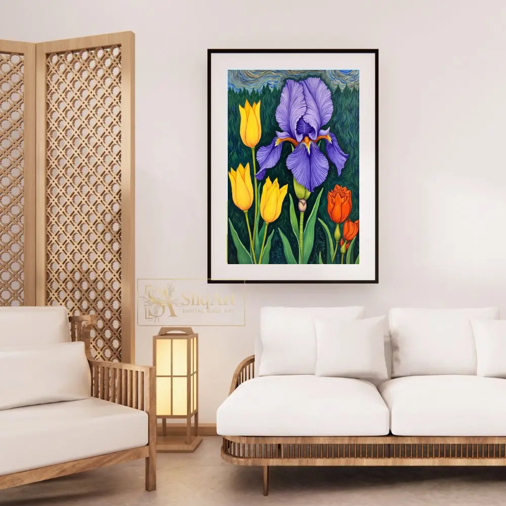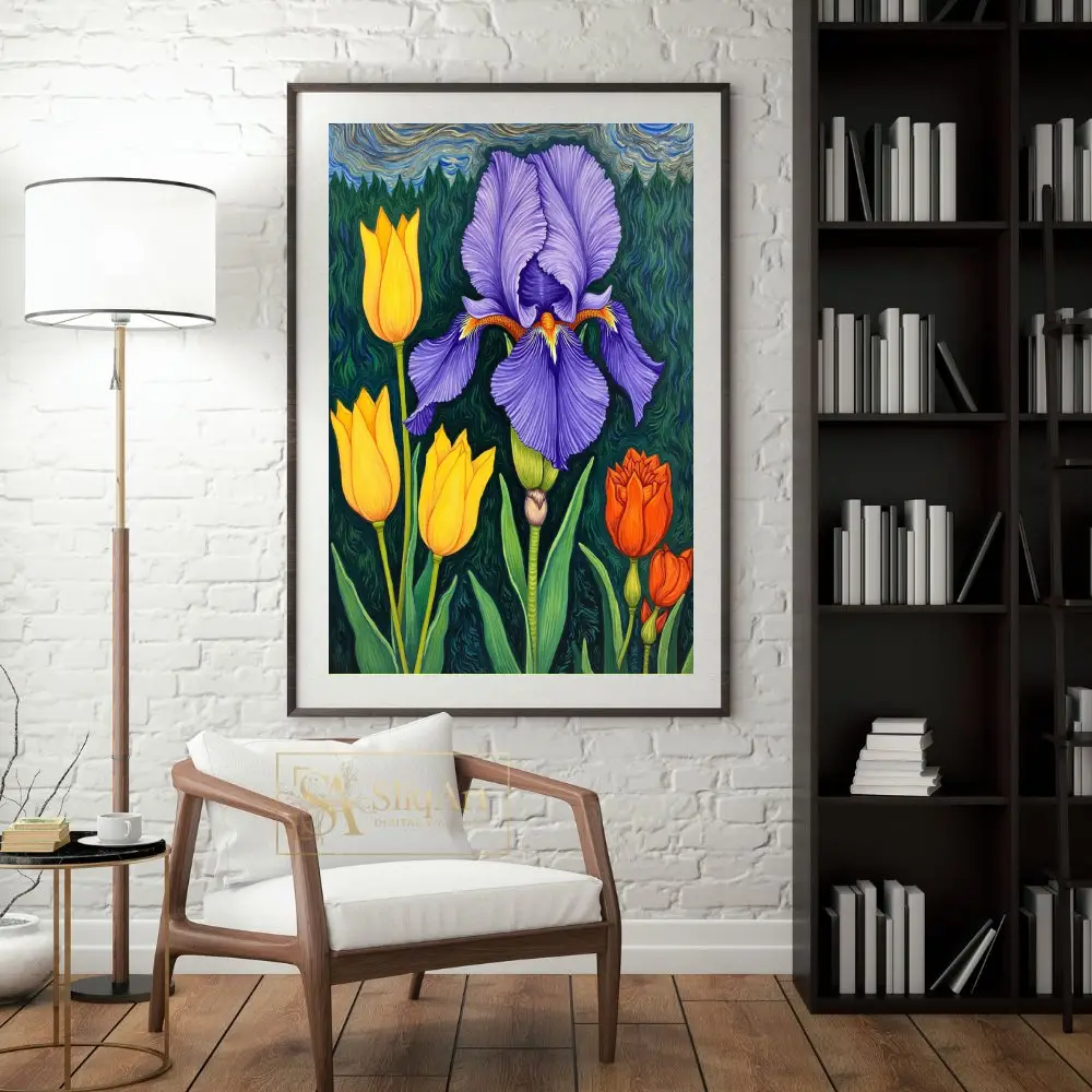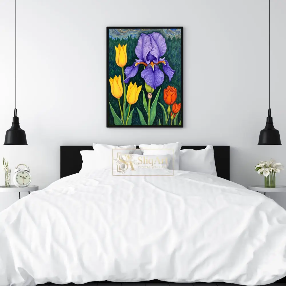 Elevate your interior with this vibrant botanical masterpiece, showcasing a majestic purple iris surrounded by cheerful yellow and orange tulips.